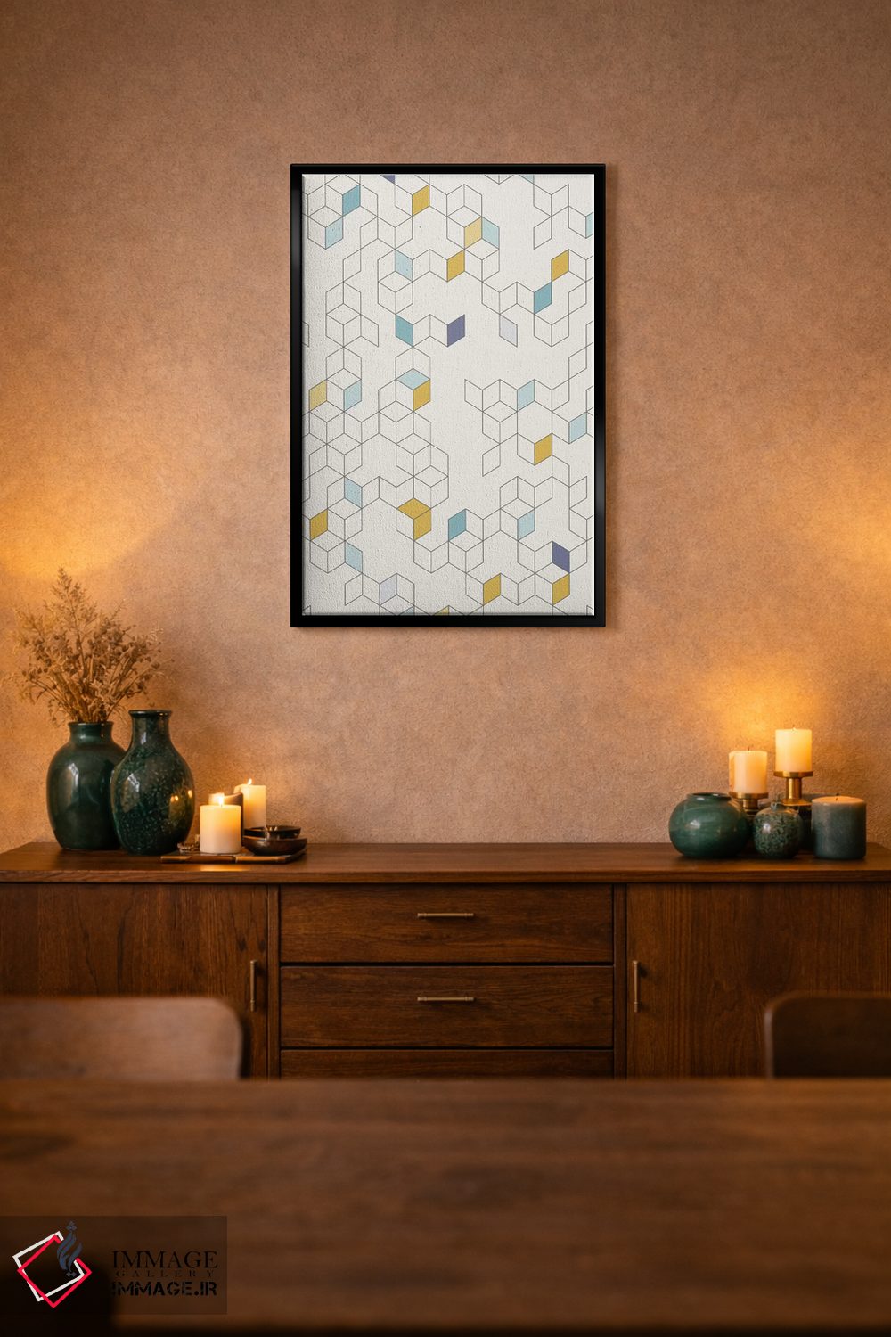 براساس پالت گرم اثر، قاب تیک گرم (چوبی) پیشنهاد اول است و مشکی مات (فریم متوسط) مکمل. برای سفارشهای پروژهای با ابعاد و قابهای اختصاصی با ایماژ در تماس باشید.