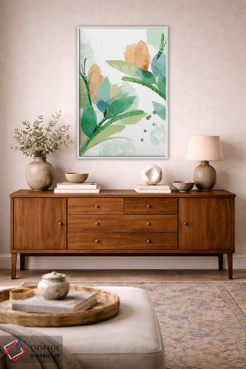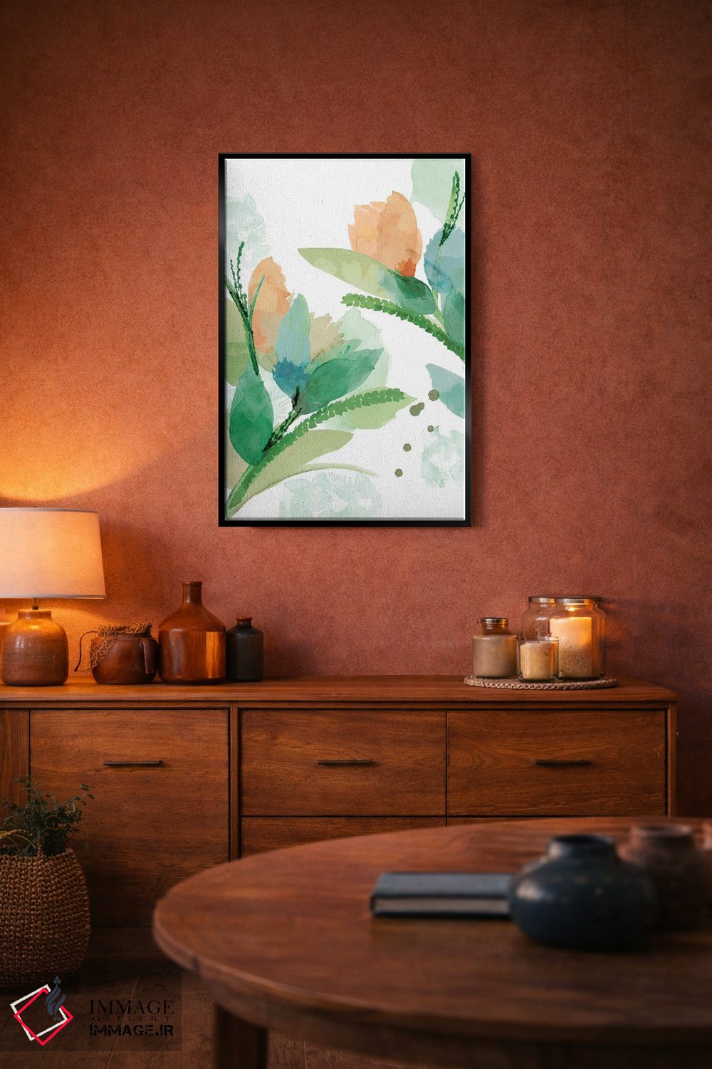 براساس پالت ترکیبی اثر، قاب تیک گرم (چوبی) پیشنهاد اول است و مشکی مات (فریم متوسط) مکمل. برای سفارشهای پروژهای با ابعاد و قابهای اختصاصی با ایماژ در تماس باشید.