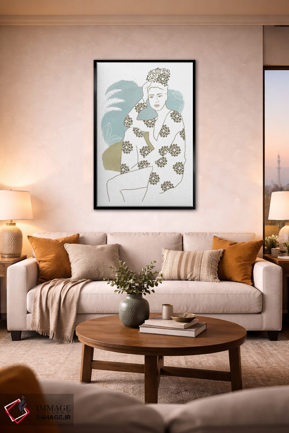 براساس پالت خنثی اثر، قاب بلوط روشن (چوبی) پیشنهاد اول است و استخوانی ملایم مکمل. برای سفارشهای پروژهای با ابعاد و قابهای اختصاصی با ایماژ در تماس باشید.