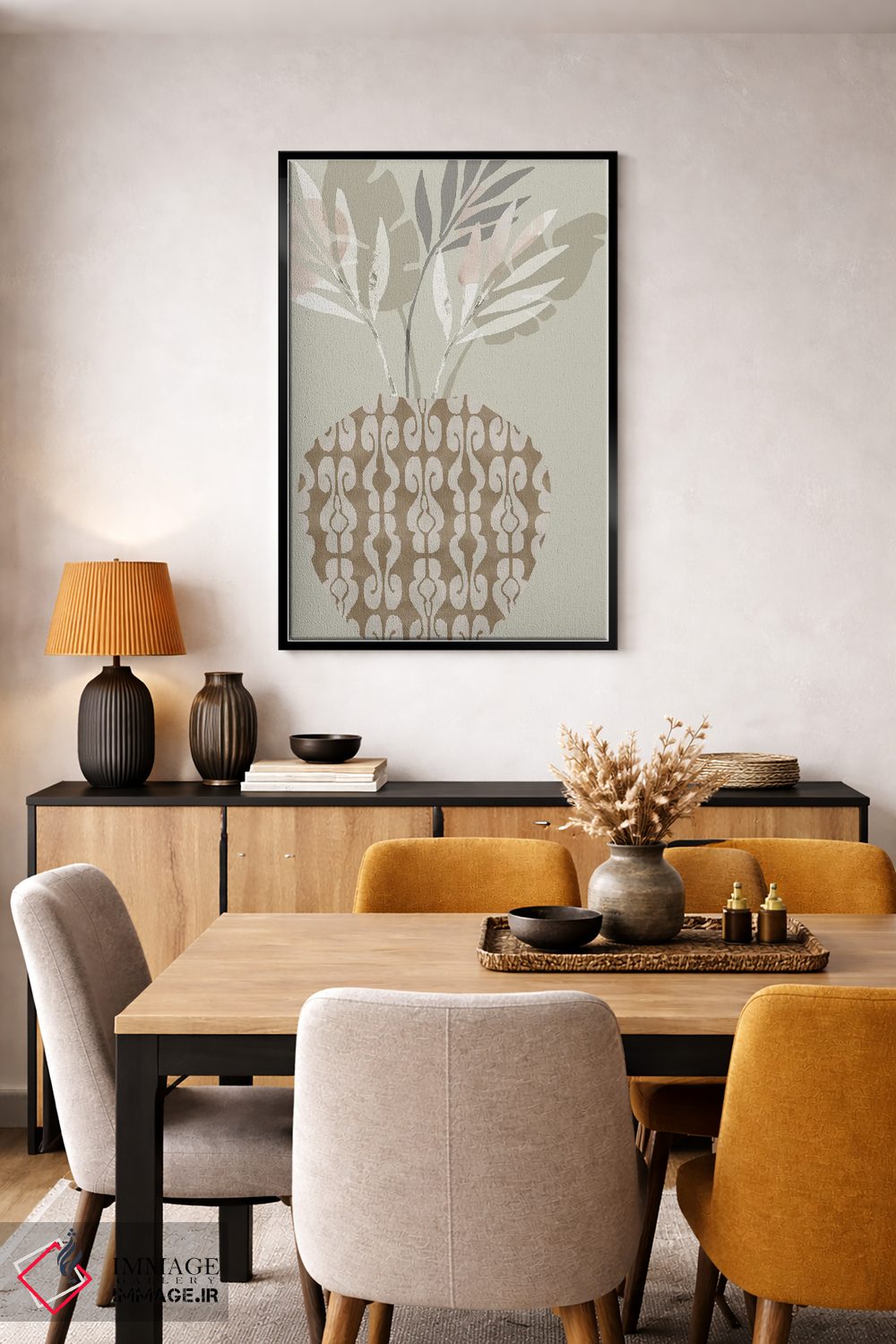 براساس پالت خنثی اثر، قاب بلوط روشن (چوبی) پیشنهاد اول است و استخوانی ملایم مکمل. برای سفارشهای پروژهای با ابعاد و قابهای اختصاصی با ایماژ در تماس باشید.