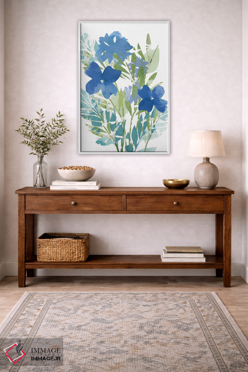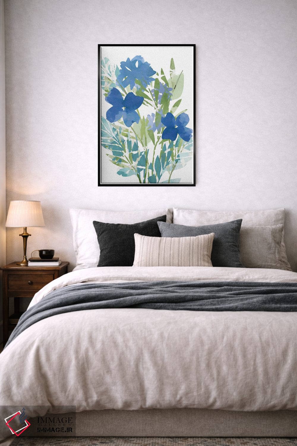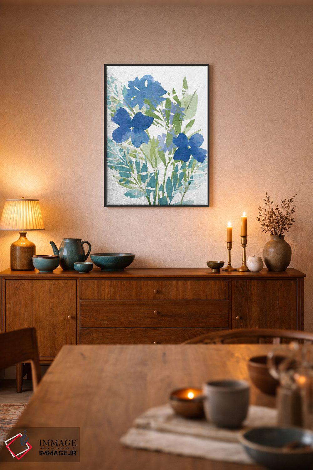 اگر دوست دارید دیوار روشنتر و آرامتر دیده شود، «خشخاشهای آبی ۱» اثرِ «فلورا کوتا» در کنار چوب و پارچههای روشن، عالی مینشیند، برای فضای غذاخوری گزینهٔ مناسبیست. اگر دنبال «زیباییِ بیصدا» هستید، این اثر همان حس را دارد.