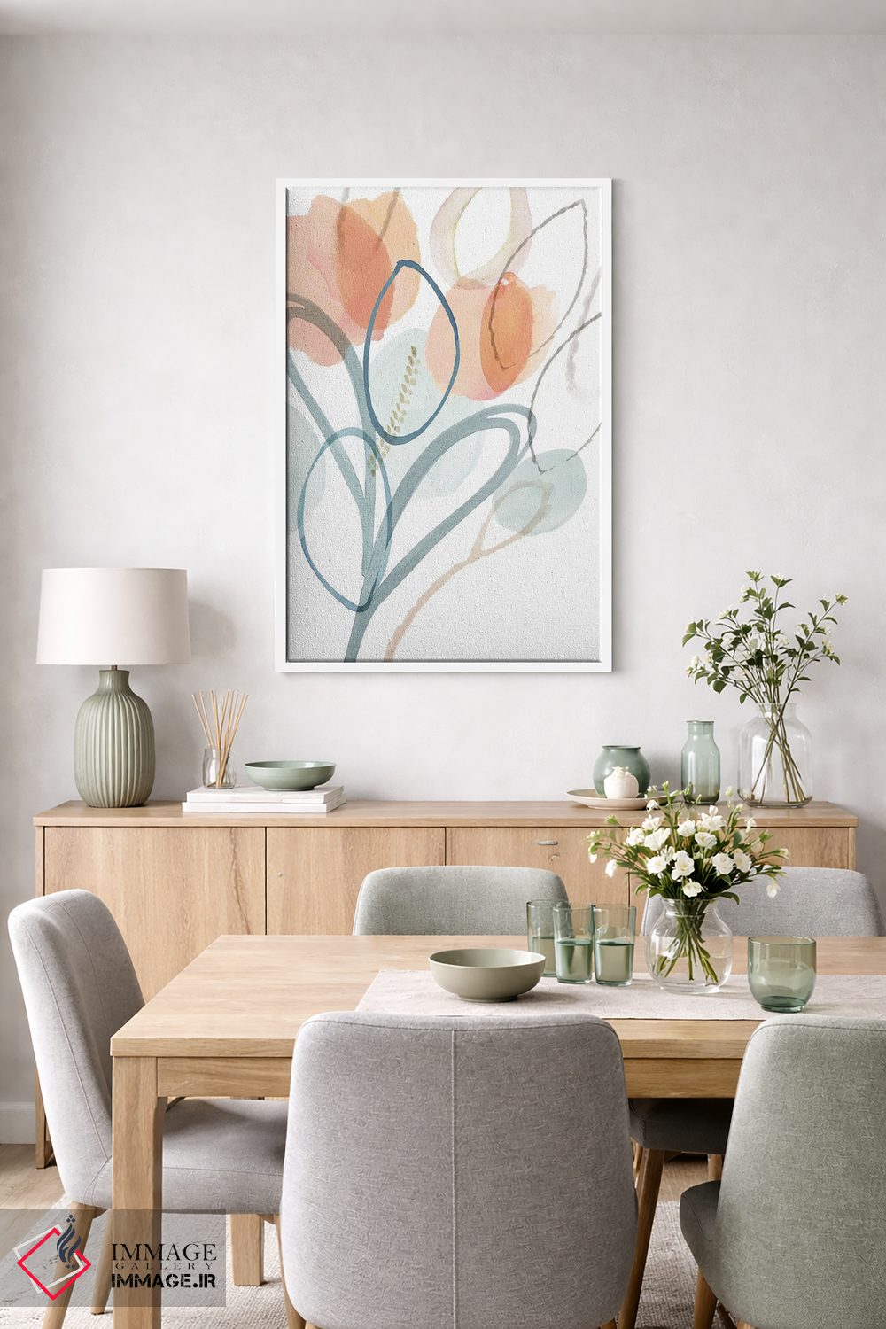 براساس پالت گرم اثر، قاب بلوط روشن (چوبی) پیشنهاد اول است و استخوانی ملایم مکمل. برای سفارشهای پروژهای با ابعاد و قابهای اختصاصی با ایماژ در تماس باشید.