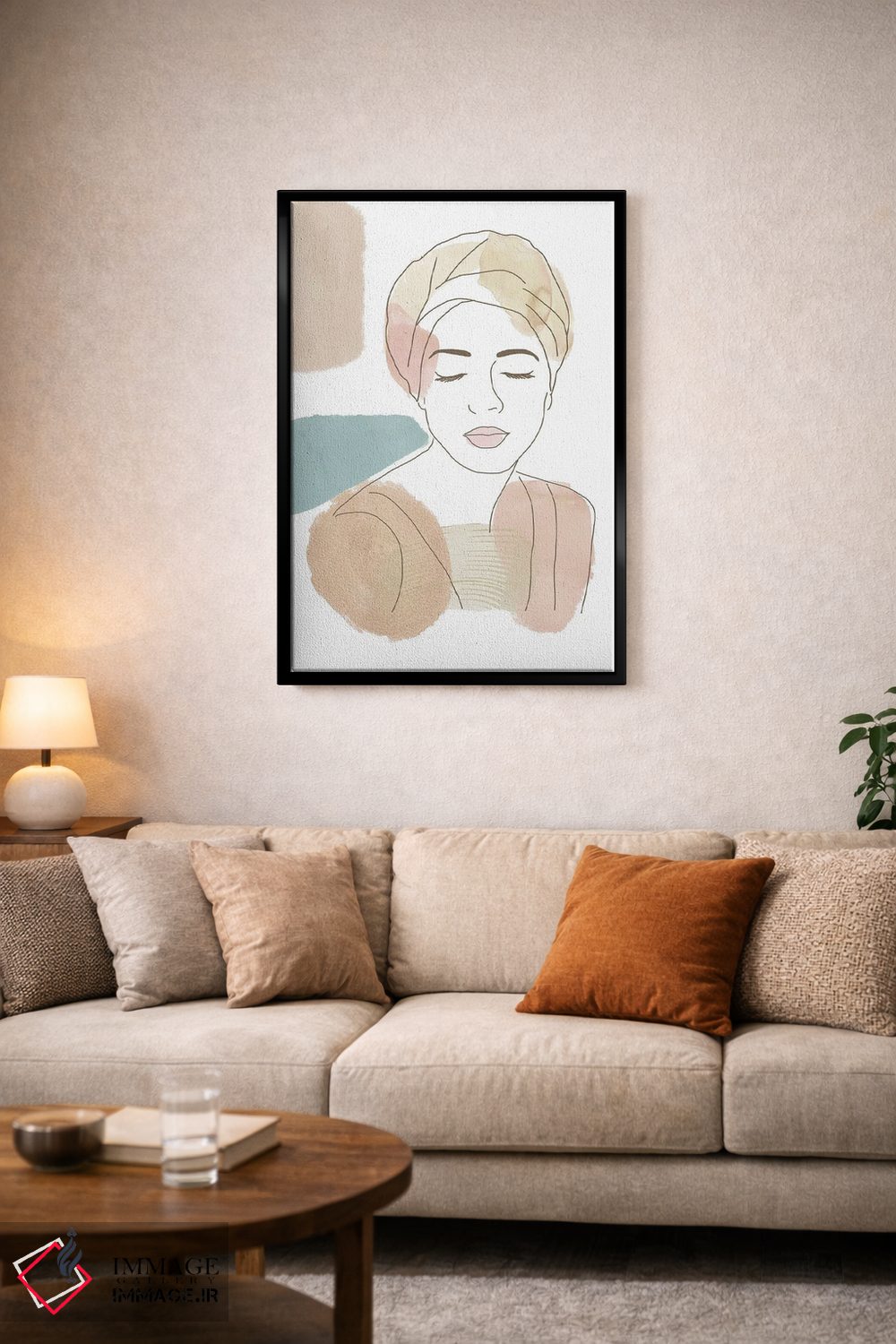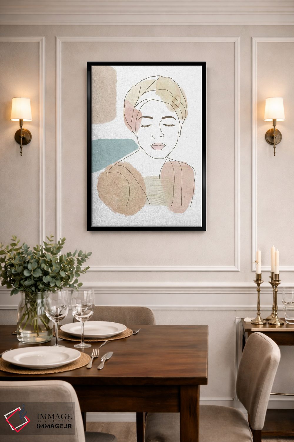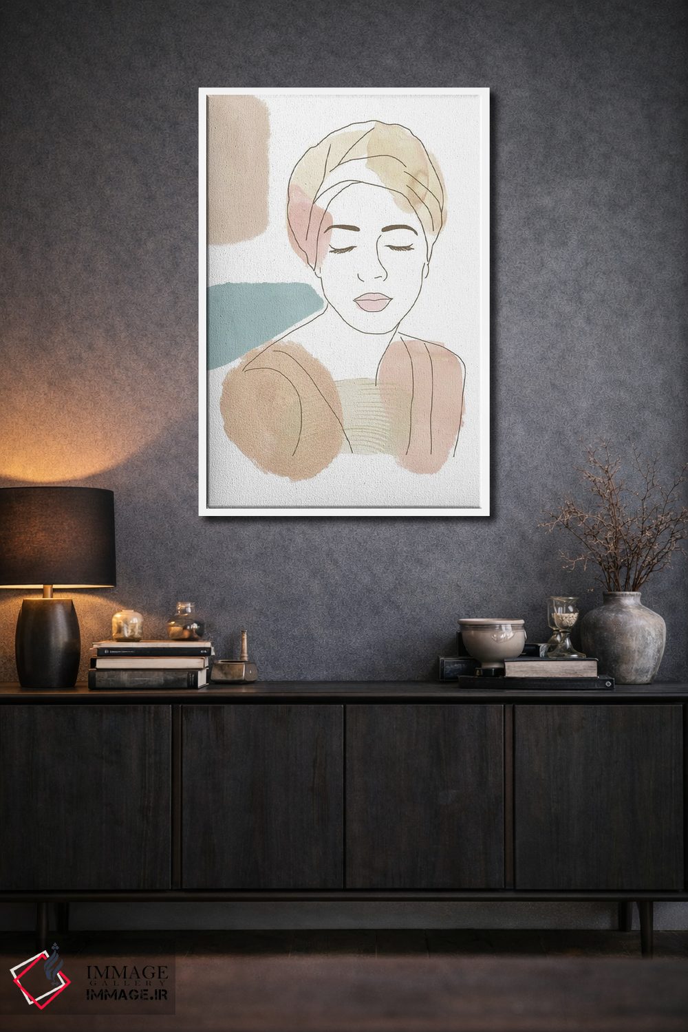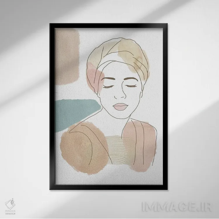 براساس پالت گرم اثر، قاب بلوط روشن (چوبی) پیشنهاد اول است و استخوانی ملایم مکمل. برای سفارشهای پروژهای با ابعاد و قابهای اختصاصی با ایماژ در تماس باشید.
