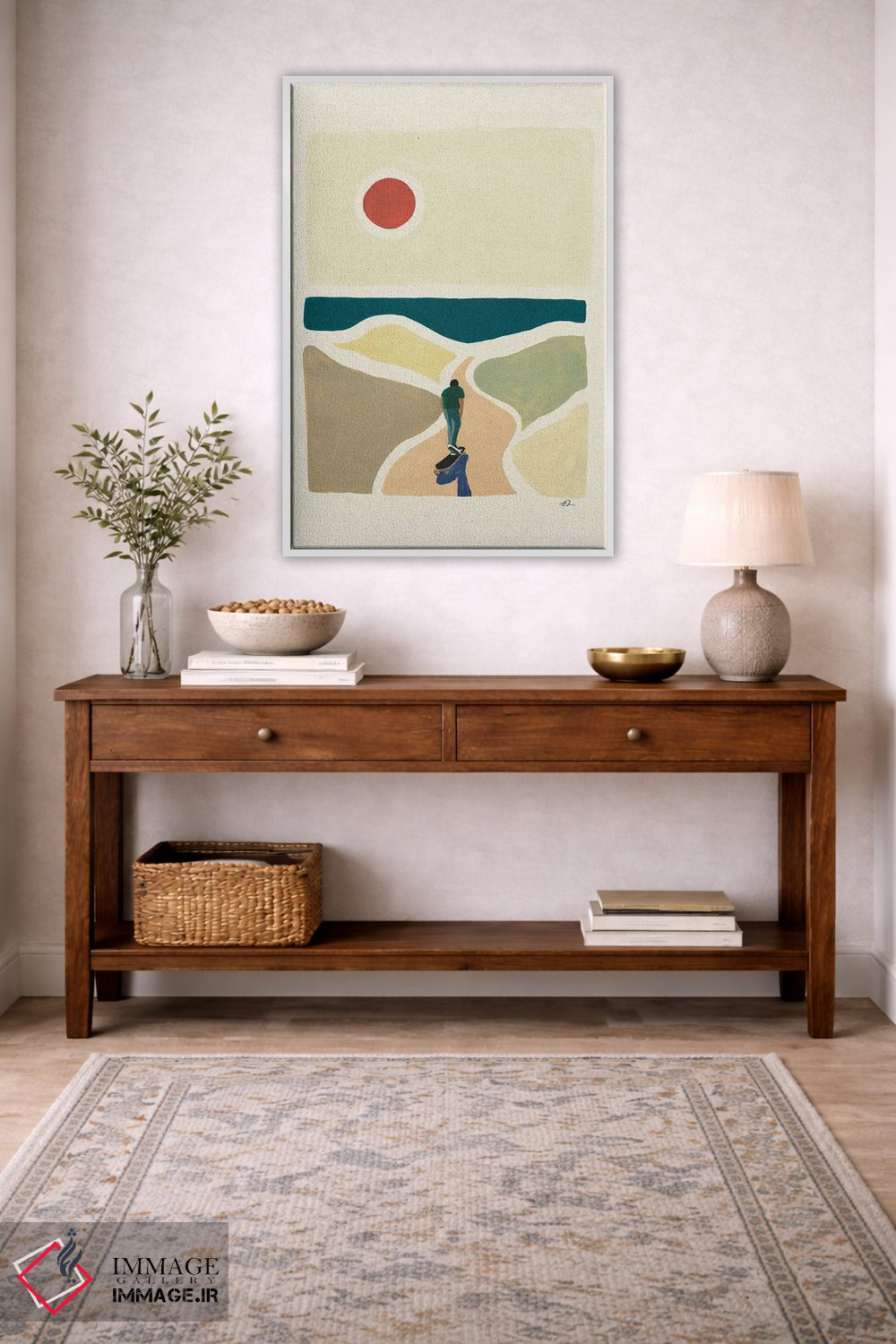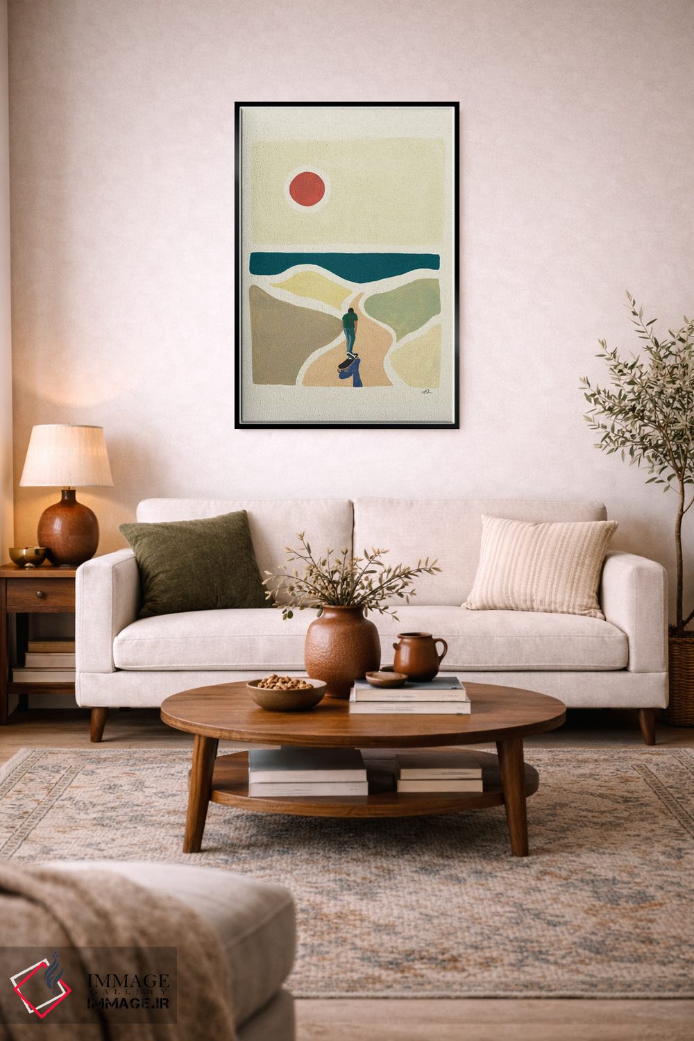 اگر ابعاد دیوار را دارید، با ایماژ از طریق تماس—با—ما/">تماس با ما در ارتباط باشید تا تصمیم سریعتر شود. اگر انتخابتان این است که اثر در فضا «گرم و صمیمی» دیده شود، یک اکسنت رنگی کوچک کافی است و جلوهی گالریوار بیشتری میدهد.