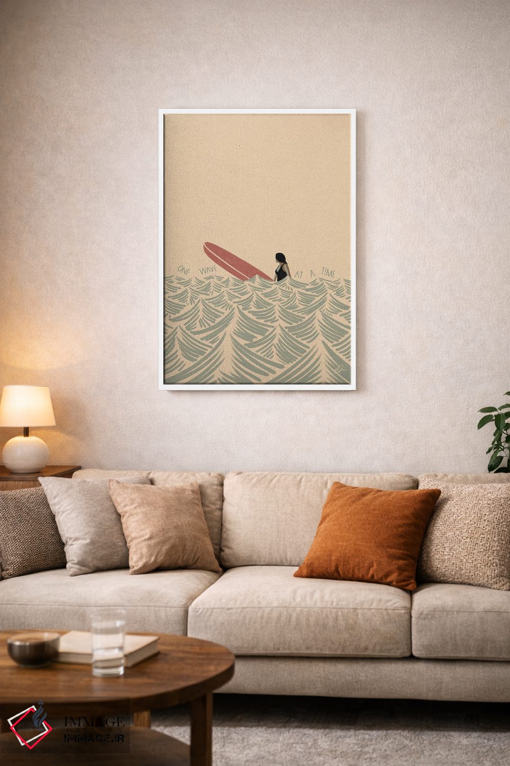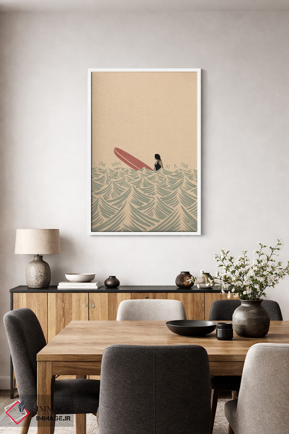 براساس پالت گرم اثر، قاب بلوط روشن (چوبی) پیشنهاد اول است و استخوانی ملایم مکمل. برای سفارشهای پروژهای با ابعاد و قابهای اختصاصی با ایماژ در تماس باشید.