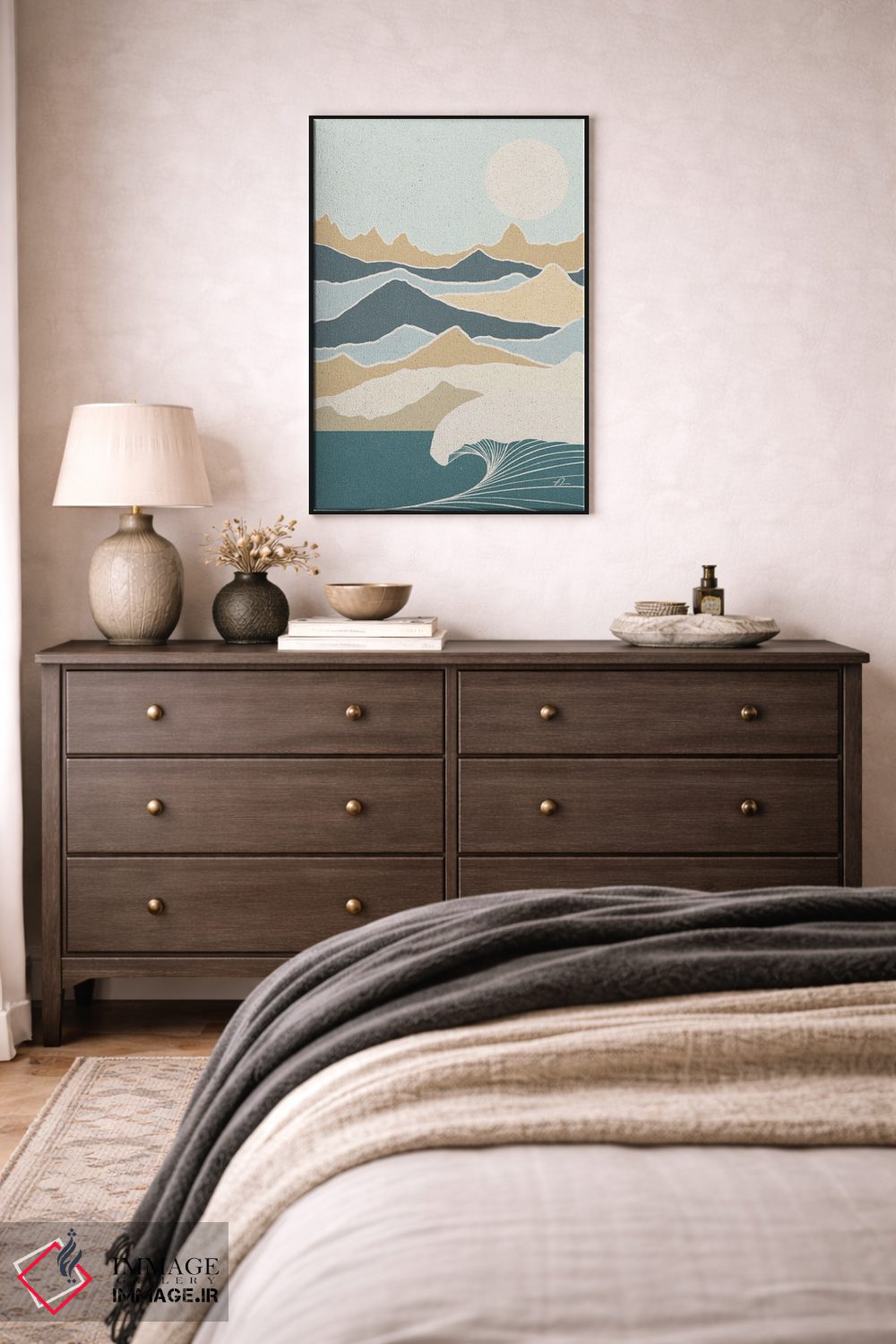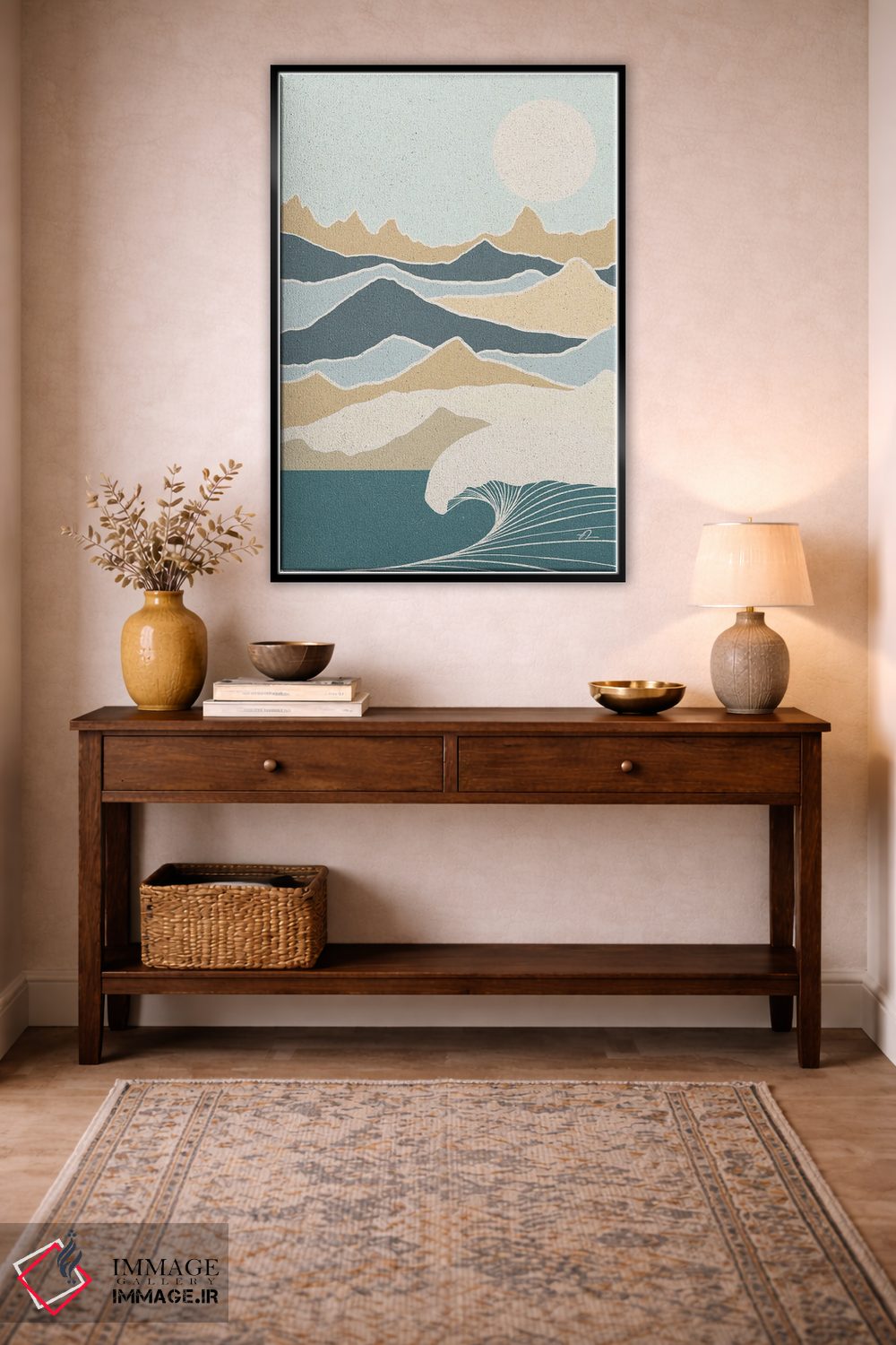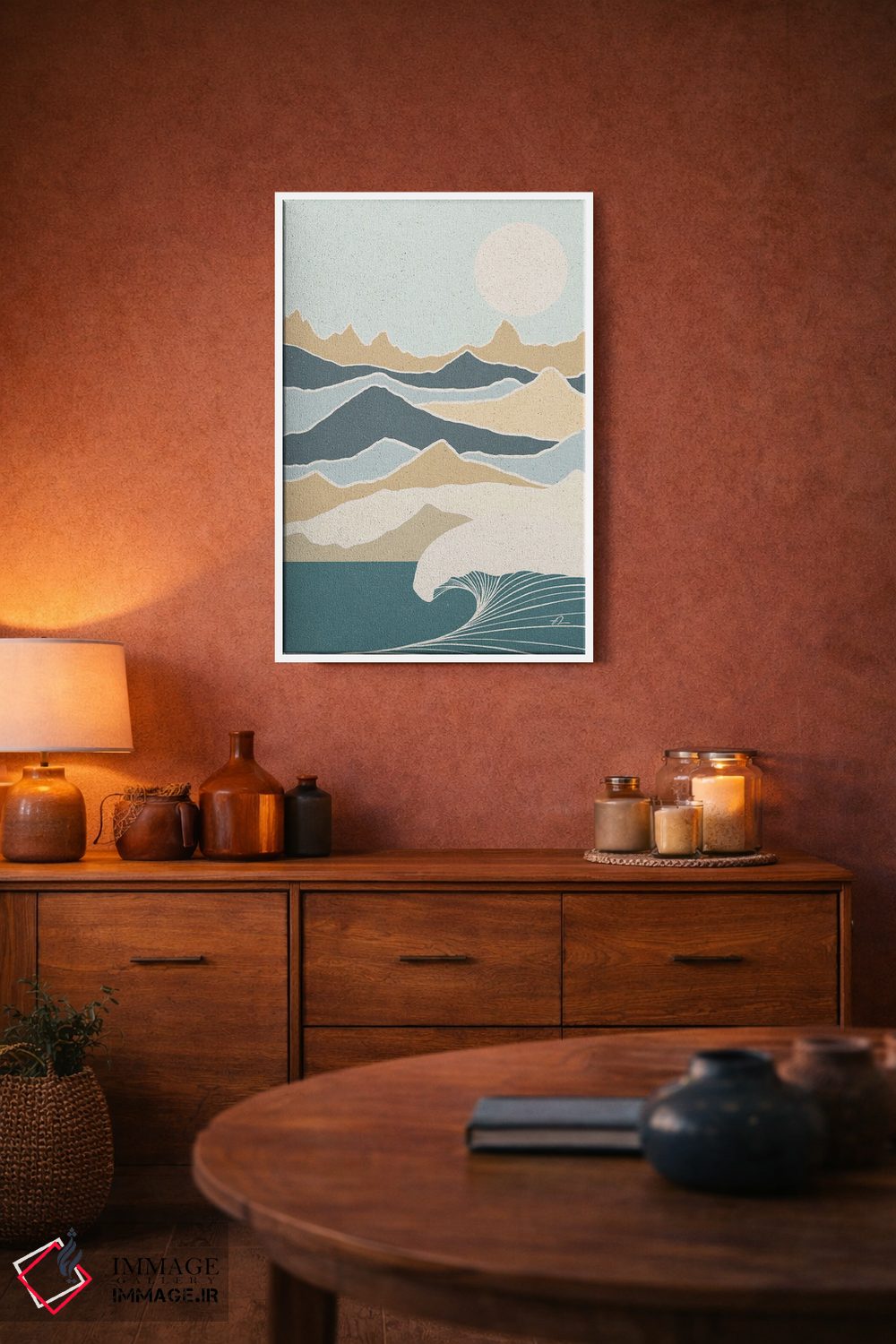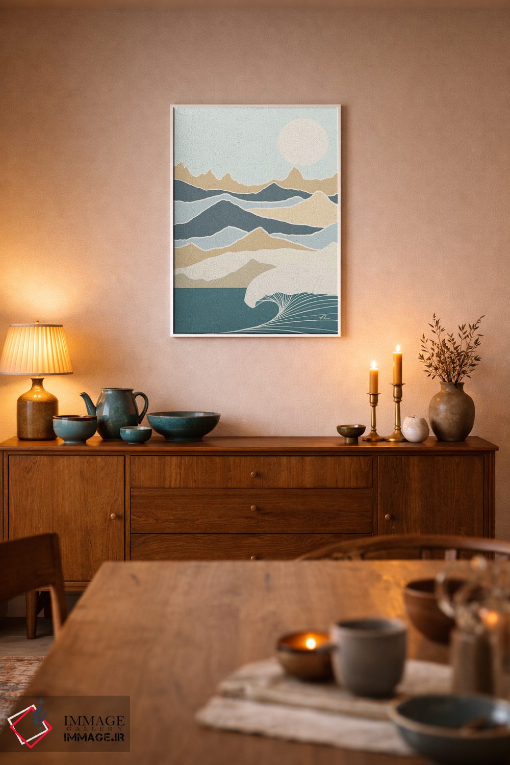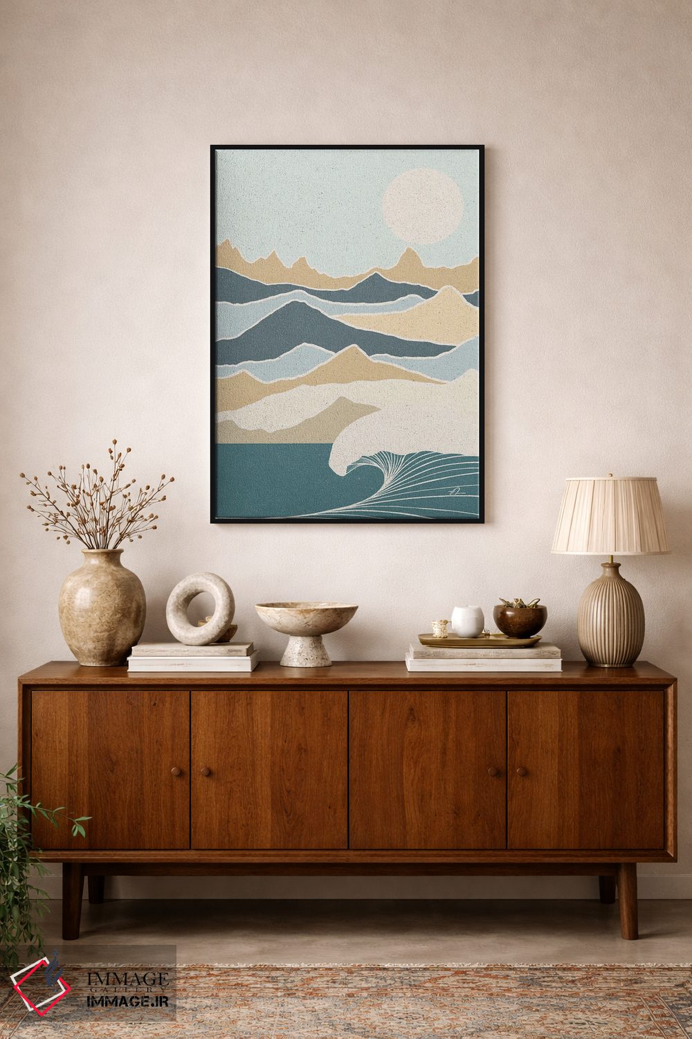 براساس پالت سرد اثر، قاب بلوط روشن (چوبی) پیشنهاد اول است و استخوانی ملایم مکمل. برای سفارشهای پروژهای با ابعاد و قابهای اختصاصی با ایماژ در تماس باشید.