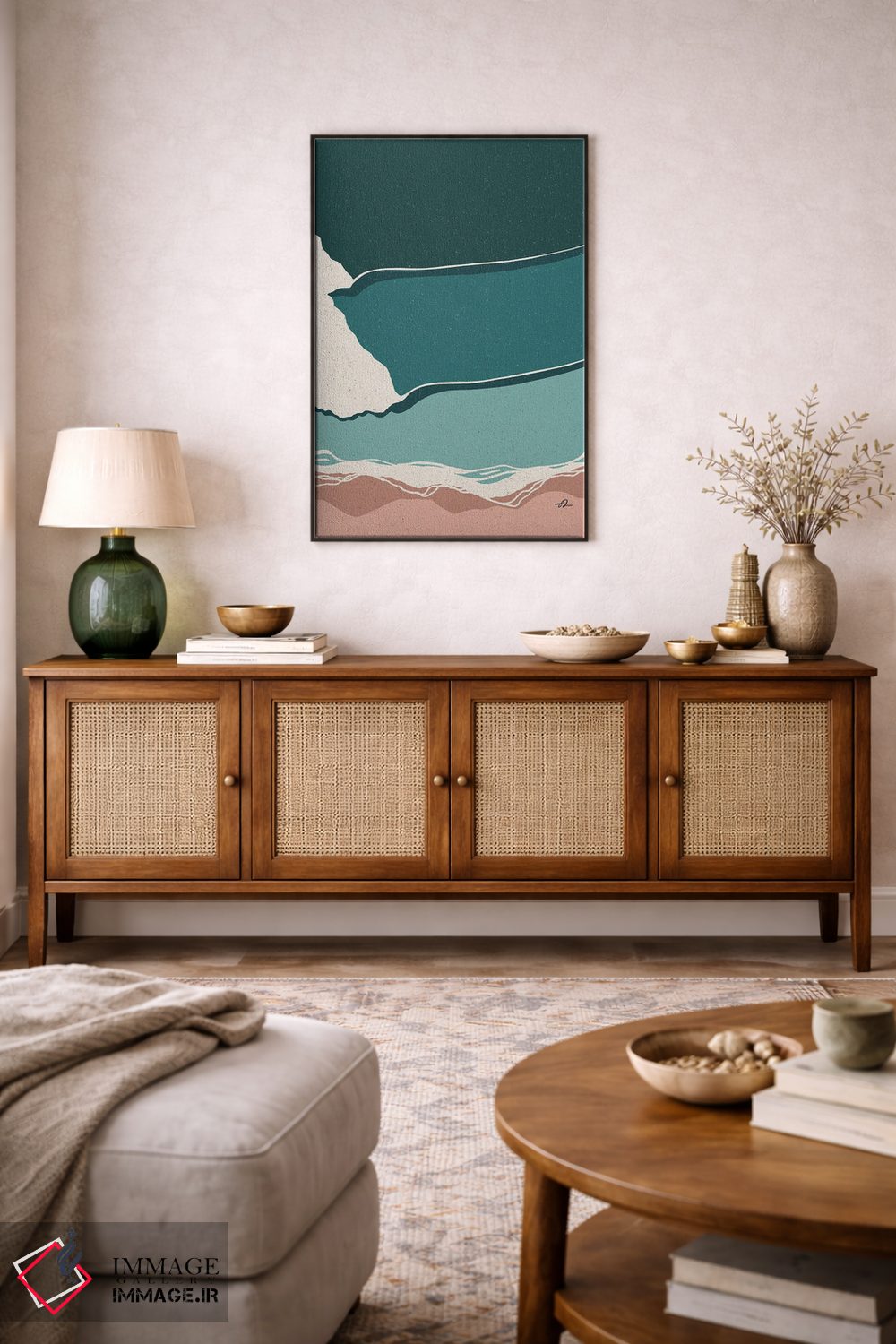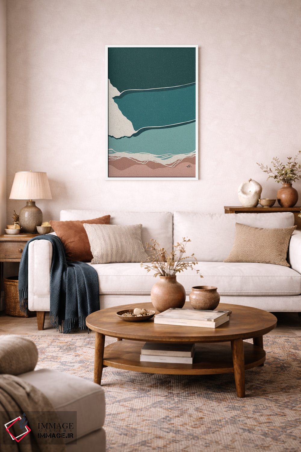 «دیدگاه» اثرِ «فابیان لاواتر» با حالوهوای این اثر و لحنِ دکور ساحلی، فضا را روشنتر و سبکتر نشان میدهد—مناسبِ نشیمنهای آفتابگیر.