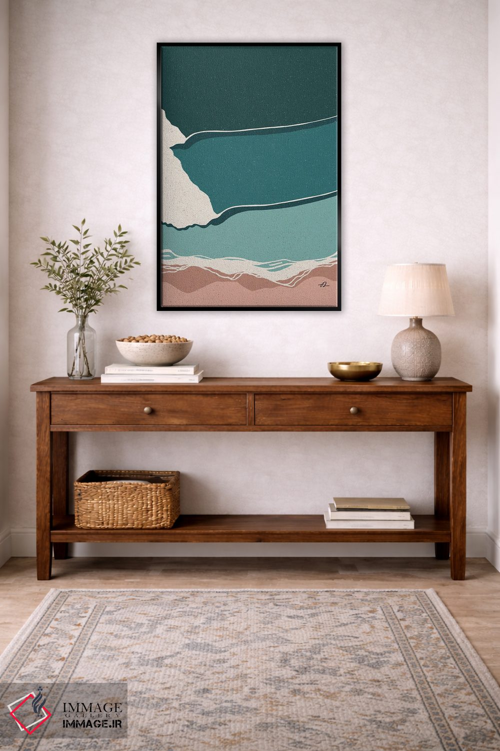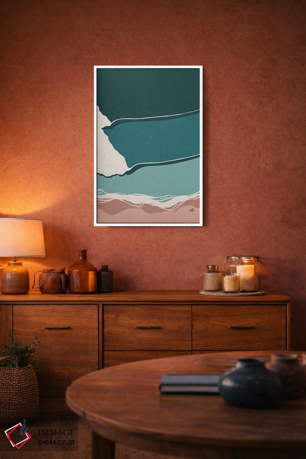 براساس پالت ترکیبی اثر، قاب تیک گرم (چوبی) پیشنهاد اول است و مشکی مات (فریم متوسط) مکمل. برای سفارشهای پروژهای با ابعاد و قابهای اختصاصی با ایماژ در تماس باشید.
