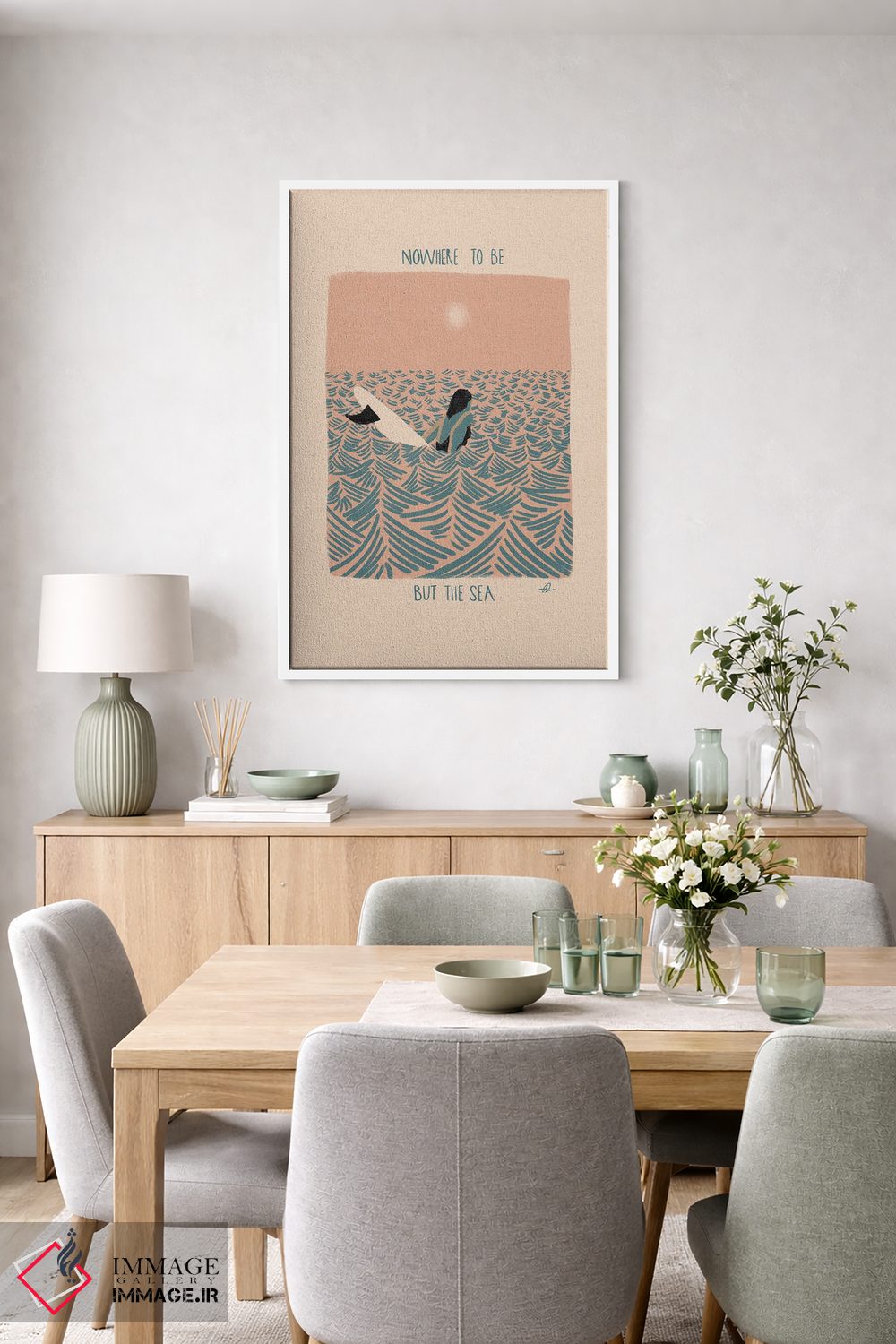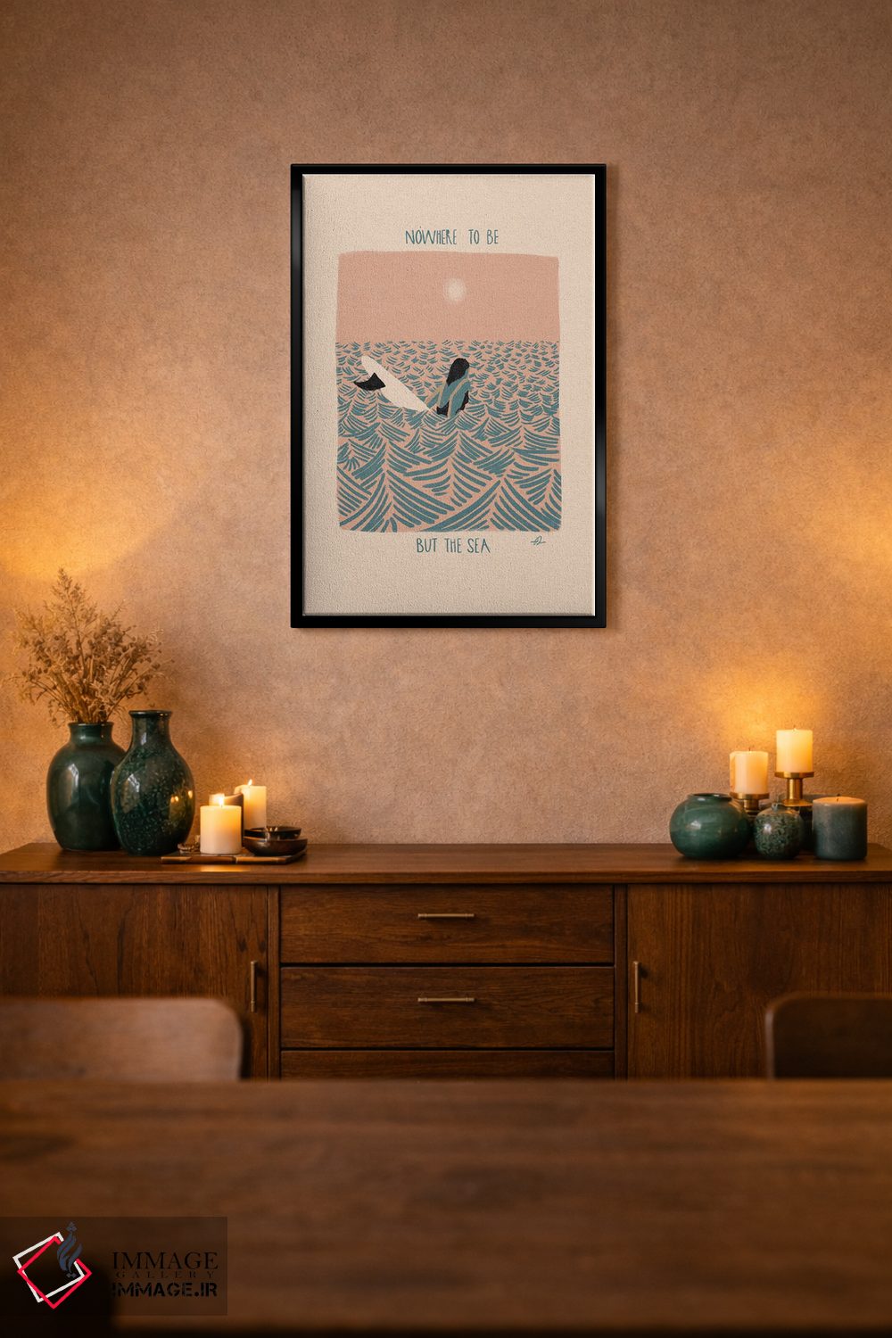 براساس پالت گرم اثر، قاب بلوط روشن (چوبی) پیشنهاد اول است و استخوانی ملایم مکمل. برای سفارشهای پروژهای با ابعاد و قابهای اختصاصی با ایماژ در تماس باشید.