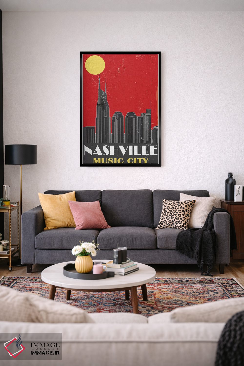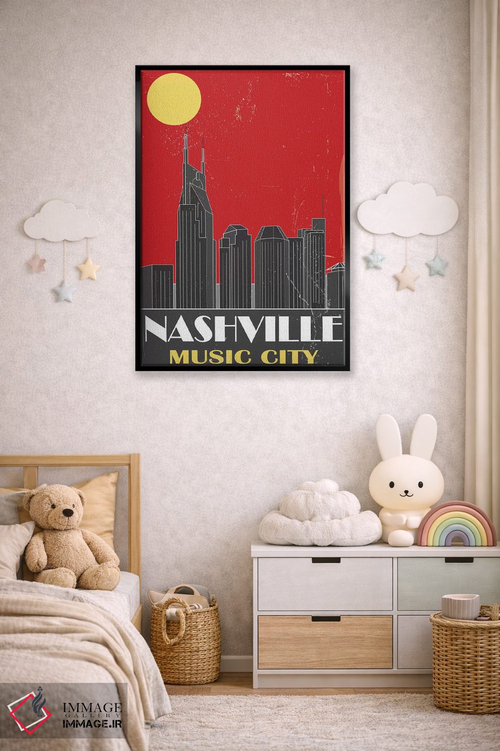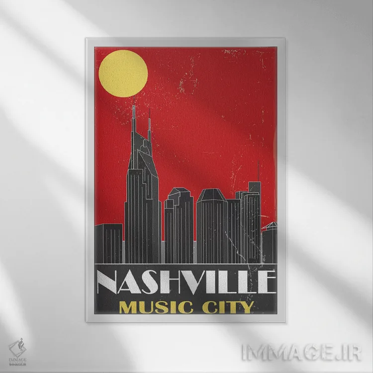 اگر دیوارِ راهرو یا گوشهی مطالعه نیاز به یک قاب خوشانرژی دارد، «نشویل، قرمز» اثرِ «فلای گرافیکس (استودیو/برند هنری)» با تم این اثر گزینهی مناسبی است.