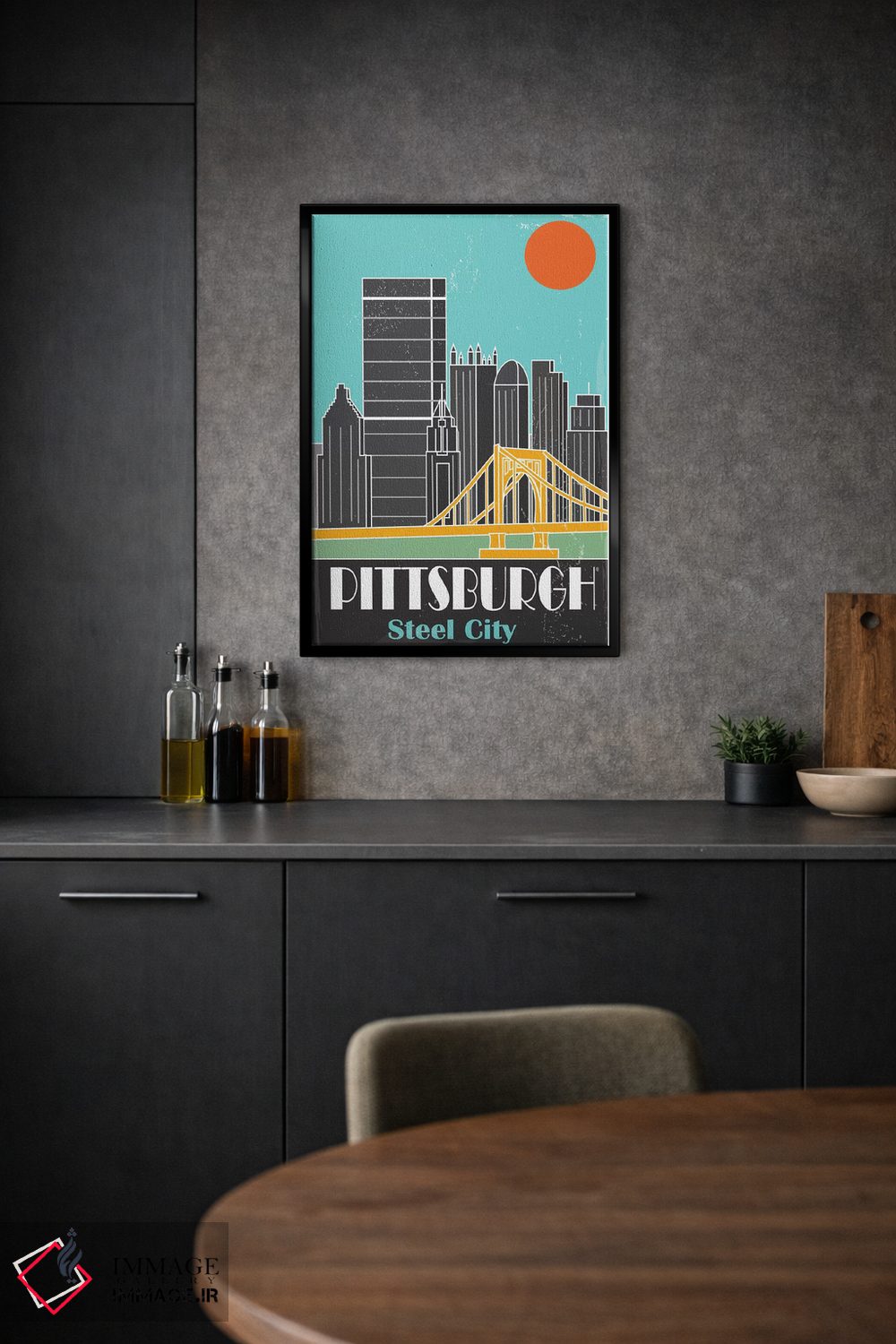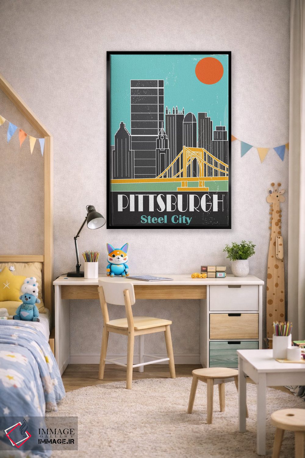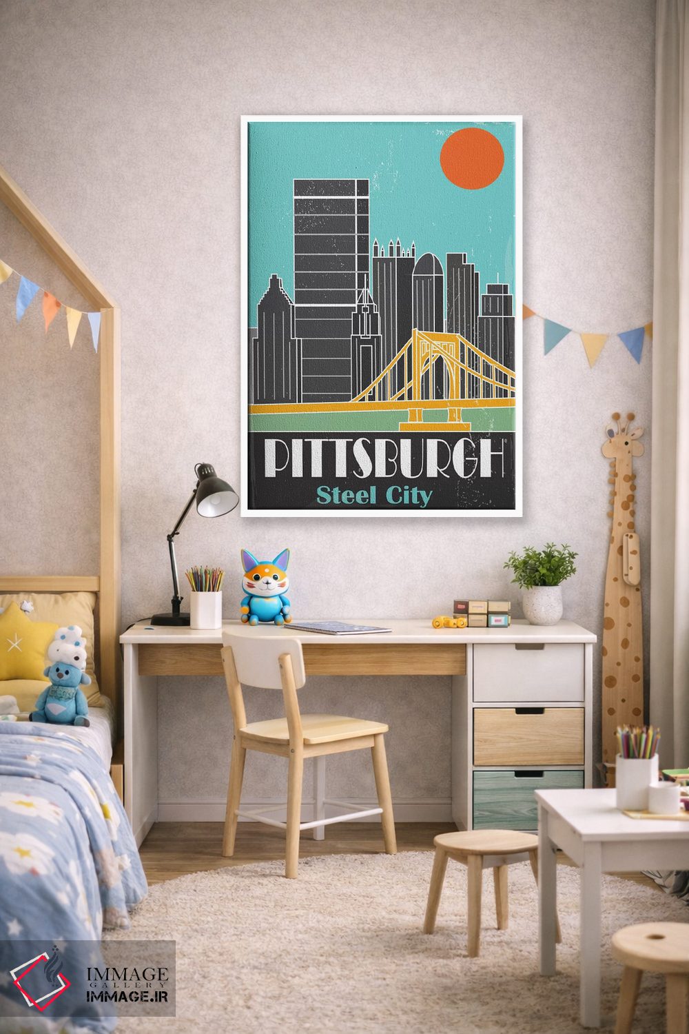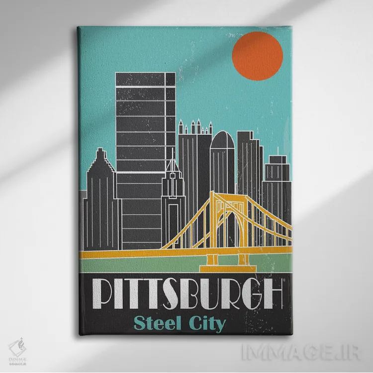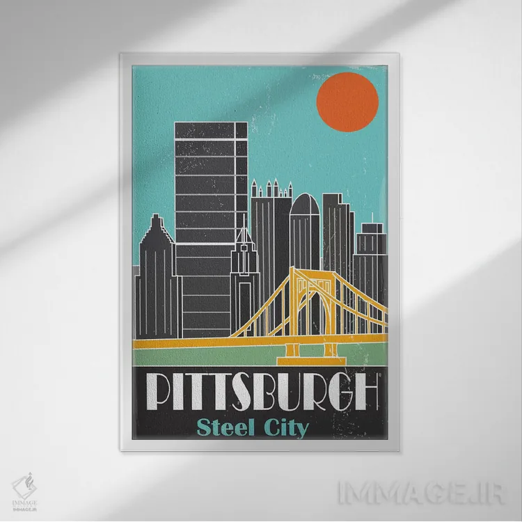 «پیتزبورگ، آبی آسمانی I» اثرِ «فلای گرافیکس (استودیو/برند هنری)» با موضوعِ این اثر، یک نقطهٔ آرام برای چشم میسازد—و با پرداختی هنری خیلی خوشنشین است.