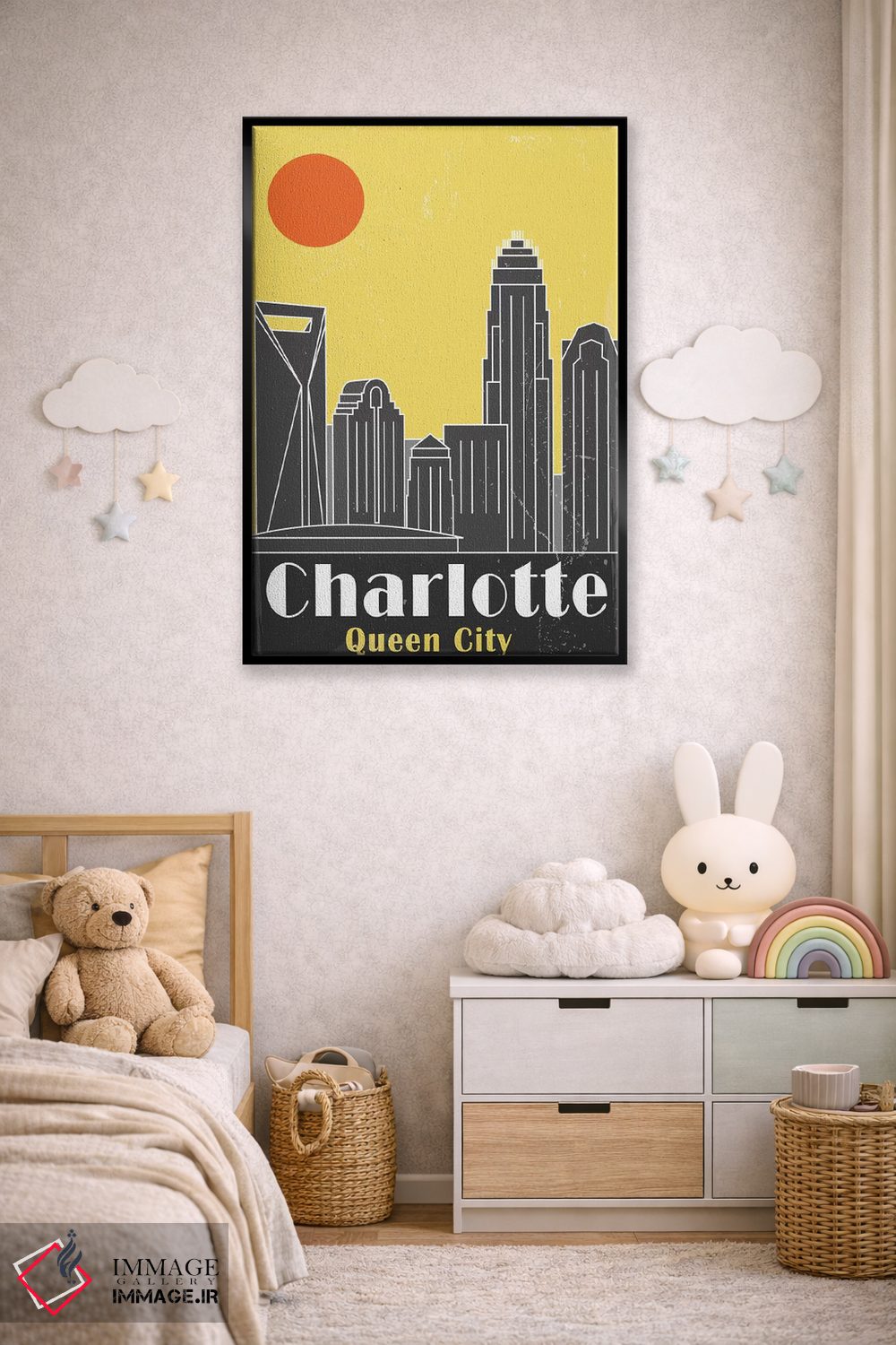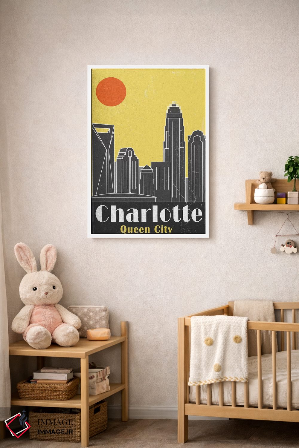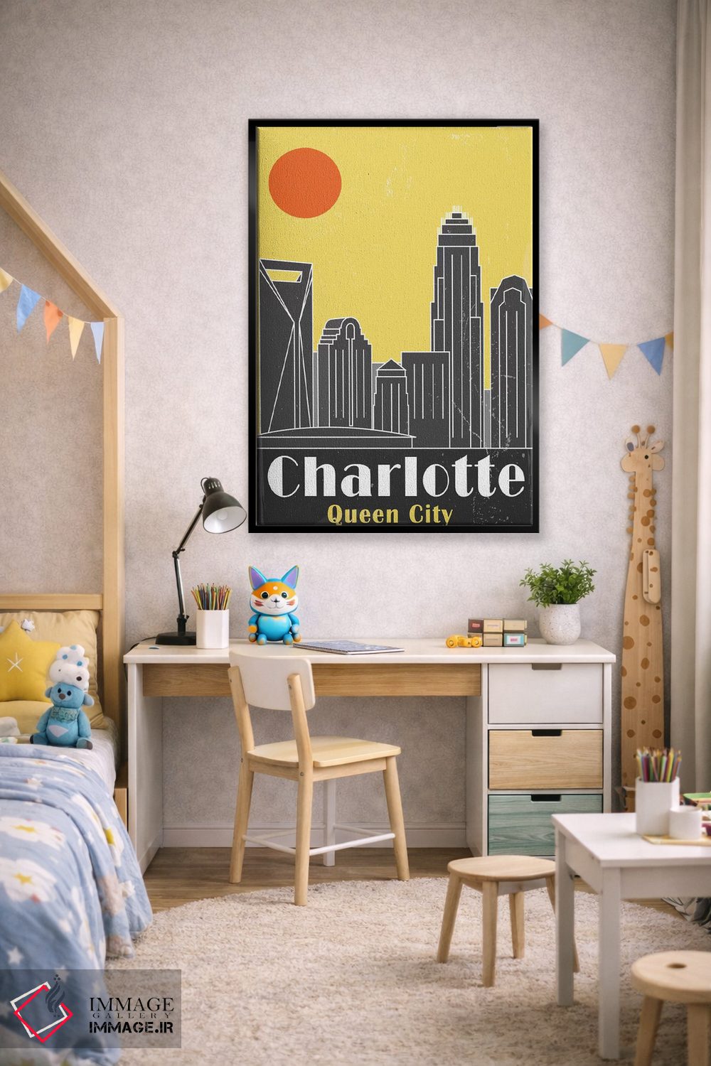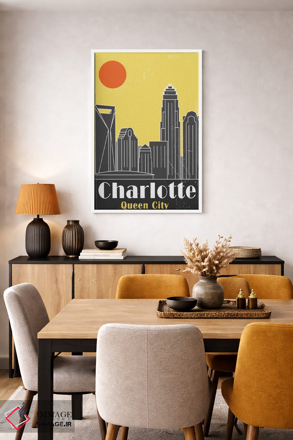 «شارلوت، زرد» اثرِ «فلای گرافیکس (استودیو/برند هنری)» با حالوهوای این اثر، برای بالای کنسول یا کنار قابهای ساده، ترکیب چشمنوازی میسازد.