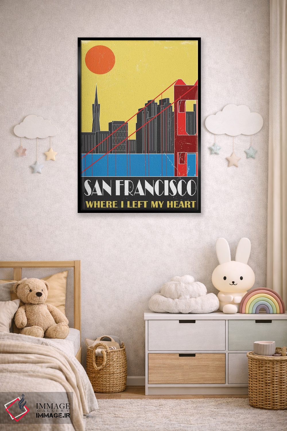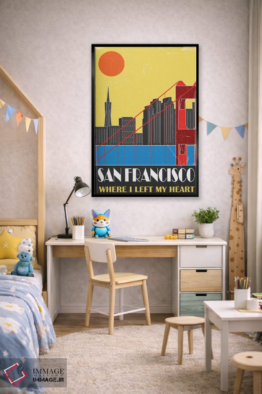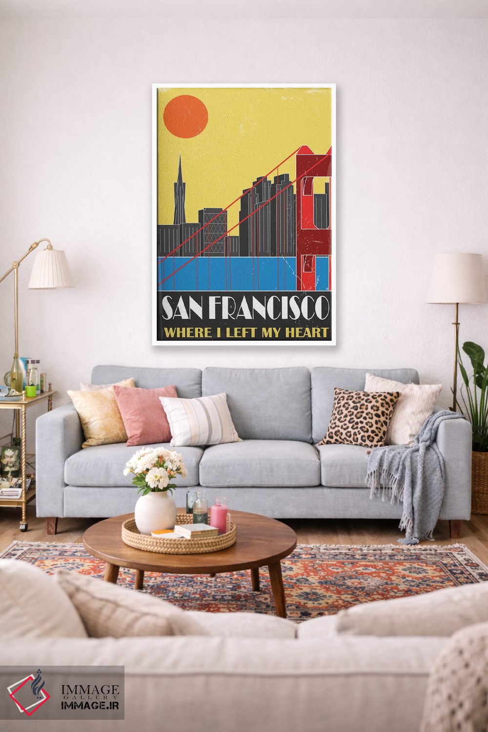 «سان فرانسیسکو، زرد» اثرِ «فلای گرافیکس (استودیو/برند هنری)» با حالوهوای این اثر و اجرای هنری، به فضا لطافت میدهد و برای کنار چوب روشن یا دیوارهای خنثی عالی مینشیند.