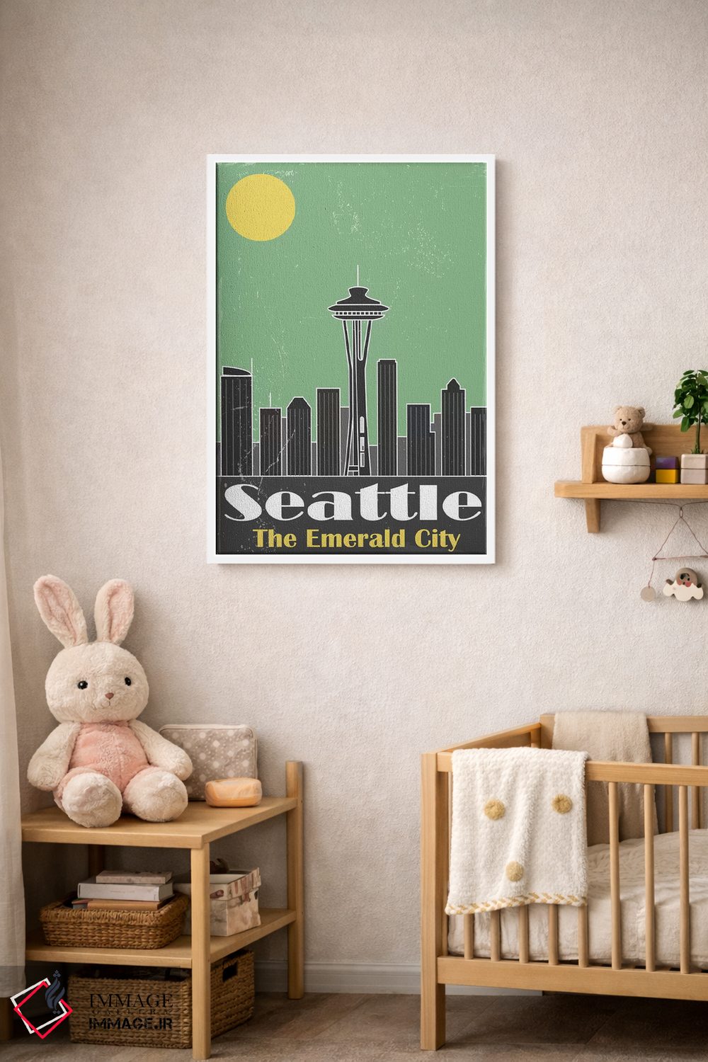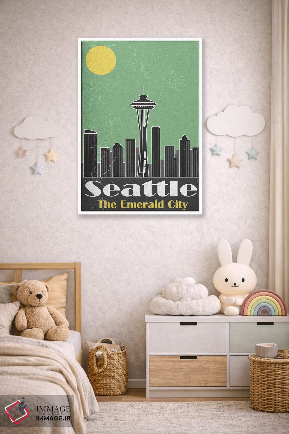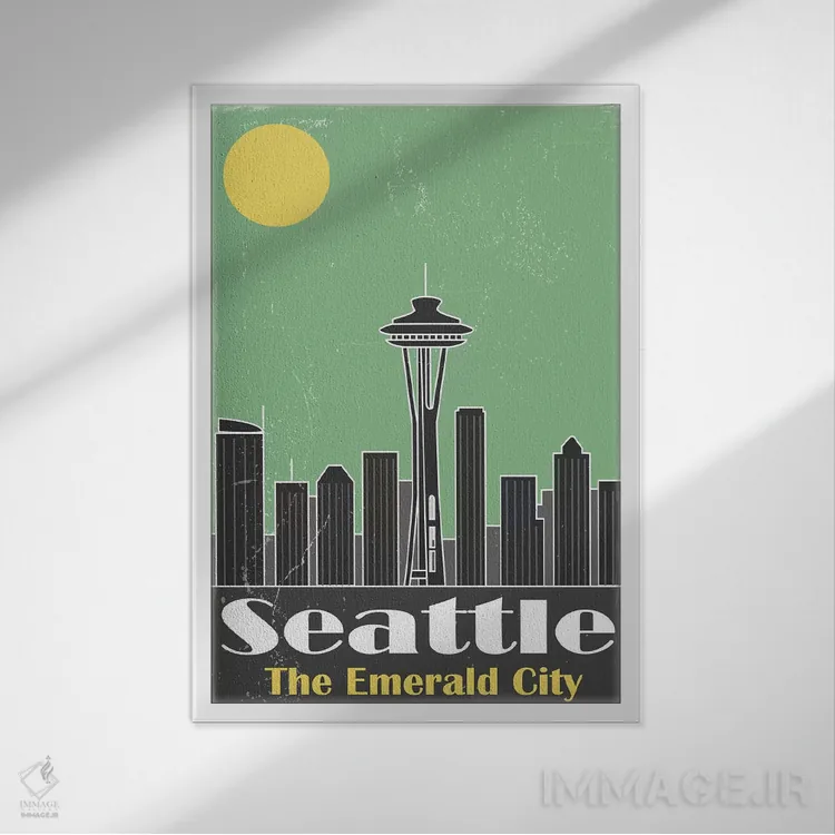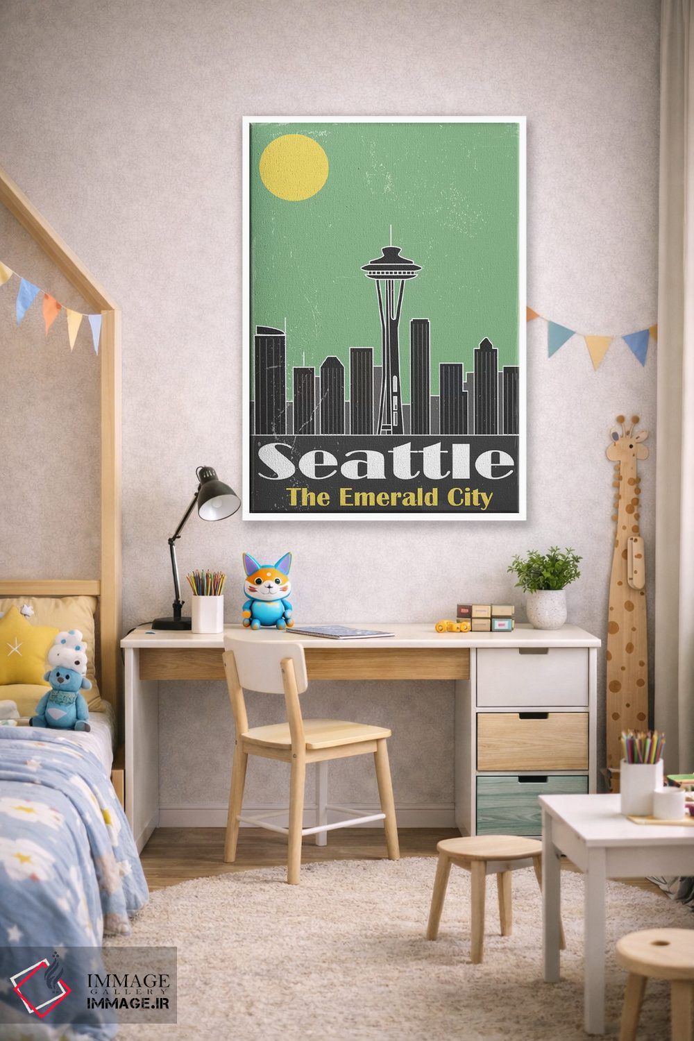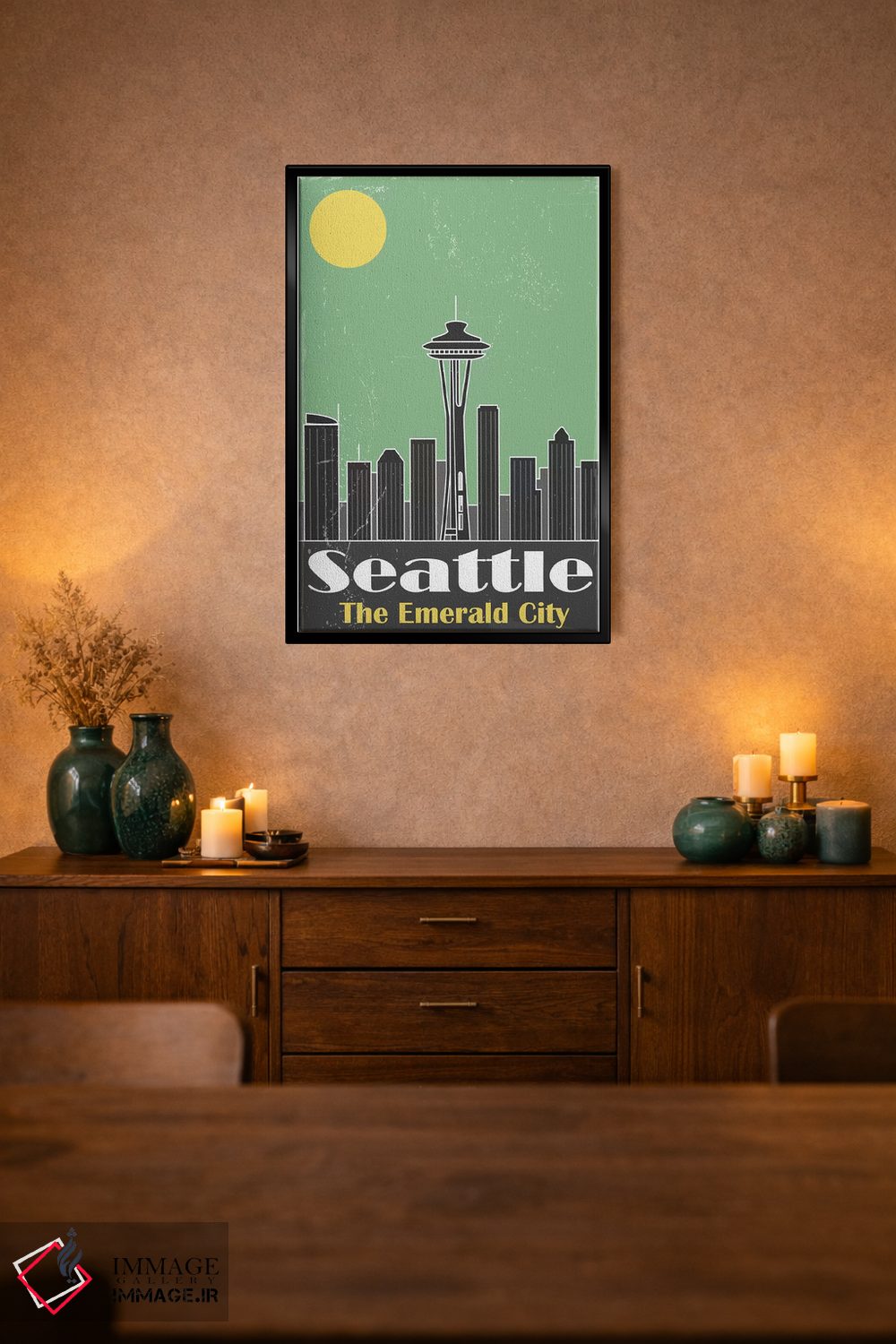 اگر چیدمانتان مینیمال است و فقط یک نقطهی رنگ میخواهید، «سیاتل (آمریکا)» اثرِ «فلای گرافیکس (استودیو/برند هنری)» با تم این اثر گزینهی خوشسلیقهای است.