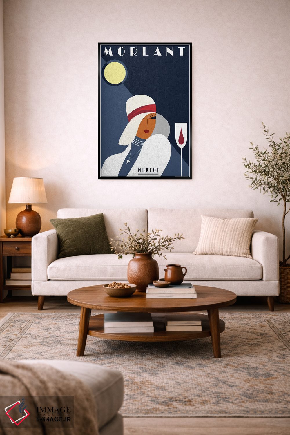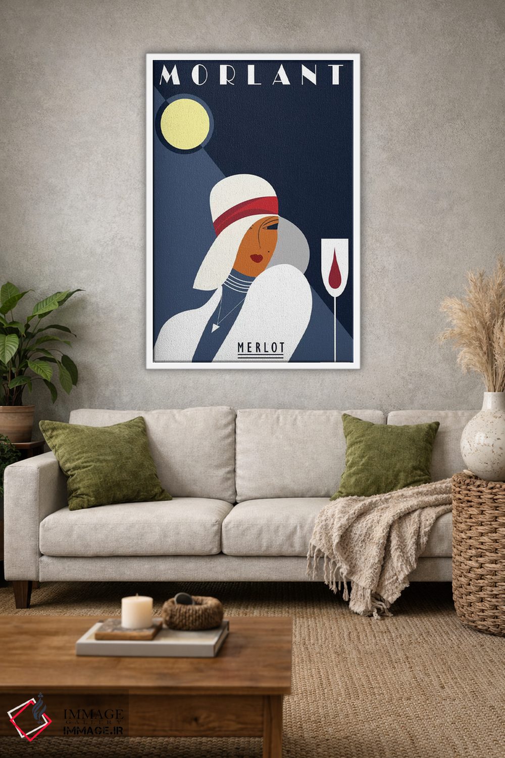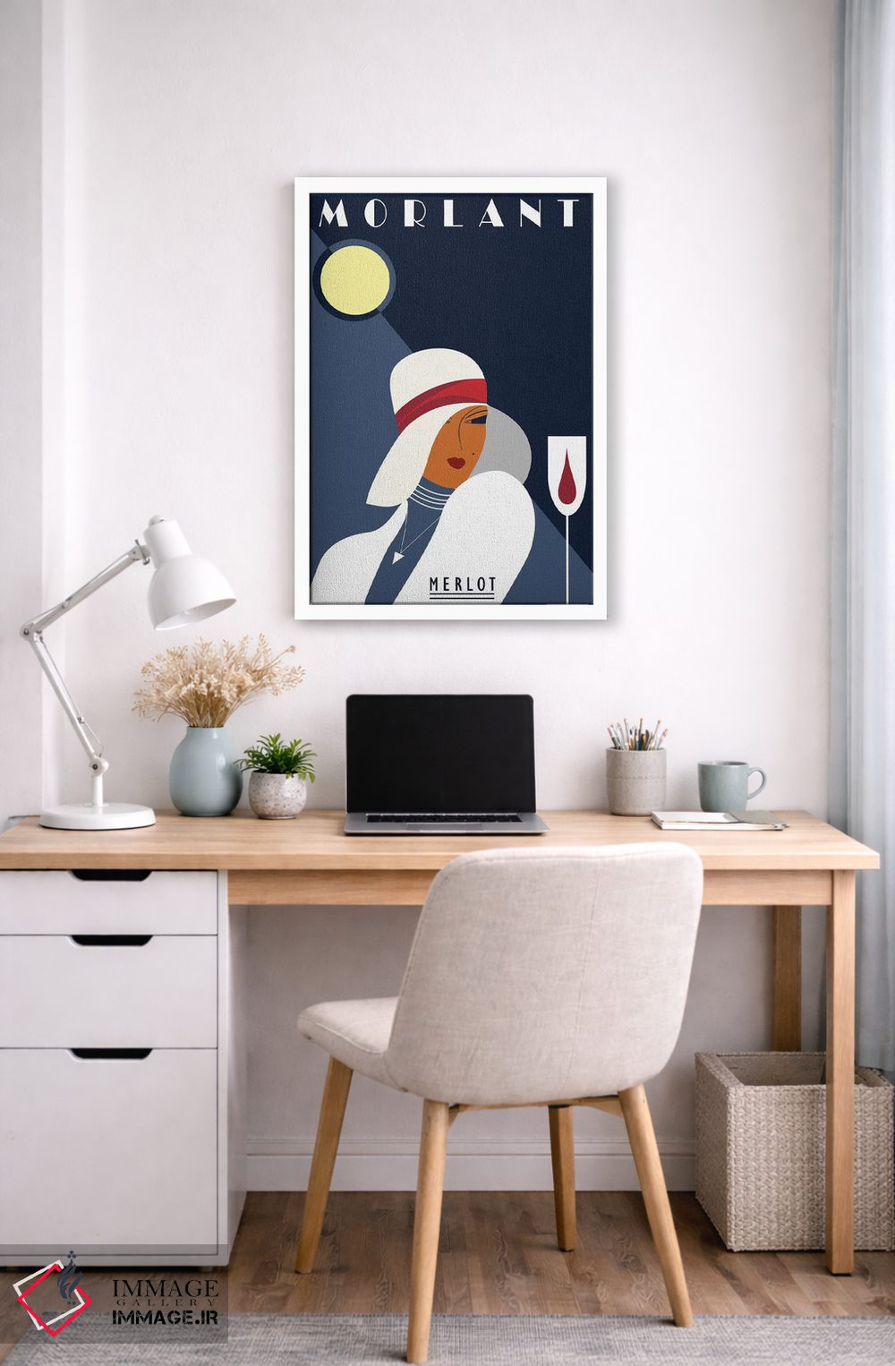 این تابلو با عنوان «مرلو مورلان» اثرِ «فلای گرافیکس (استودیو/برند هنری)»، کنار آینه و رختکن یا اتاق لباس عالی مینشیند.