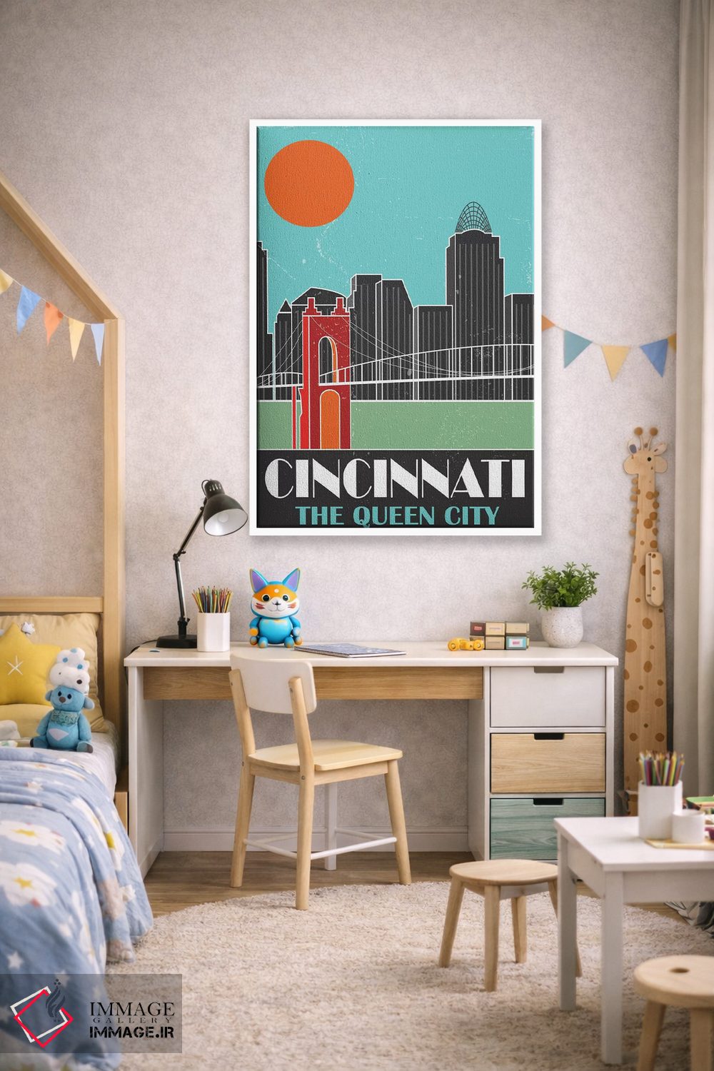 «سینسیناتی، آبی آسمانی» اثرِ «فلای گرافیکس (استودیو/برند هنری)» یک قاب دکوراتیوِ گرم و دلنشین است؛ این اثر در اجرای پرداختِ هنری، فضا را نرمتر و صمیمیتر نشان میدهد.