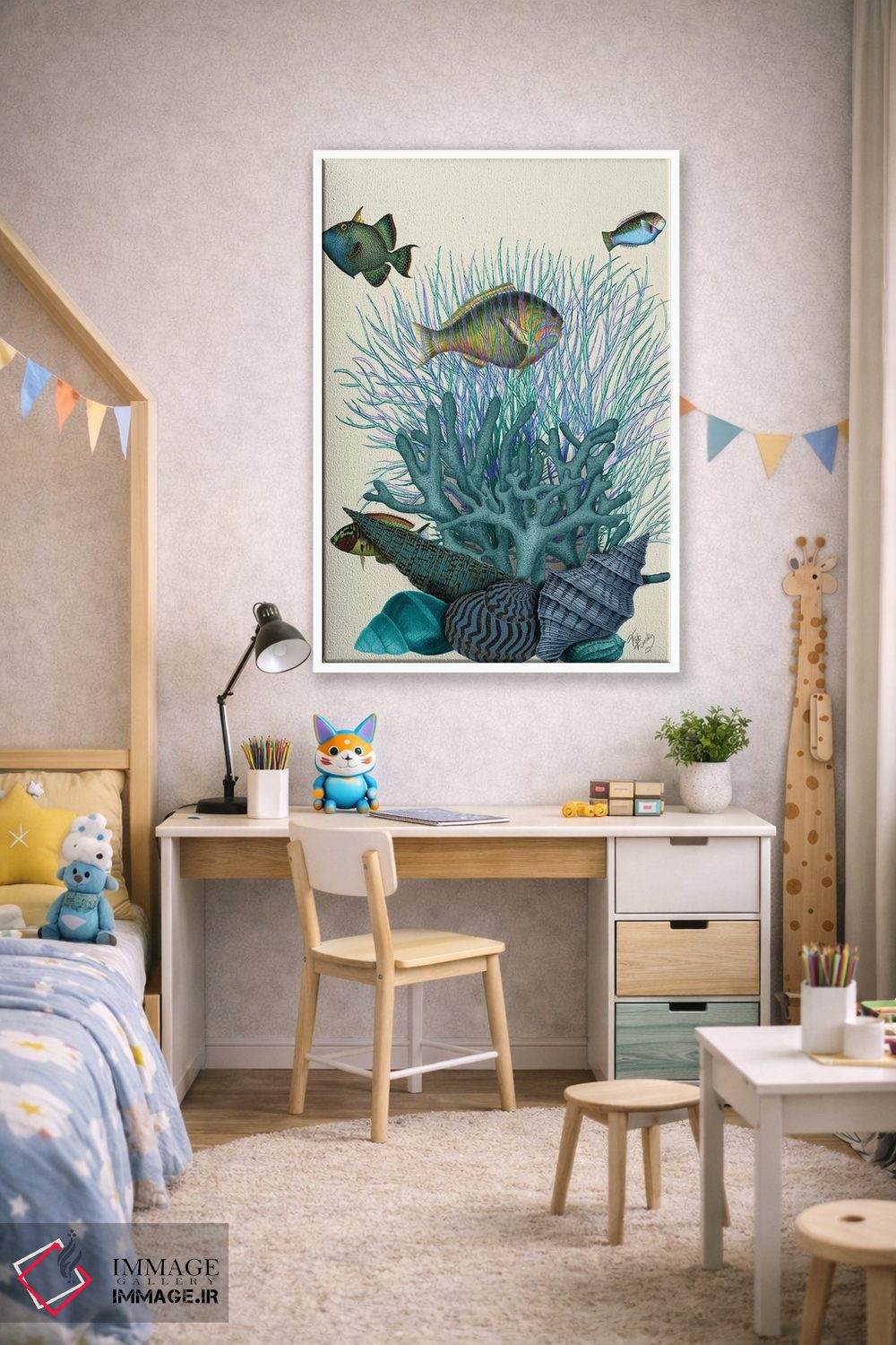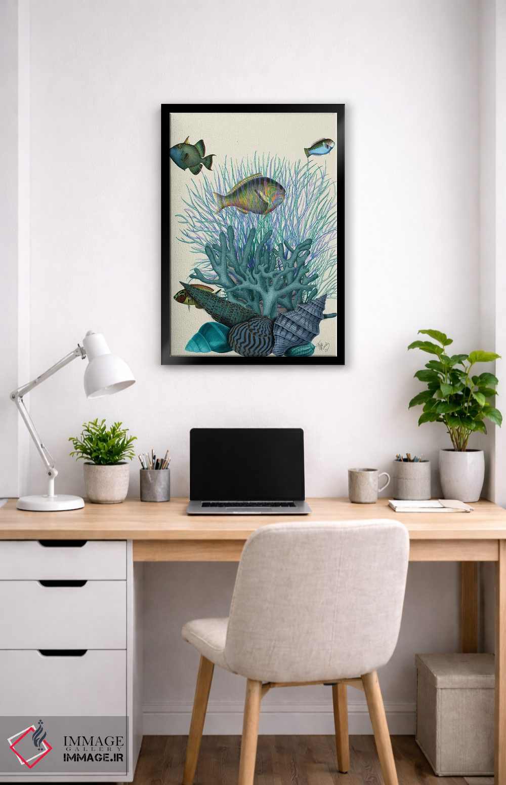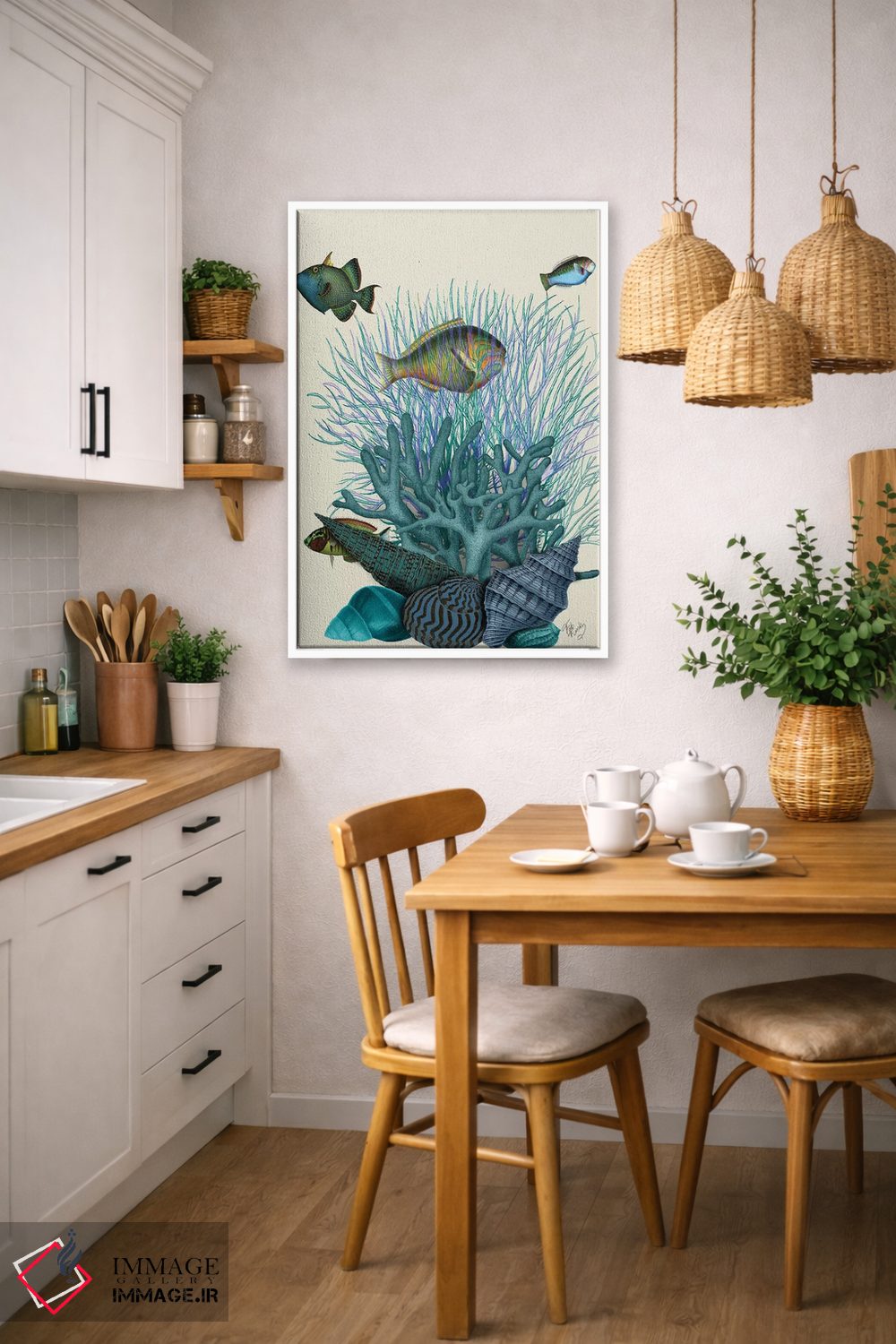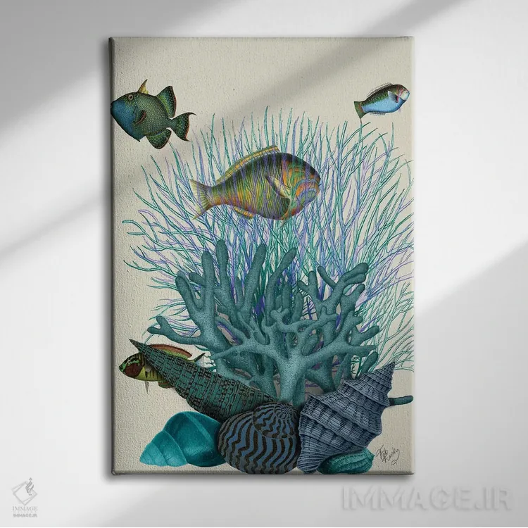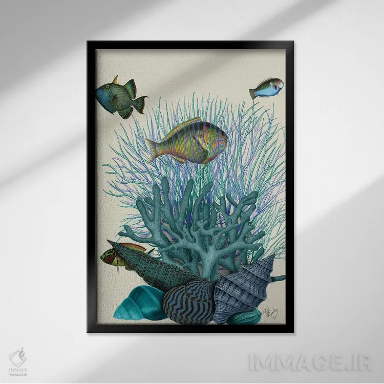 برای دیوارهای ساده، «ماهی، صدفهای آبی و مرجانها» اثرِ «فب فانکی (استودیو هنری)» به فضا، گرمیِ ملایم اضافه میکند؛ برای هدیهدادن به دوستداران حیوانات انتخابی خوشسلیقه است. برای دیوار گالریوار هم گزینهٔ خوبیست.