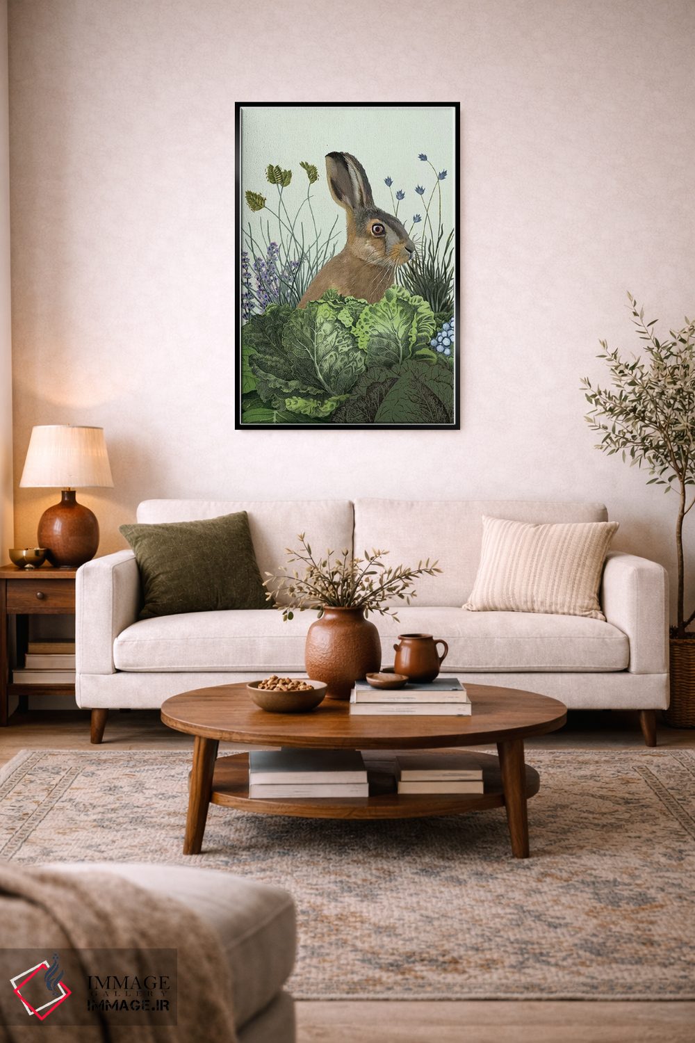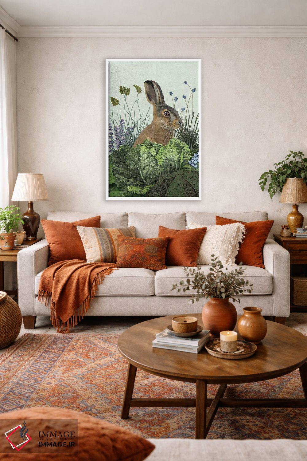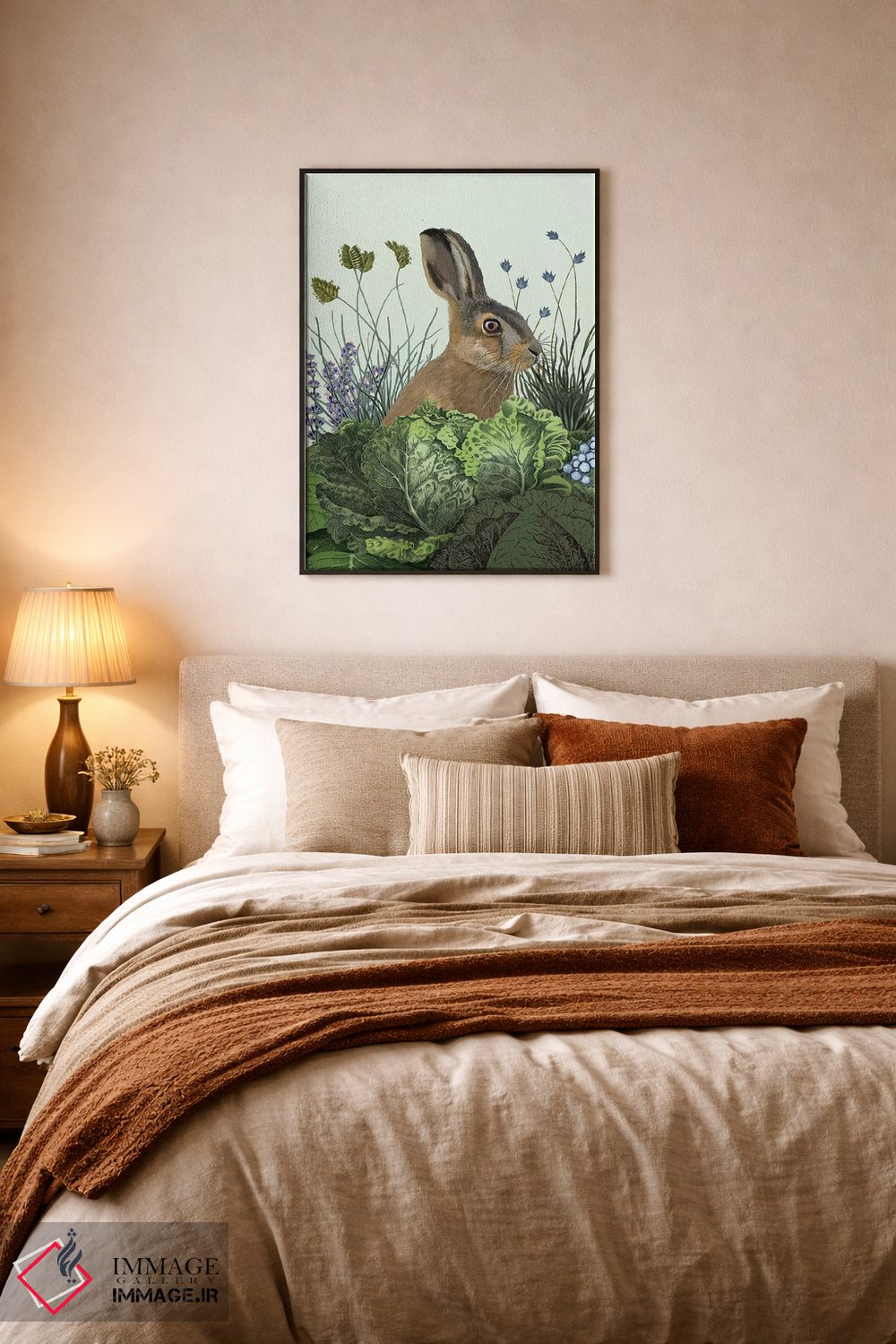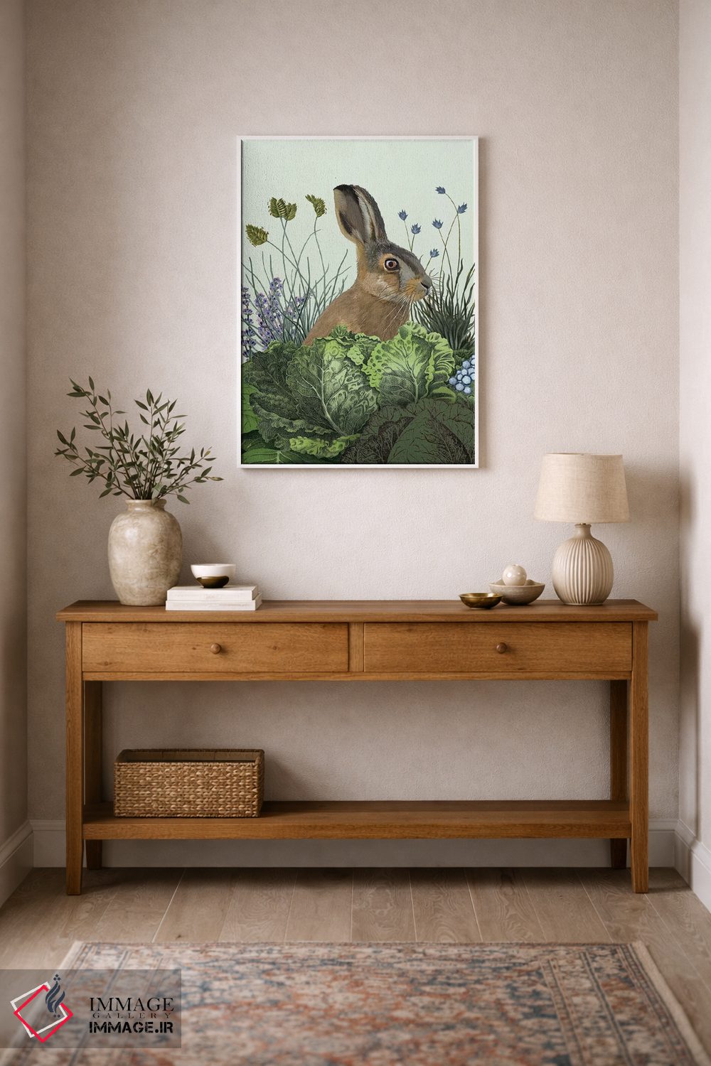 براساس پالت ترکیبی اثر، قاب بلوط روشن (چوبی) پیشنهاد اول است و استخوانی ملایم مکمل. برای سفارشهای پروژهای با ابعاد و قابهای اختصاصی با ایماژ در تماس باشید.