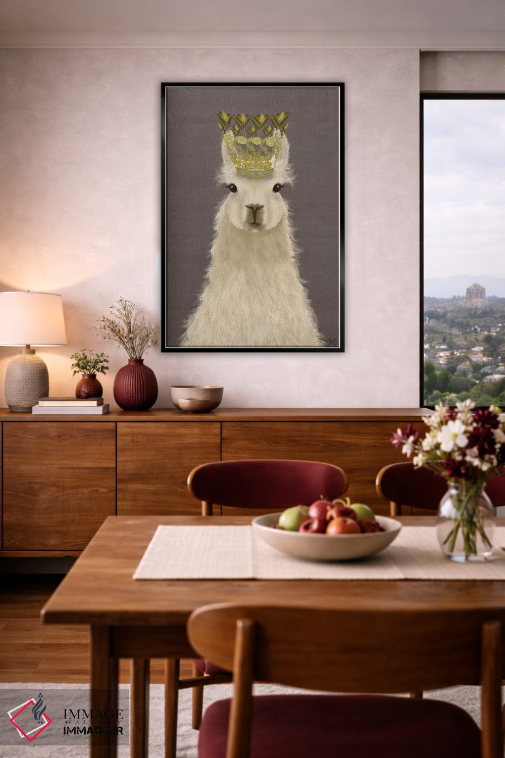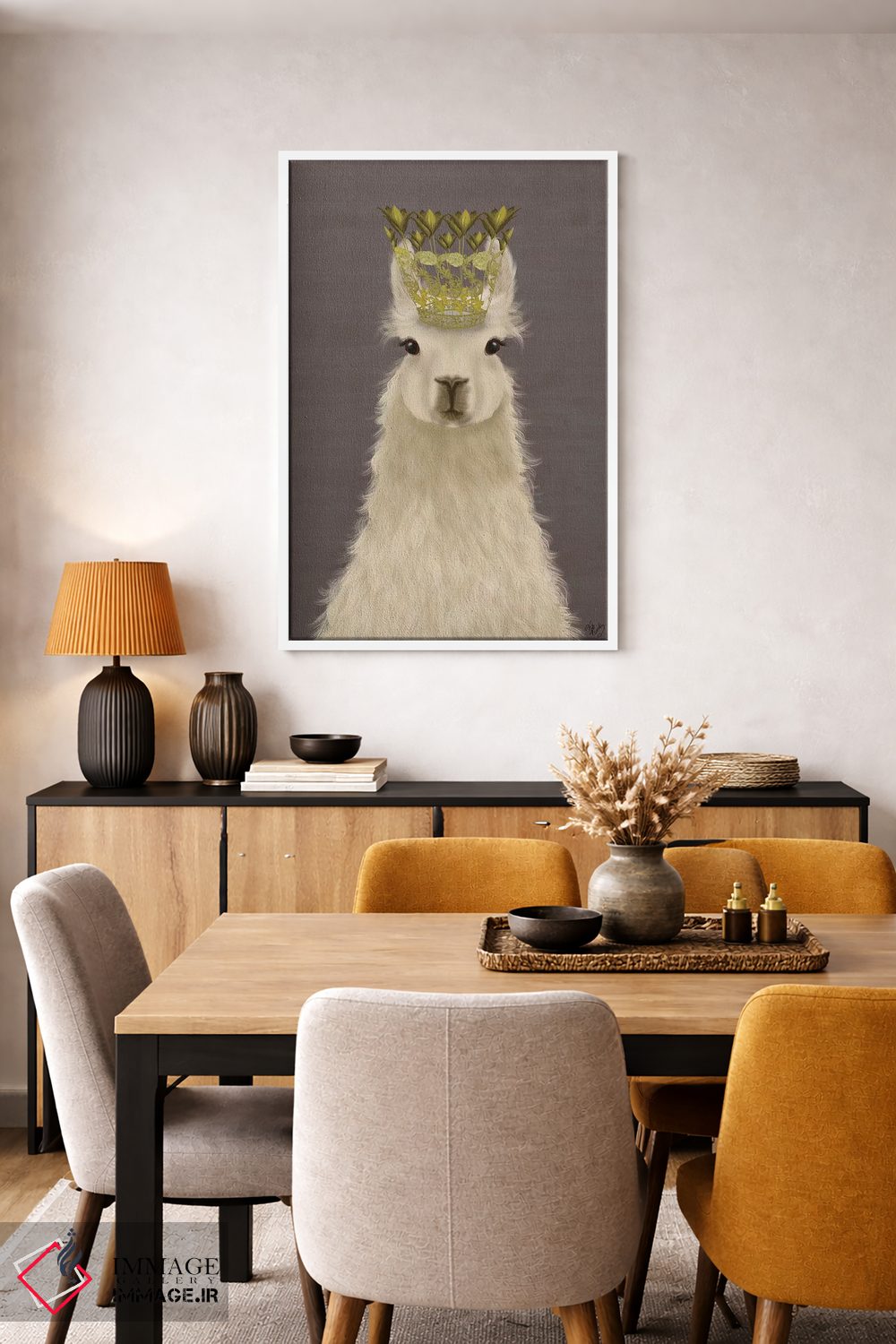 اگر به آثار حیوانات علاقه دارید، «ملکه لاما» اثرِ «فب فانکی (استودیو هنری)» در کنار رنگهای خنثی، تضاد دلچسبی میسازد، برای دیوار کنار میز کار گزینهٔ مناسبیست. هر بار نگاهش میکنید، یک جزئیات تازه به چشم میآید.