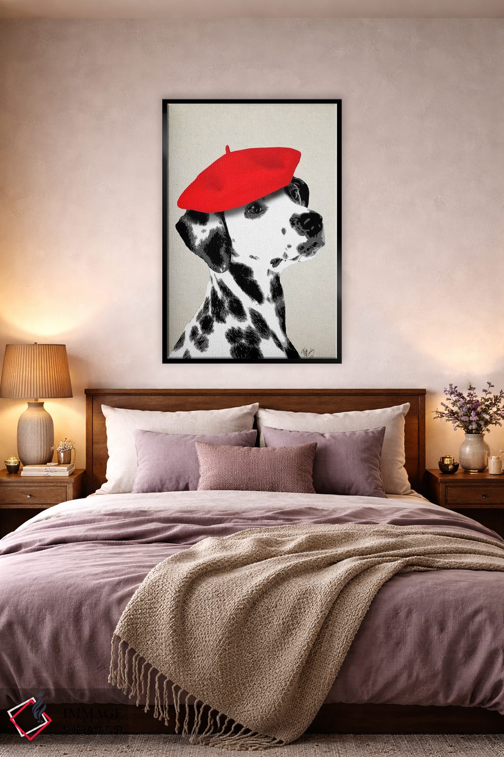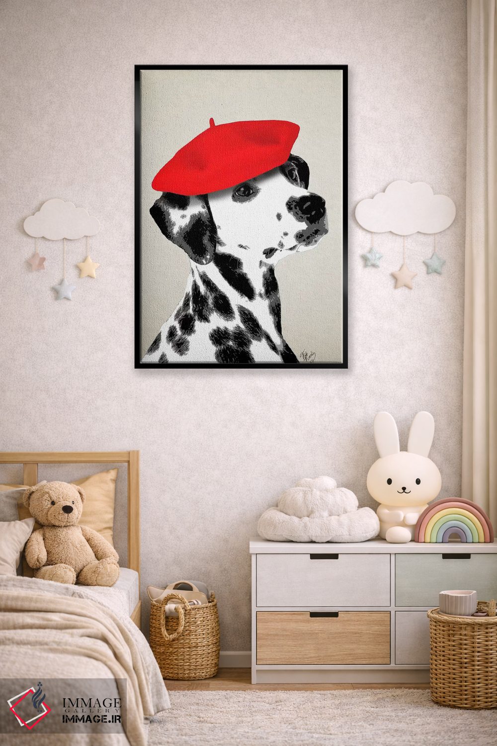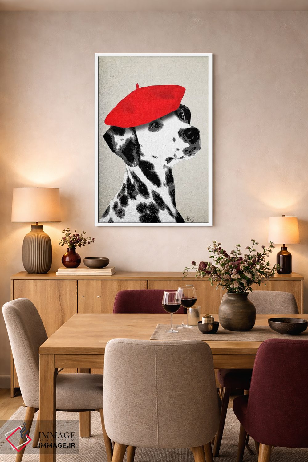 برای دکورهای صمیمی، «سگ دالماتین با کلاه بره قرمز» اثرِ «فب فانکی (استودیو هنری)» مثل یک امضای بامزه اما متین عمل میکند؛ برای راهروها و ورودیهای گرم انتخابی خوشسلیقه است. با نورپردازی نقطهای، جذابتر هم میشود.