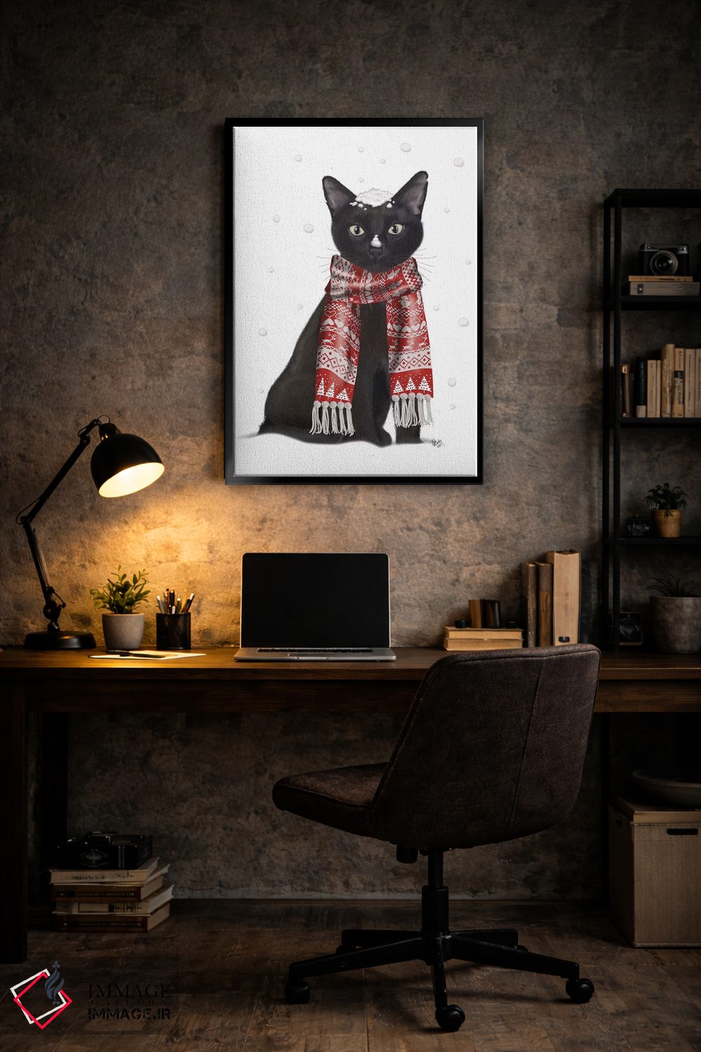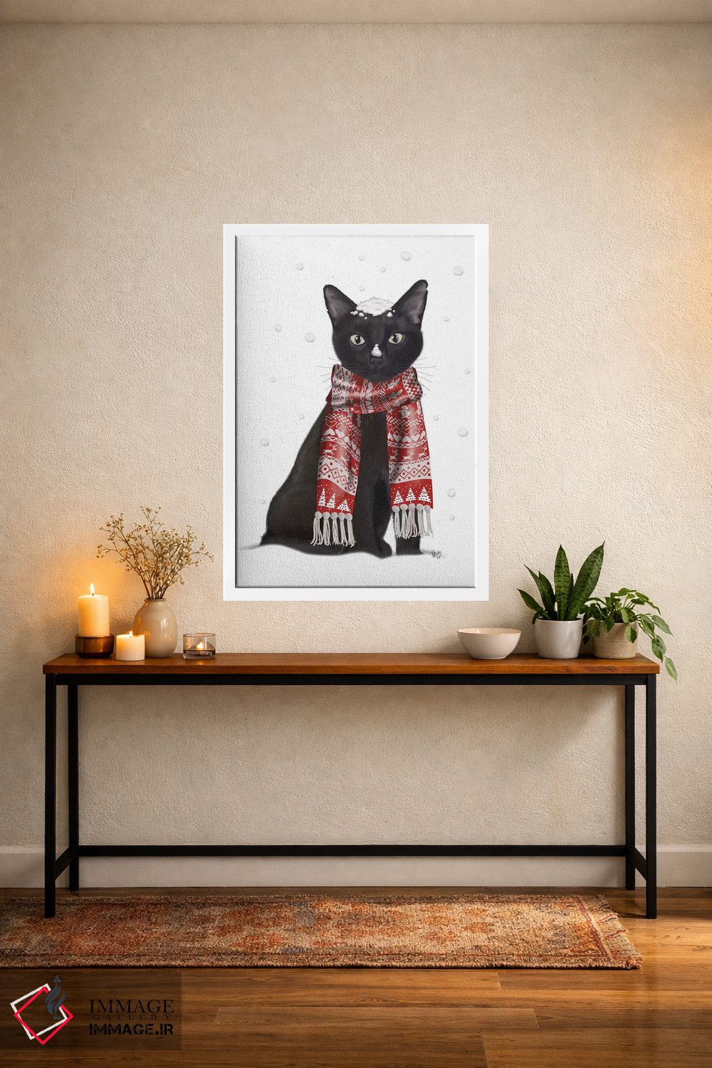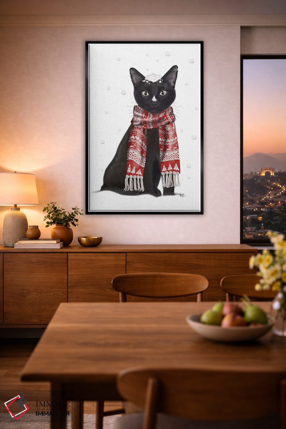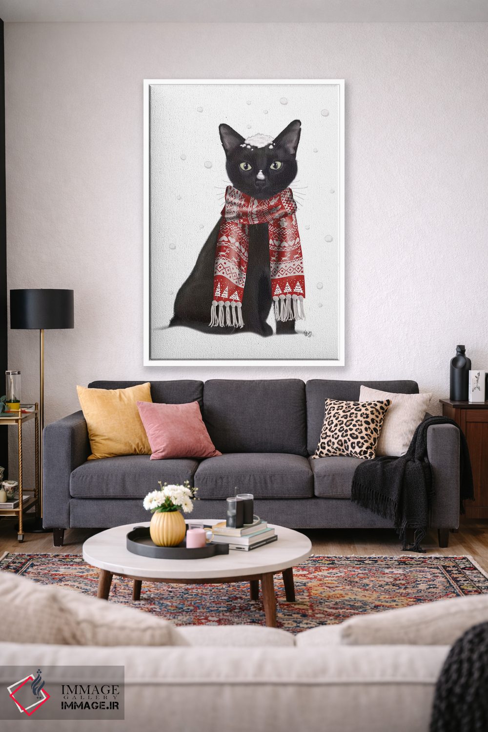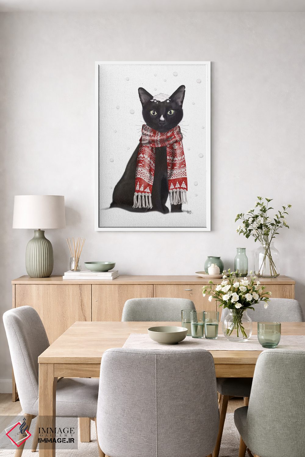 برای دکورهای صمیمی، «گربه سیاه با شال قرمز» اثرِ «فب فانکی (استودیو هنری)» فضا را صمیمیتر و دعوتکنندهتر نشان میدهد؛ برای نشیمنهای خانوادگی انتخابی خوشسلیقه است. به دیوار، قصه میدهد—اما قصهای آرام و شیک.