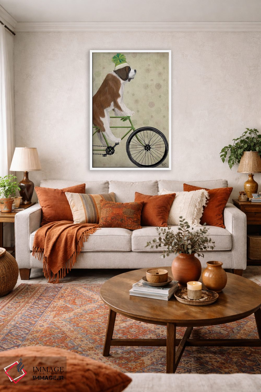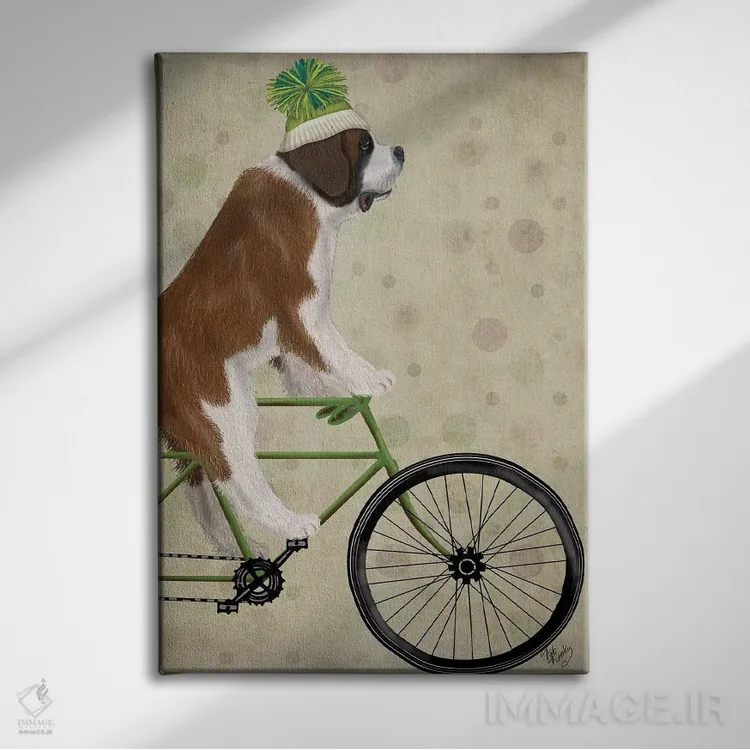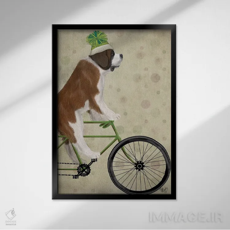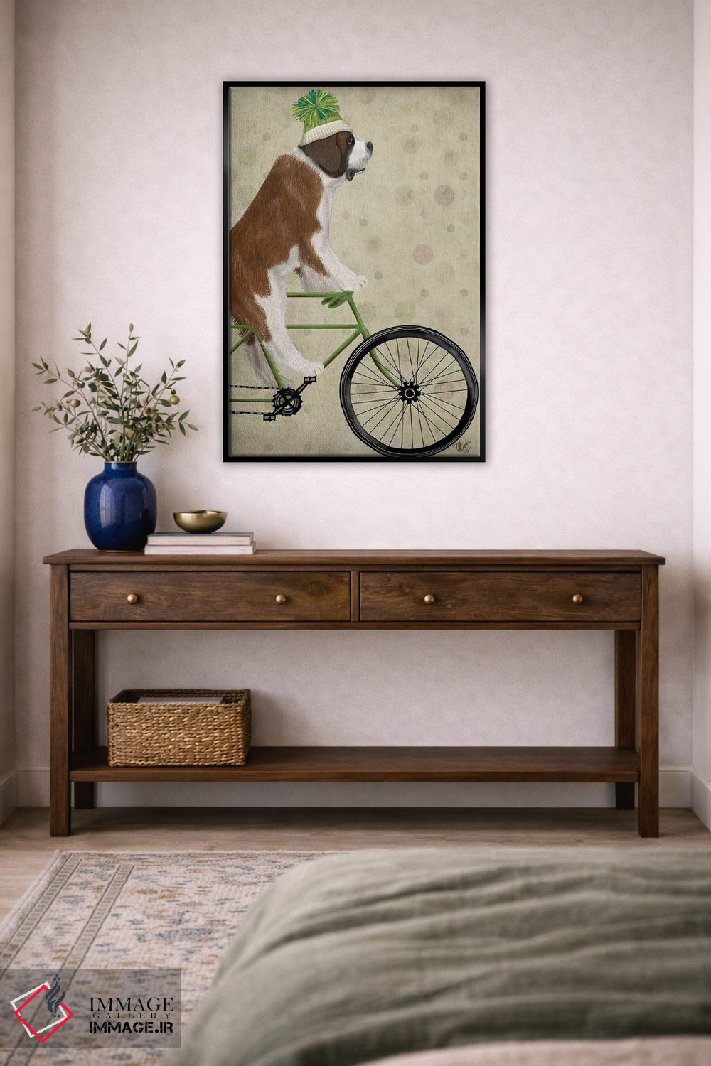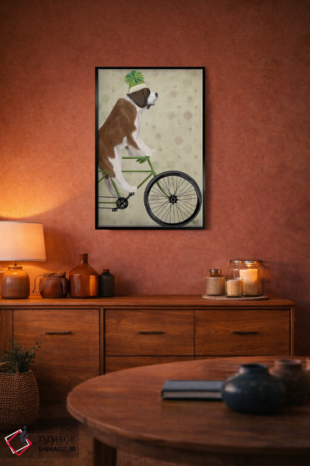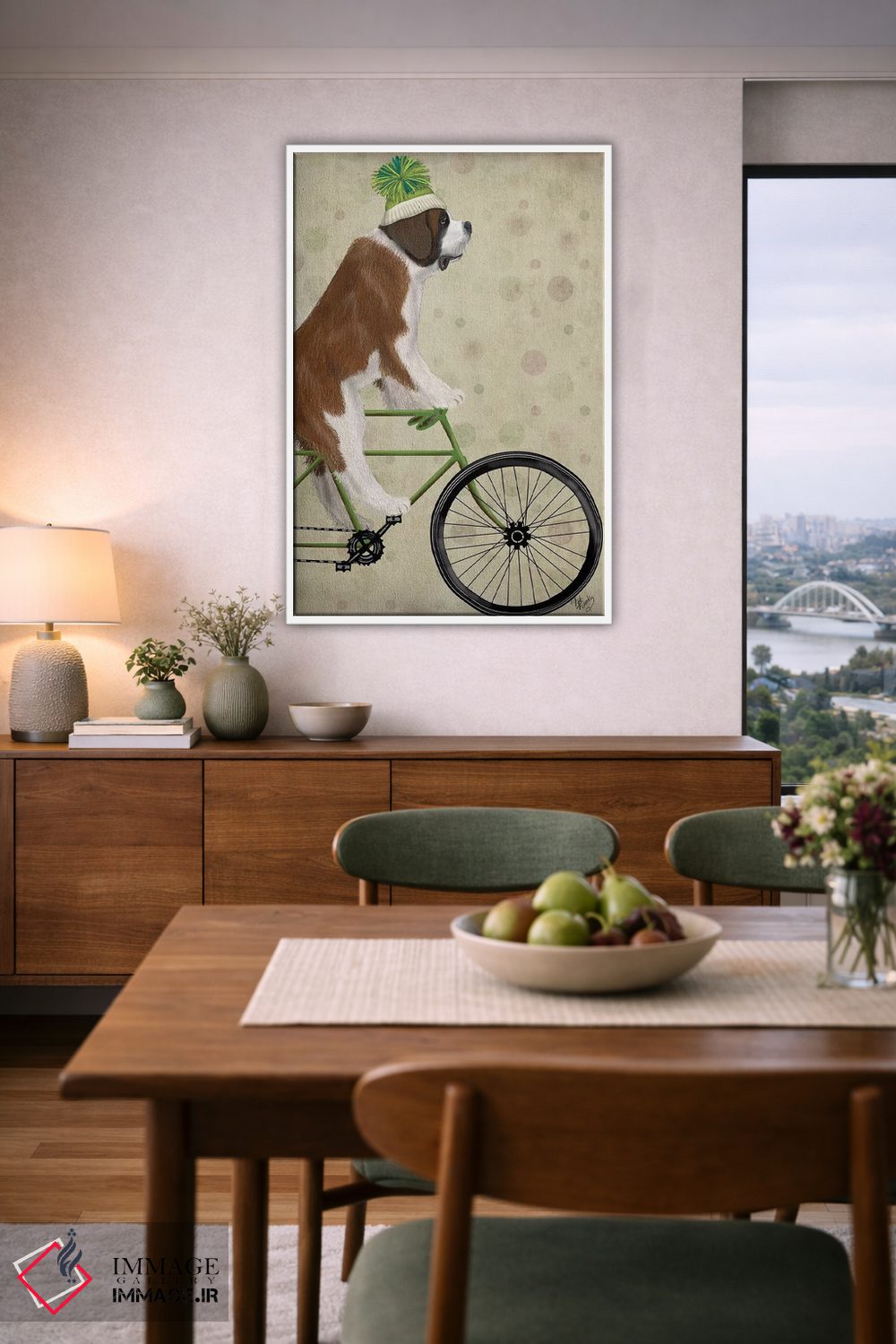 «سنت برنارد روی دوچرخه» اثرِ «فب فانکی (استودیو هنری)» از آن کارهاییست که به فضا، گرمیِ ملایم اضافه میکند؛ برای کافههای کوچک و صمیمی انتخاب خوبیست. در کنار گیاهان و نور طبیعی، جذابتر هم میشود.