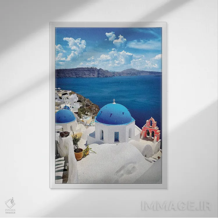 تابلو دکوراتیو سقفی به رنگ آسمان، اویا، سانتورینی، یونان اثر فلوریان اولبرشتس - نمای قاب‌دار سفید