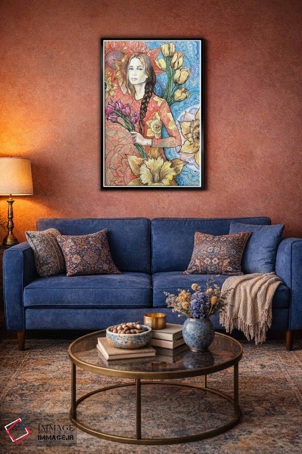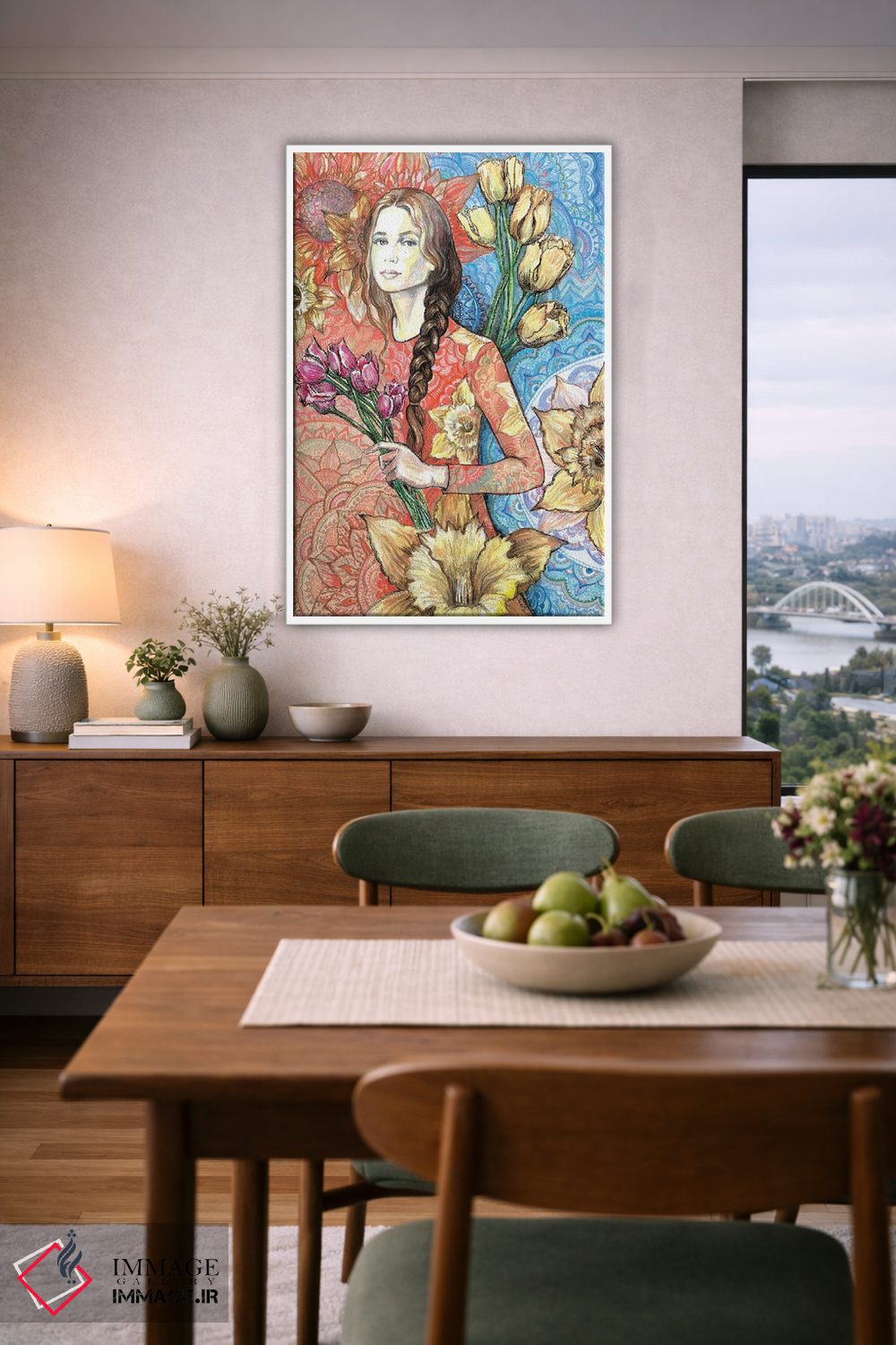 طراحی بوم گالری ایماژ بهگونهای است که اثر روی دیوار «پرداختشده» و حرفهای دیده شود—نه پرزرقوبرقِ بیپایه؛ بلکه دقیق و خوشپرداخت. بافت ظریف کنواس باعث میشود حس اثر هنری را در نگاه نزدیک نگه میدارد بهخصوص وقتی نور موضعی ملایم داشته باشید. کنترل تونها باعث میشود تعادل بهتری بین نور و رنگ ایجاد میکند بهخصوص وقتی نور موضعی ملایم داشته باشید. حاصل کار، یک تابلو خوشنشین است که هم از دور اثرگذار است و هم از نزدیک خوشخوان؛ و اگر بخواهید، میتوان چیدمان را برای گالریوال هم پیشنهاد داد.