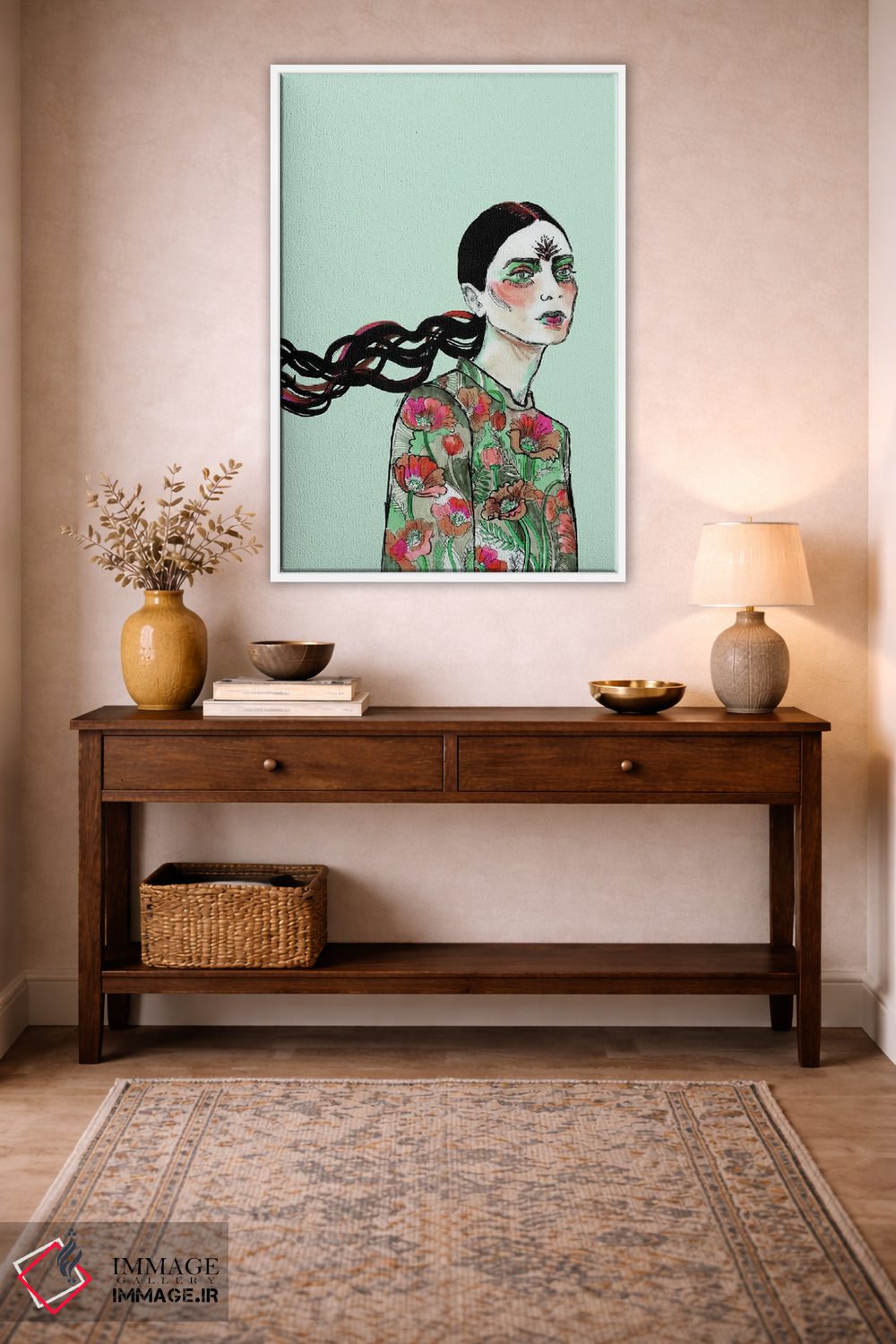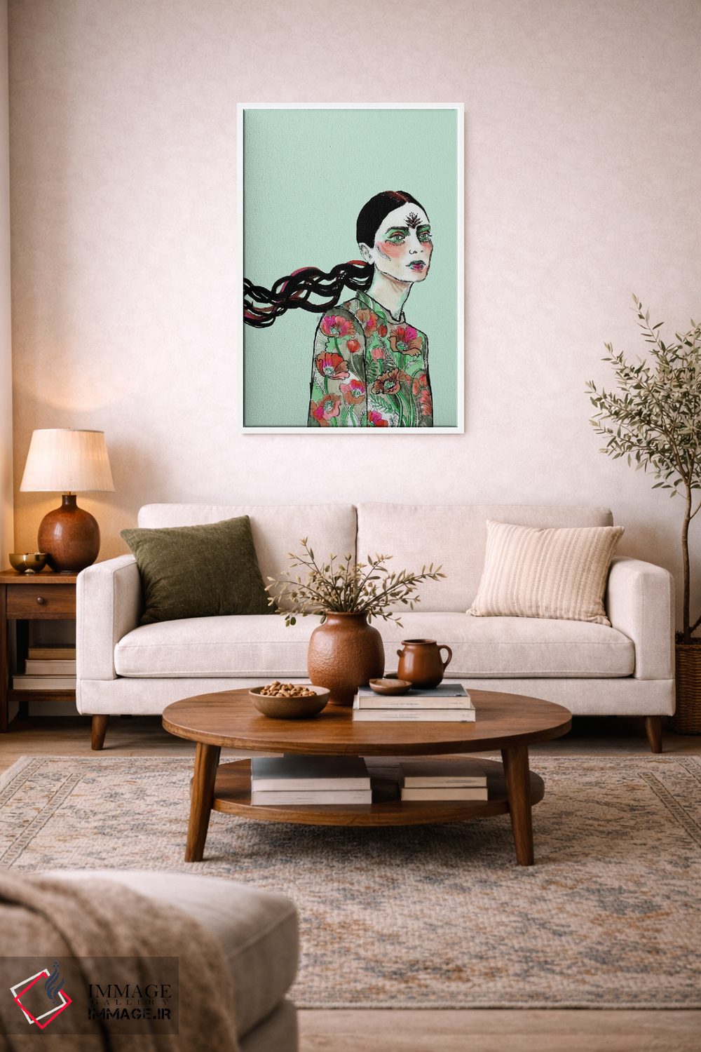 براساس پالت ترکیبی اثر، قاب تیک گرم (چوبی) پیشنهاد اول است و مشکی مات (فریم متوسط) مکمل. برای سفارشهای پروژهای با ابعاد و قابهای اختصاصی با ایماژ در تماس باشید.