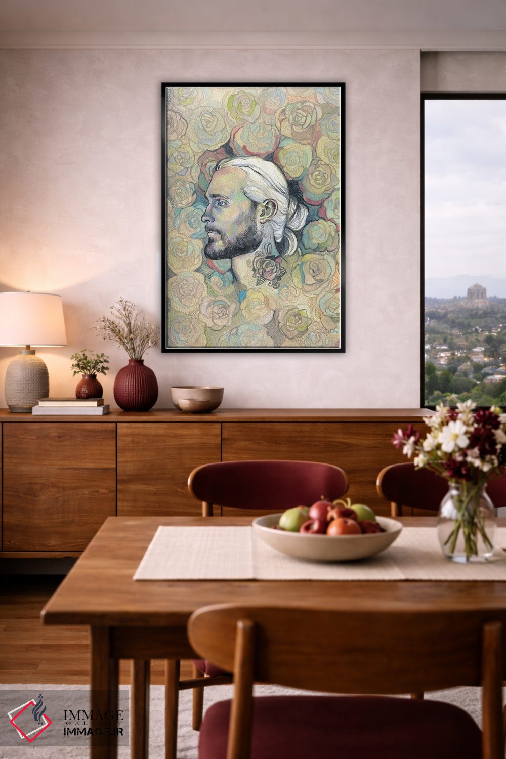براساس پالت گرم اثر، قاب بلوط روشن (چوبی) پیشنهاد اول است و استخوانی ملایم مکمل. برای سفارشهای پروژهای با ابعاد و قابهای اختصاصی با ایماژ در تماس باشید.