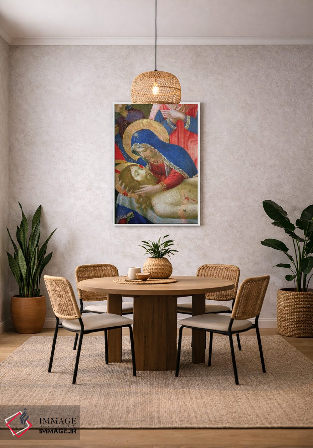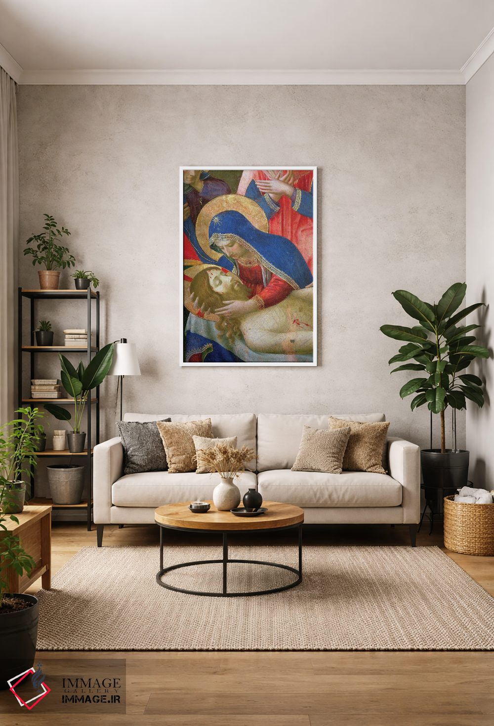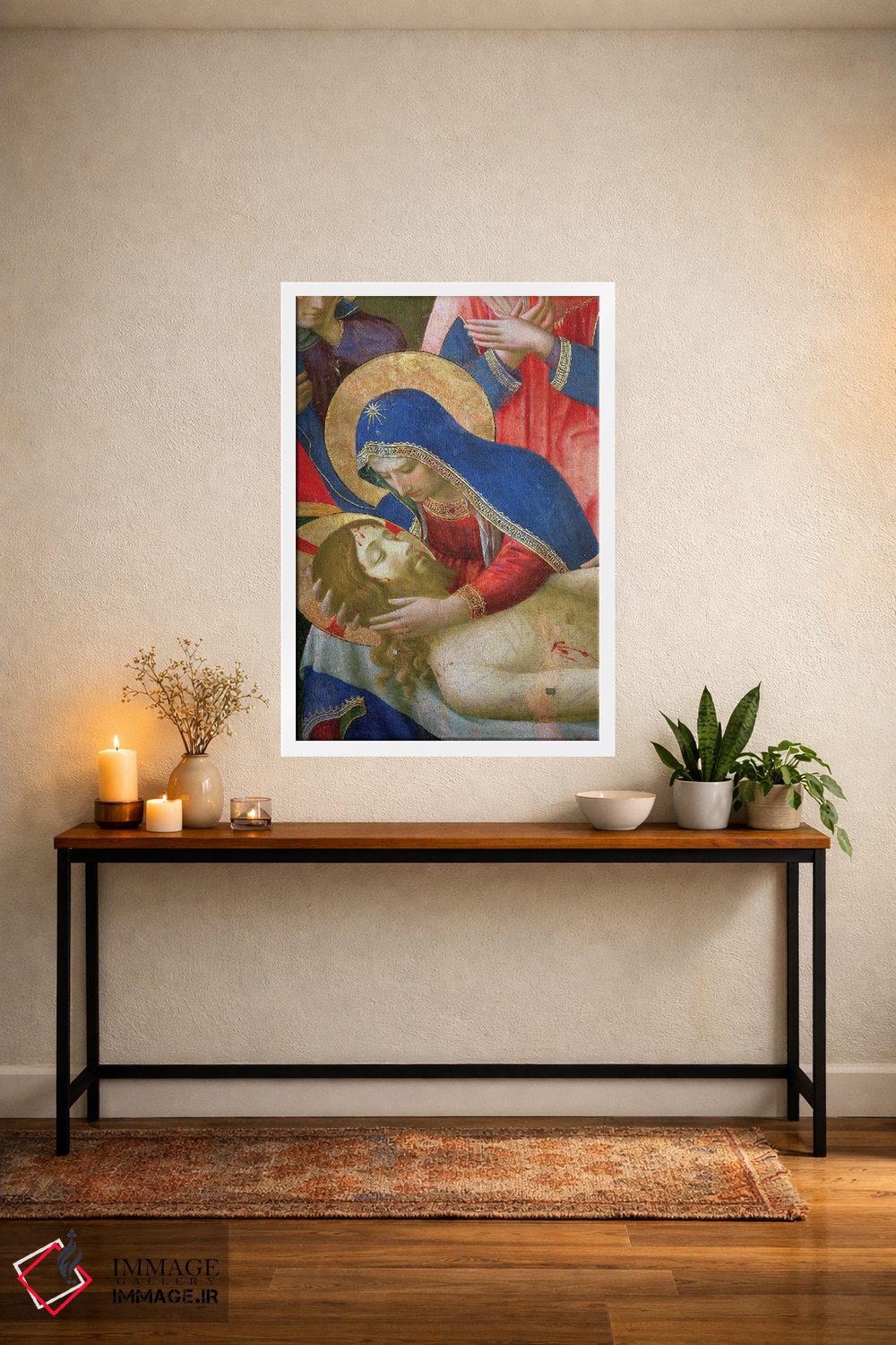 اگر به قابهای رسمی و گالریپسند علاقه داری، «جزئیات مدونا در حال نگه داشتن عیسی، سوگواری بر پیکر مسیح، حدود ۱۴۳۶—۴۰» اثرِ «فرا آنجلیکو (نقاش ایتالیایی)» با موضوعِ این اثر در فضای فاخر کلاسیک گزینهی مطمئنی است.