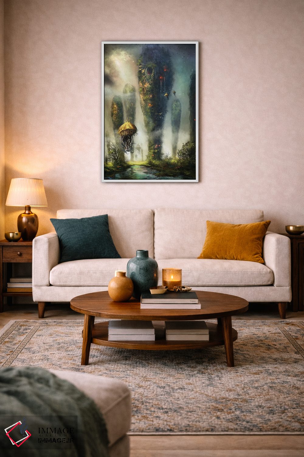 براساس پالت ترکیبی اثر، قاب بلوط روشن (چوبی) پیشنهاد اول است و استخوانی ملایم مکمل. برای سفارشهای پروژهای با ابعاد و قابهای اختصاصی با ایماژ در تماس باشید.