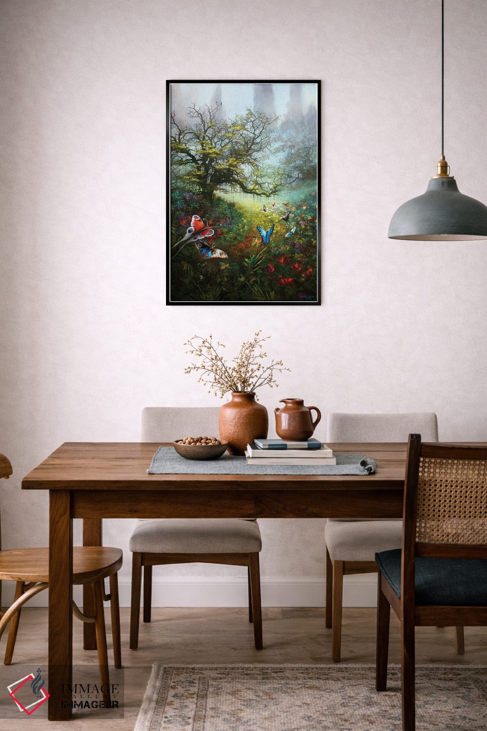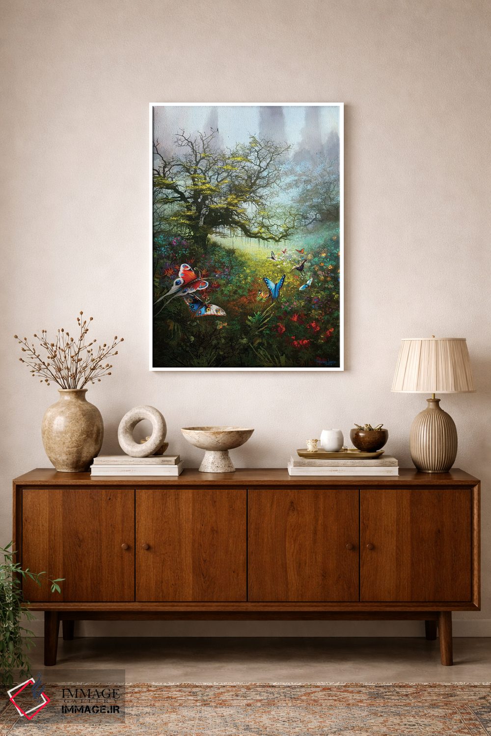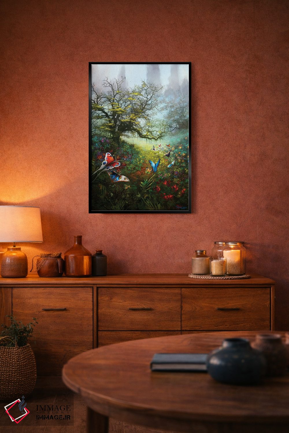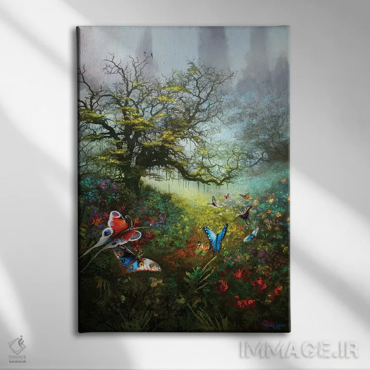 براساس پالت ترکیبی اثر، قاب تیک گرم (چوبی) پیشنهاد اول است و مشکی مات (فریم متوسط) مکمل. برای سفارشهای پروژهای با ابعاد و قابهای اختصاصی با ایماژ در تماس باشید.