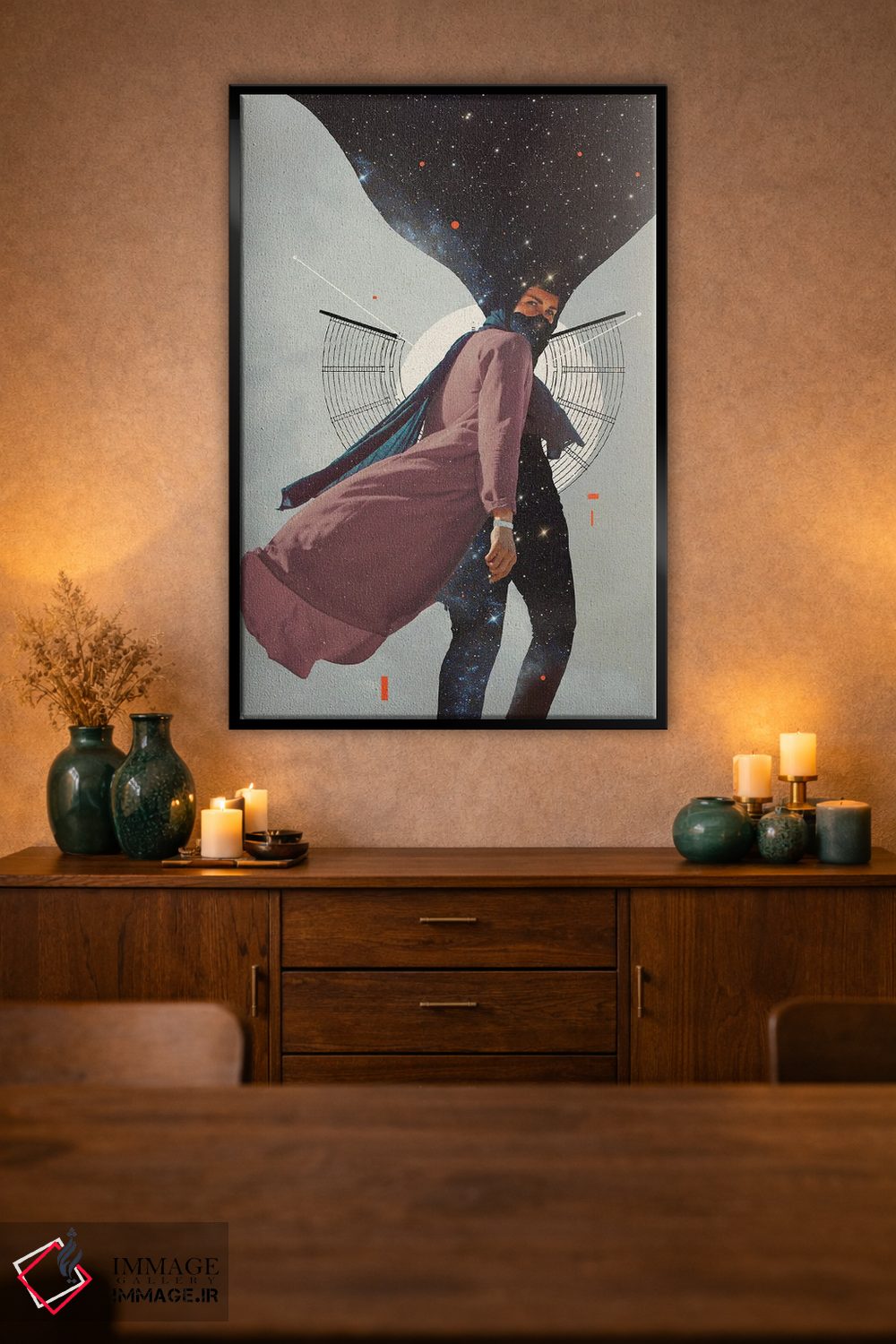براساس پالت گرم اثر، قاب تیک گرم (چوبی) پیشنهاد اول است و مشکی مات (فریم متوسط) مکمل. برای سفارشهای پروژهای با ابعاد و قابهای اختصاصی با ایماژ در تماس باشید.
