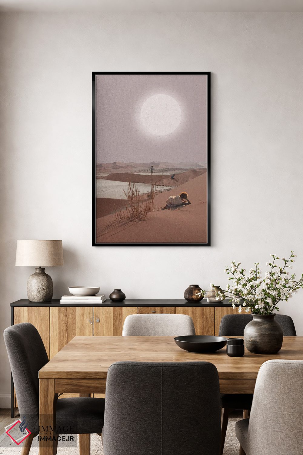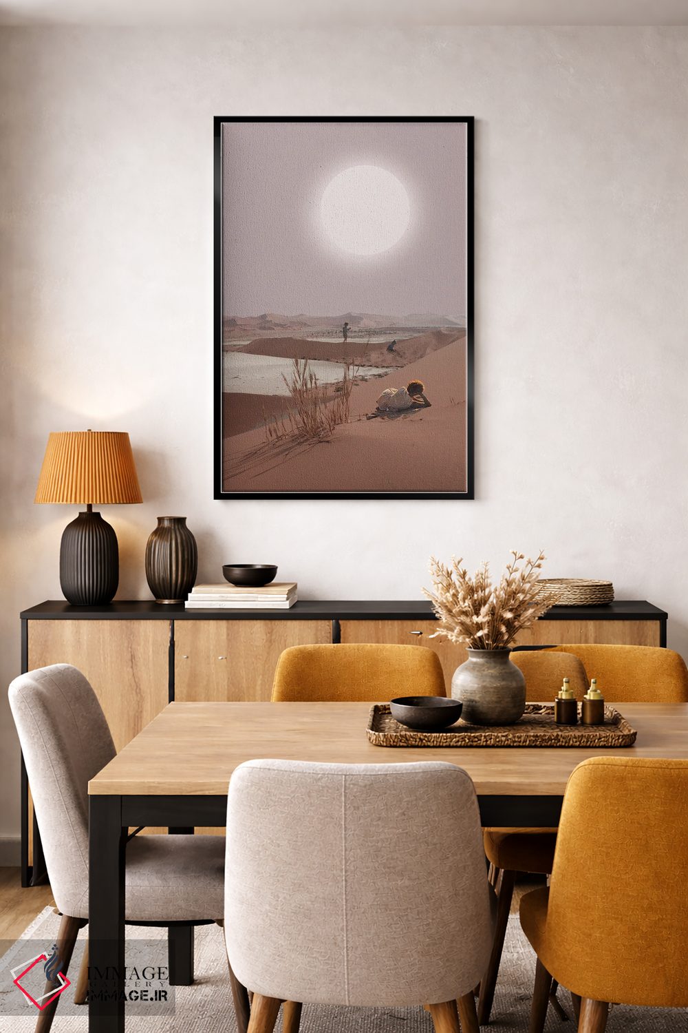 براساس پالت گرم اثر، قاب تیک گرم (چوبی) پیشنهاد اول است و مشکی مات (فریم متوسط) مکمل. برای سفارشهای پروژهای با ابعاد و قابهای اختصاصی با ایماژ در تماس باشید.