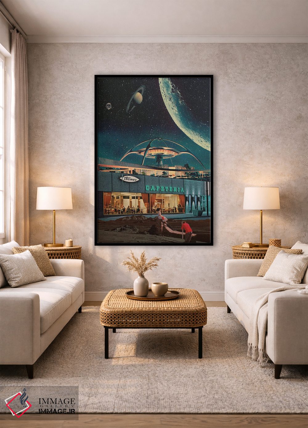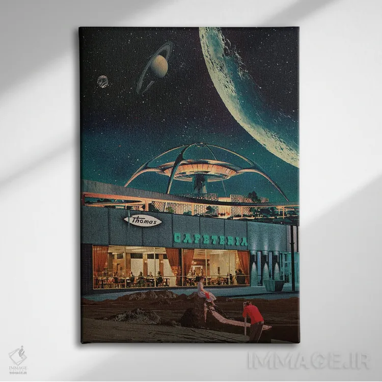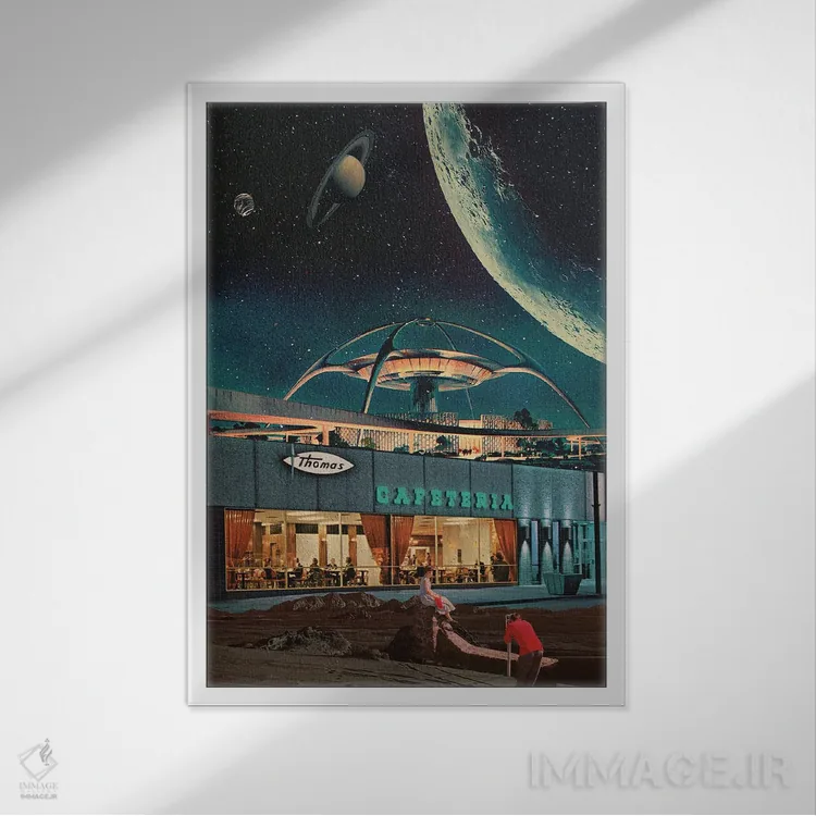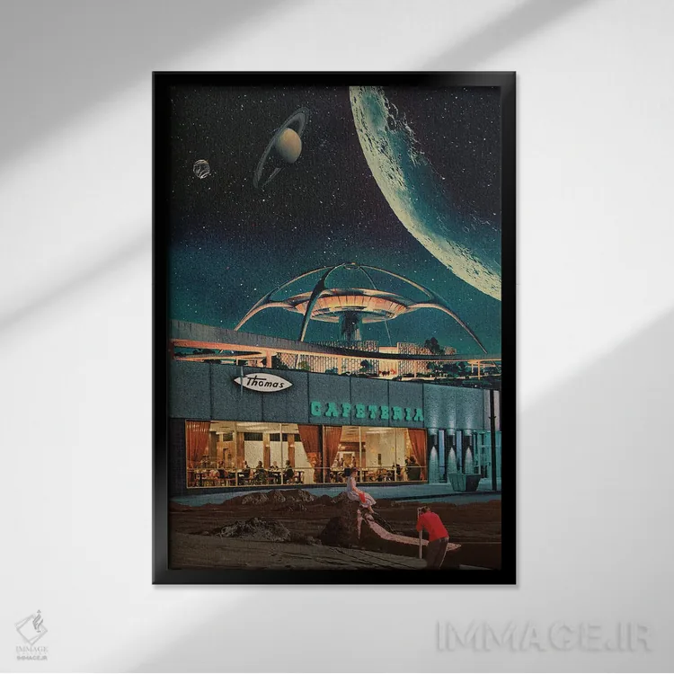 این اثر با عنوان «"کارتپستالی از سال ۲۳۴۶"» اثرِ «فرانک موس (هنرمند با نام مستعار)»، برای دیوارهای شاخص و چیدمانهای سطحبالا مناسب است.