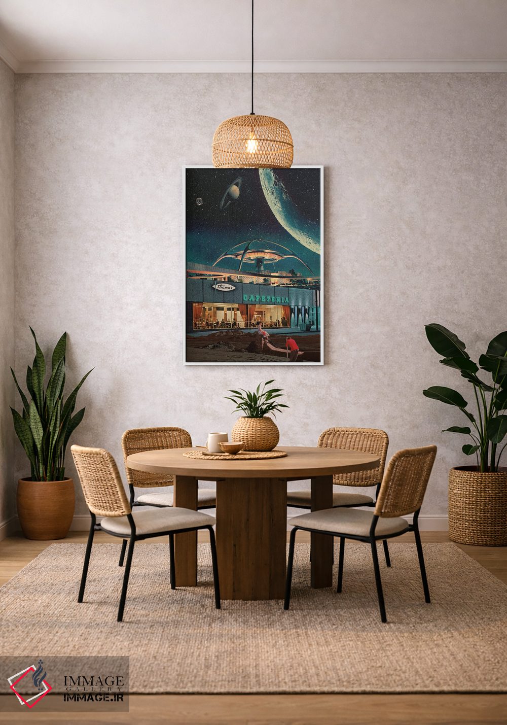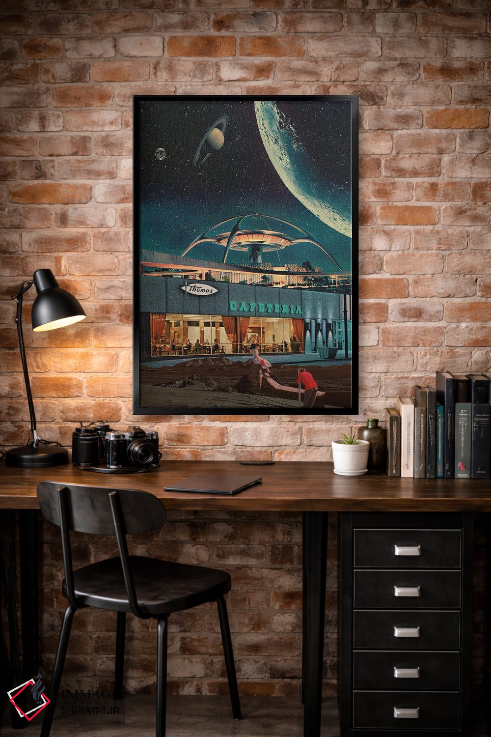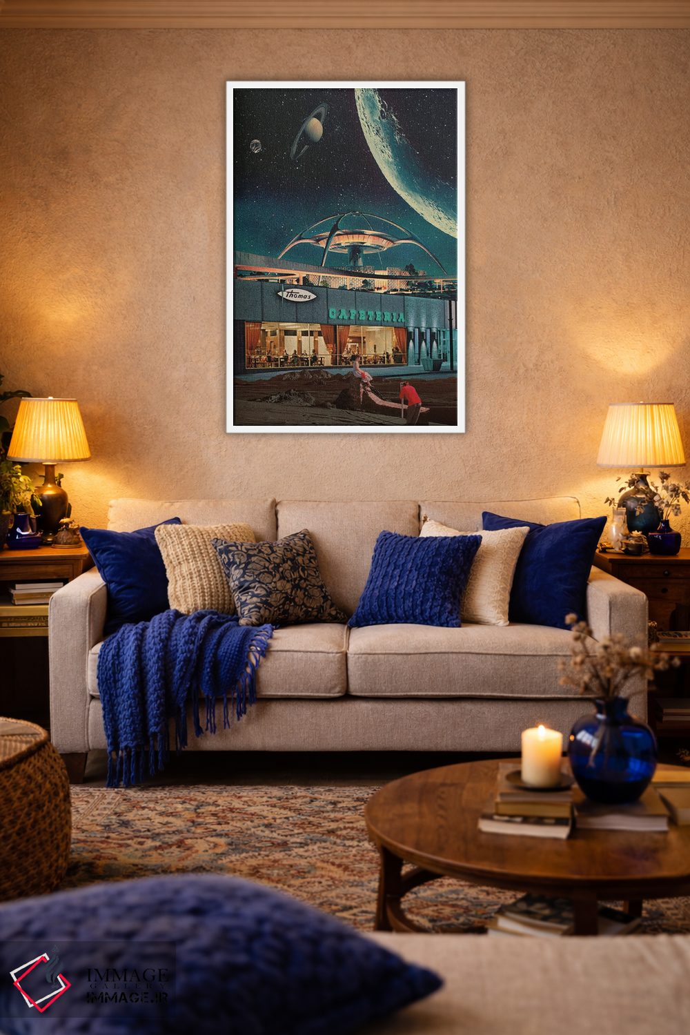 این اثر با عنوان «"کارتپستالی از سال ۲۳۴۶"» اثرِ «فرانک موس (هنرمند با نام مستعار)»، برای دیوارهای شاخص و چیدمانهای سطحبالا مناسب است.