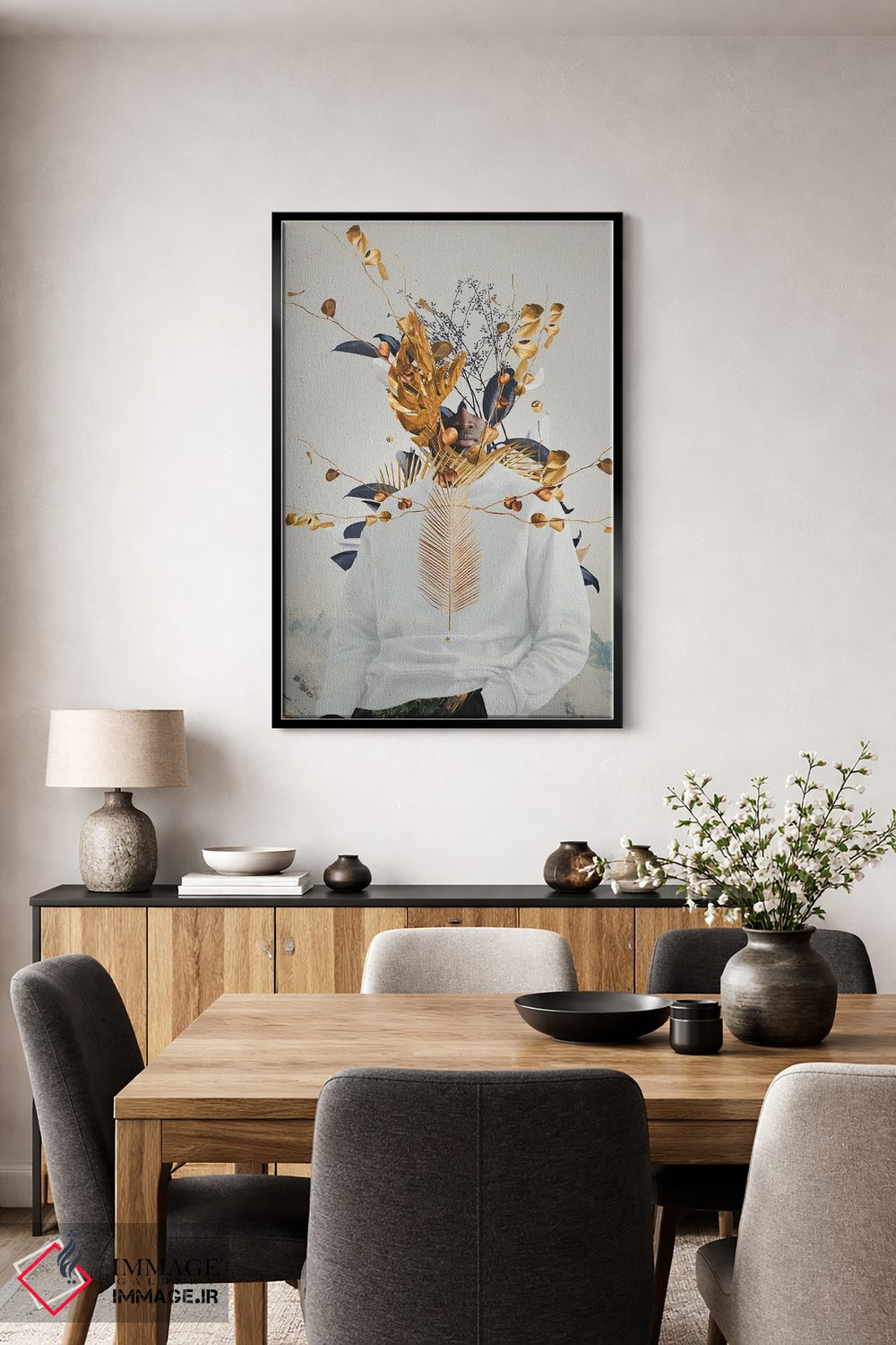 براساس پالت گرم اثر، قاب تیک گرم (چوبی) پیشنهاد اول است و مشکی مات (فریم متوسط) مکمل. برای سفارشهای پروژهای با ابعاد و قابهای اختصاصی با ایماژ در تماس باشید.