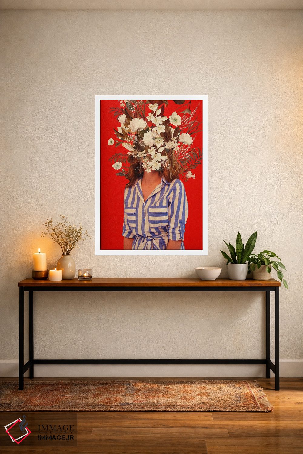 قرمز میتواند یک اکسنتِ کوچک اما موثر باشد؛ قاب تصویرهای کناری را با قرمز دوباره بیاورید تا تعادل بین گرم و سرد بهتر برقرار شود. یک اشارهی کوچک کافی است.