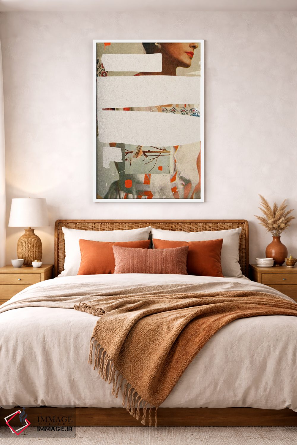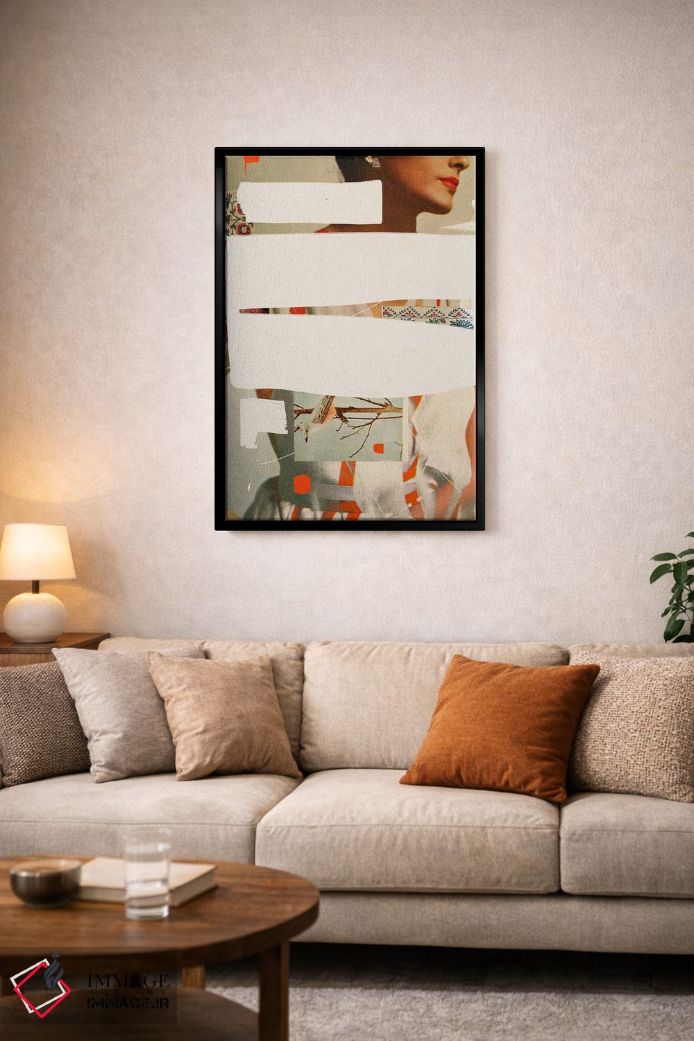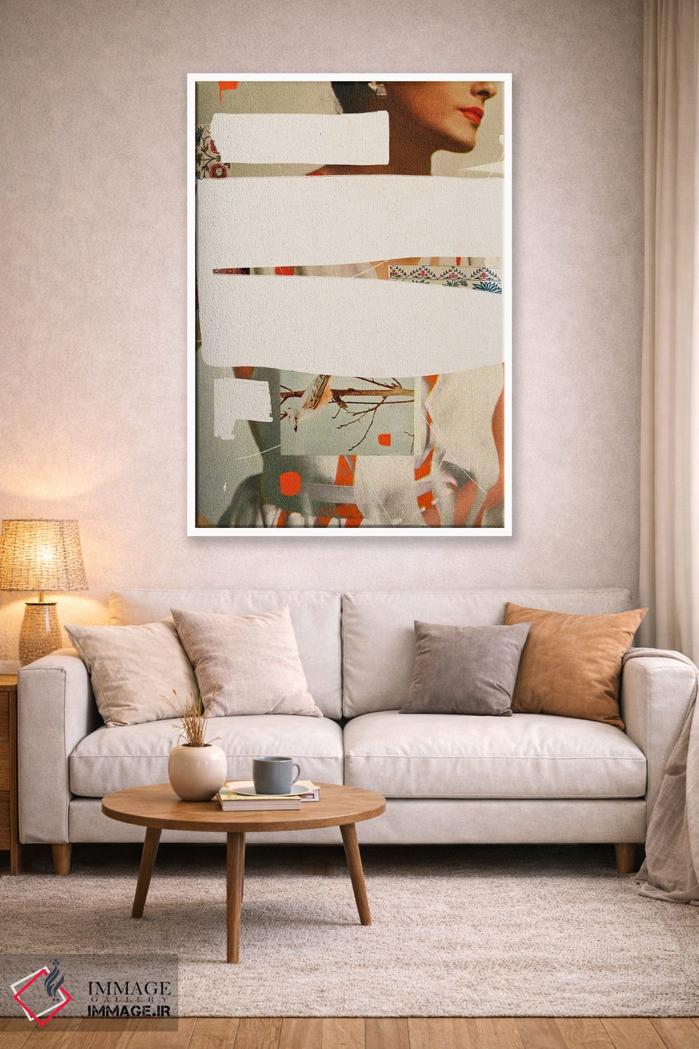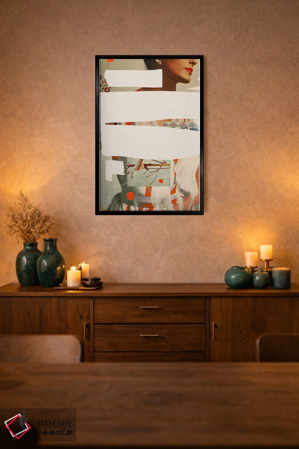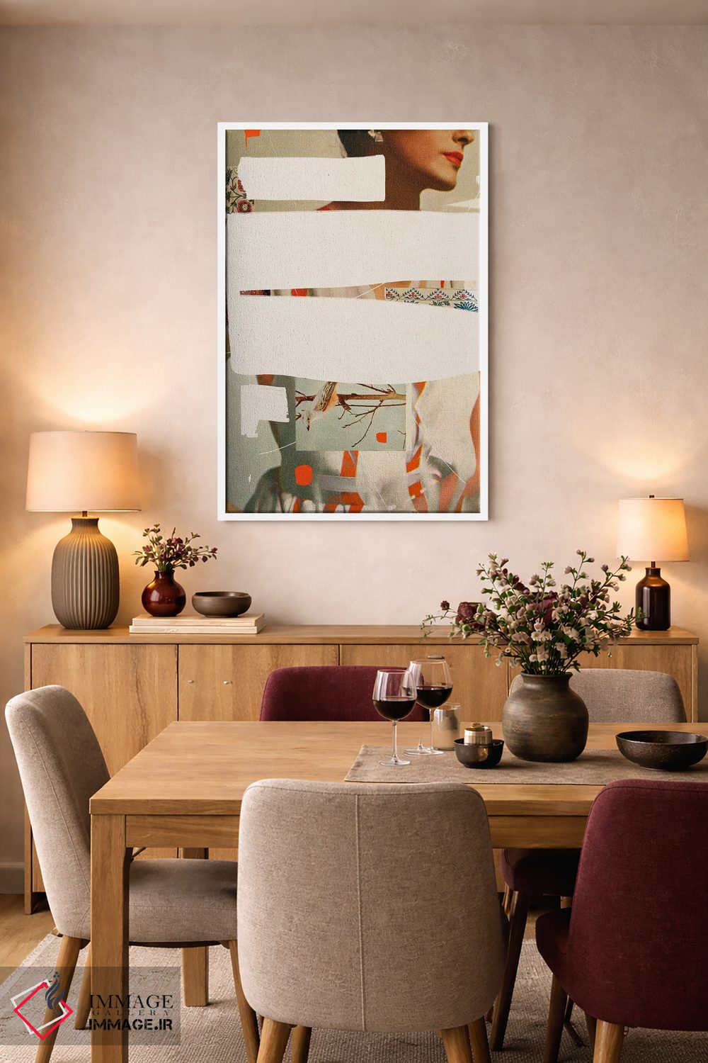 براساس پالت گرم اثر، قاب بلوط روشن (چوبی) پیشنهاد اول است و استخوانی ملایم مکمل. برای سفارشهای پروژهای با ابعاد و قابهای اختصاصی با ایماژ در تماس باشید.