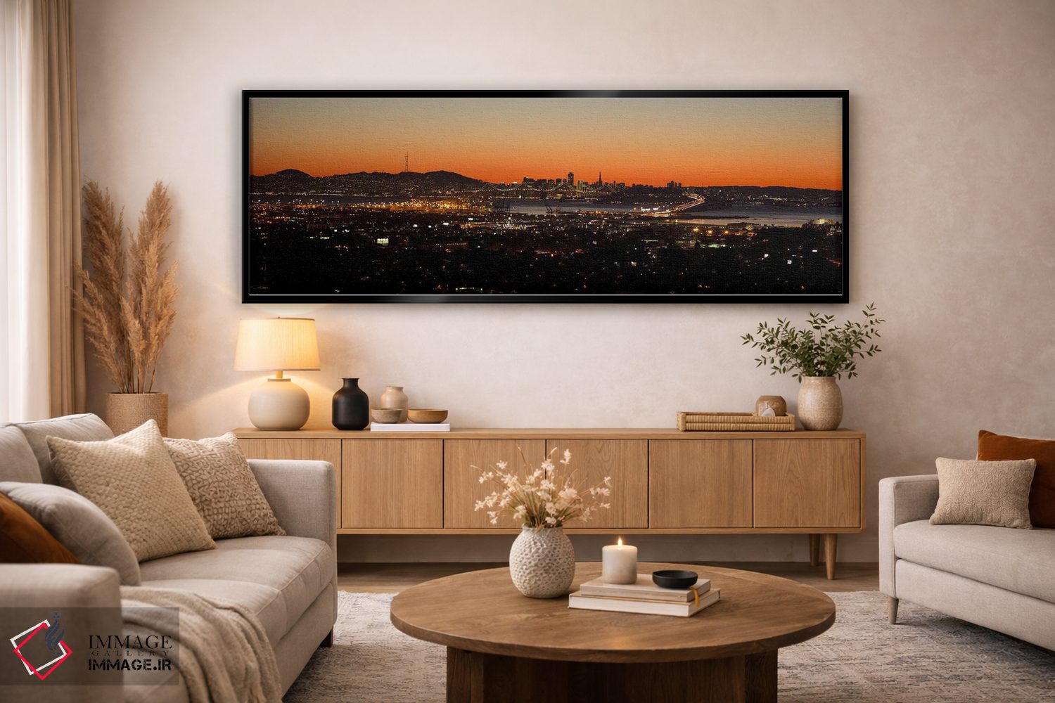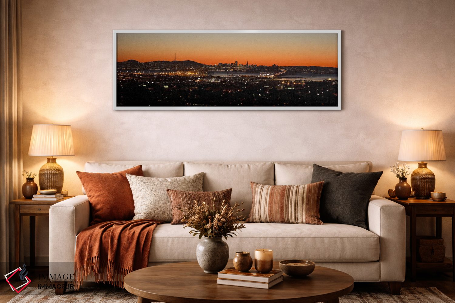 در یک جمله، «Oakland، San Francisco Bay، San Francisco، California، USA"—"نمای شهری در غروب، اوکلند، خلیج سانفرانسیسکو، کالیفرنیا، ایالات متحده"» اثرِ «پانورامیک ایمجز (استودیو عکاسی عریض)» اتاق را جمعوجورتر و مرتبتر نشان میدهد؛ برای کنار کتابخانه یا میز کار پیشنهاد میشود. با مبلمان خنثی، تضاد دلنشینی میسازد.