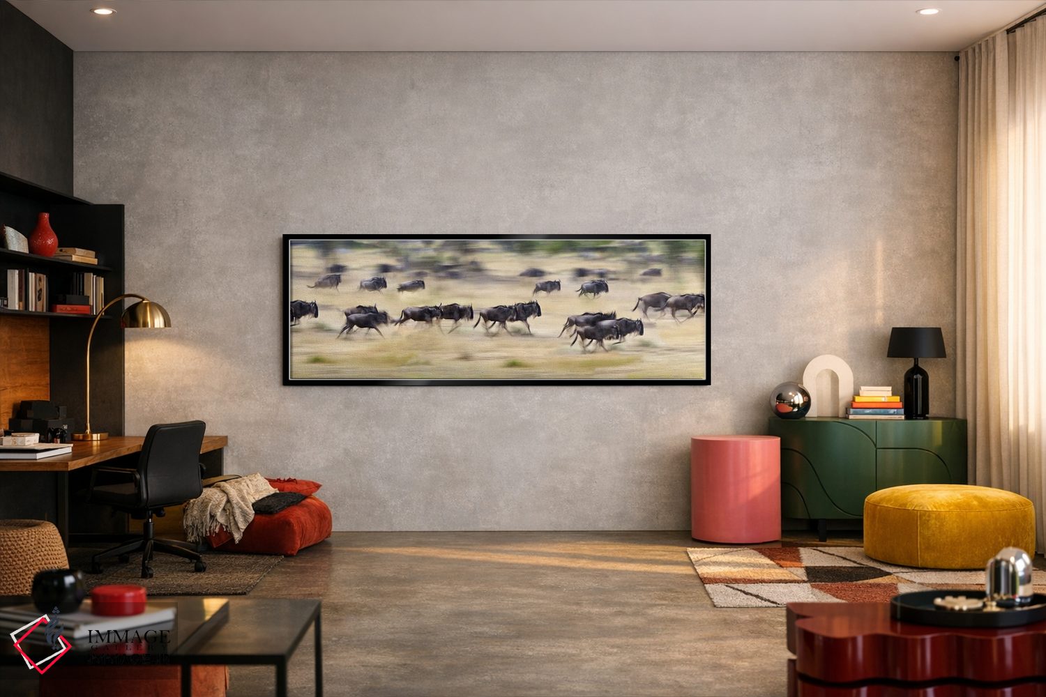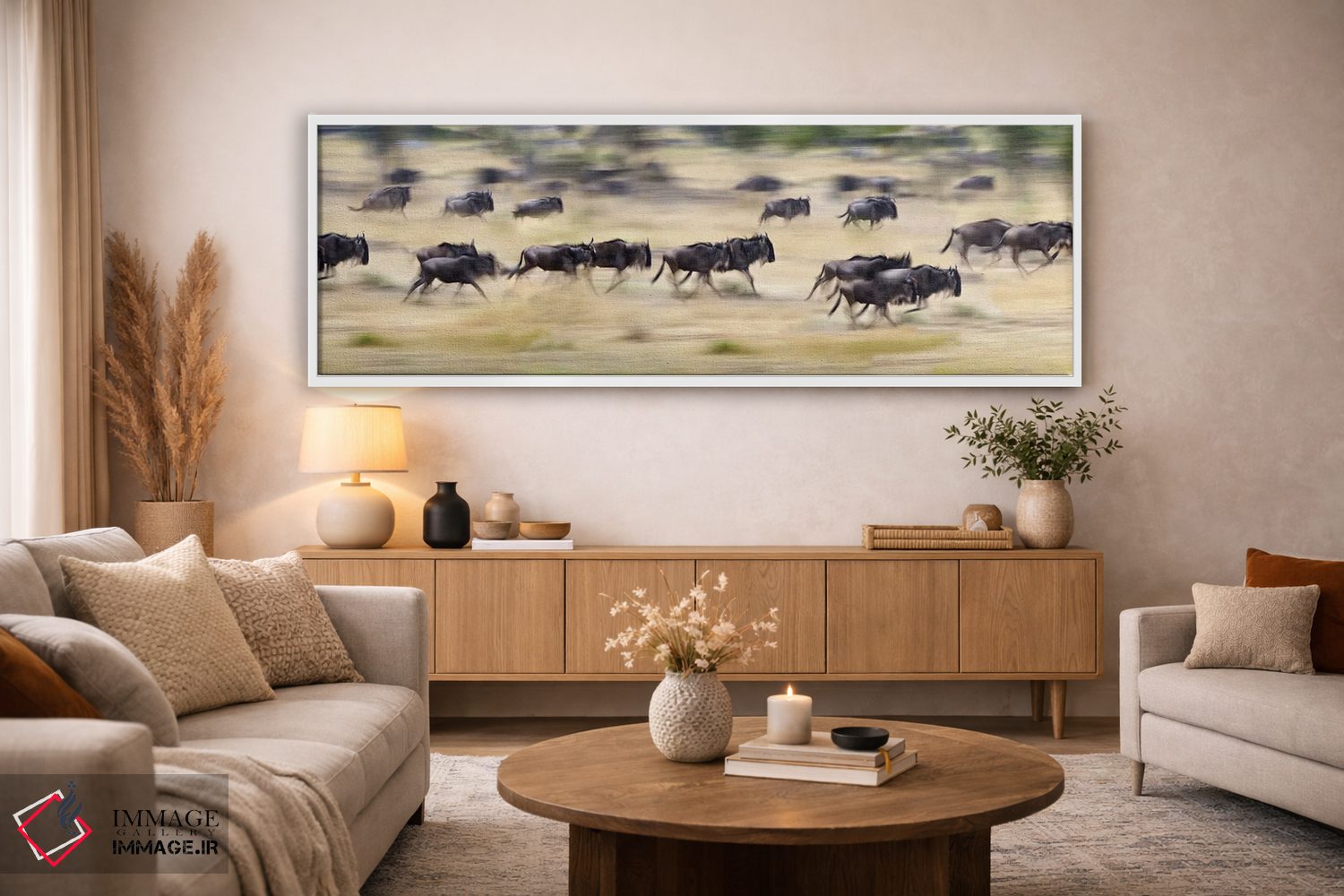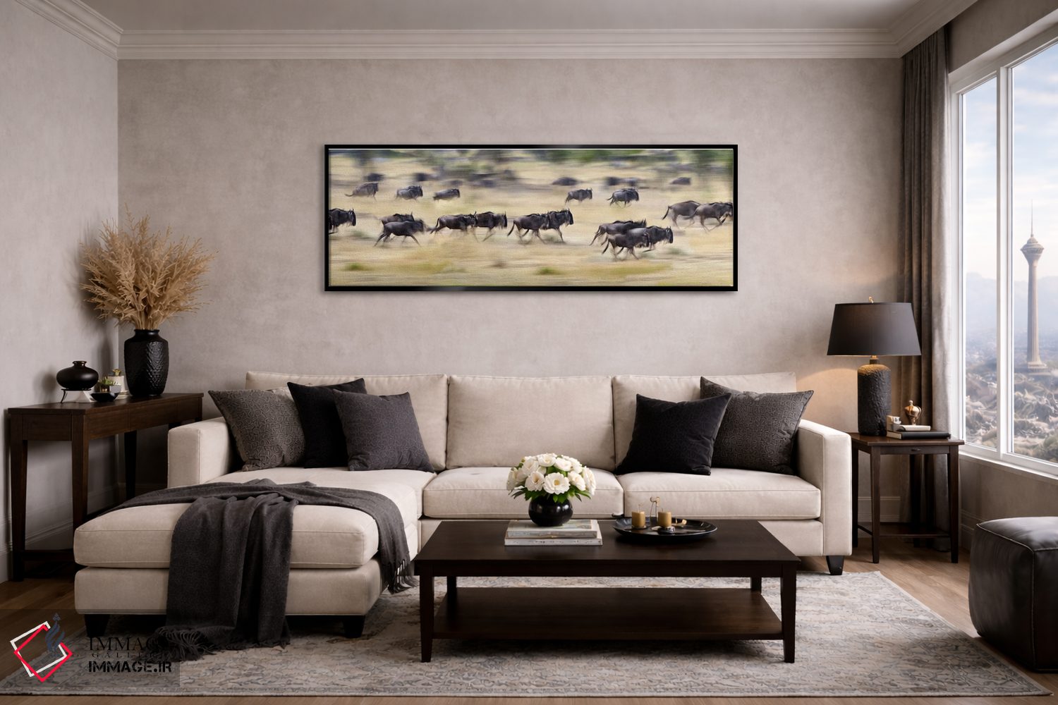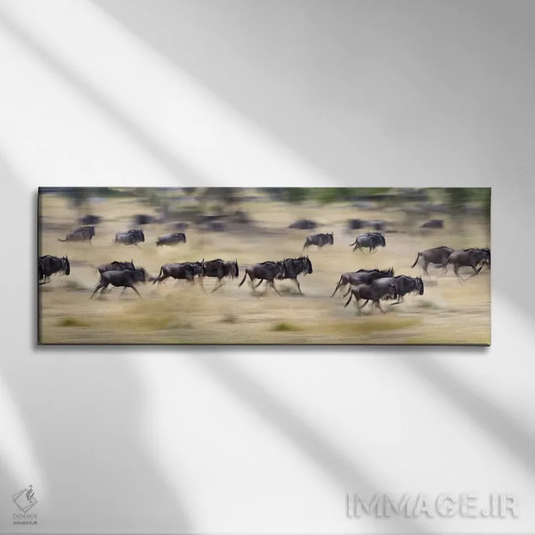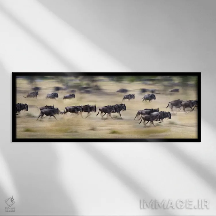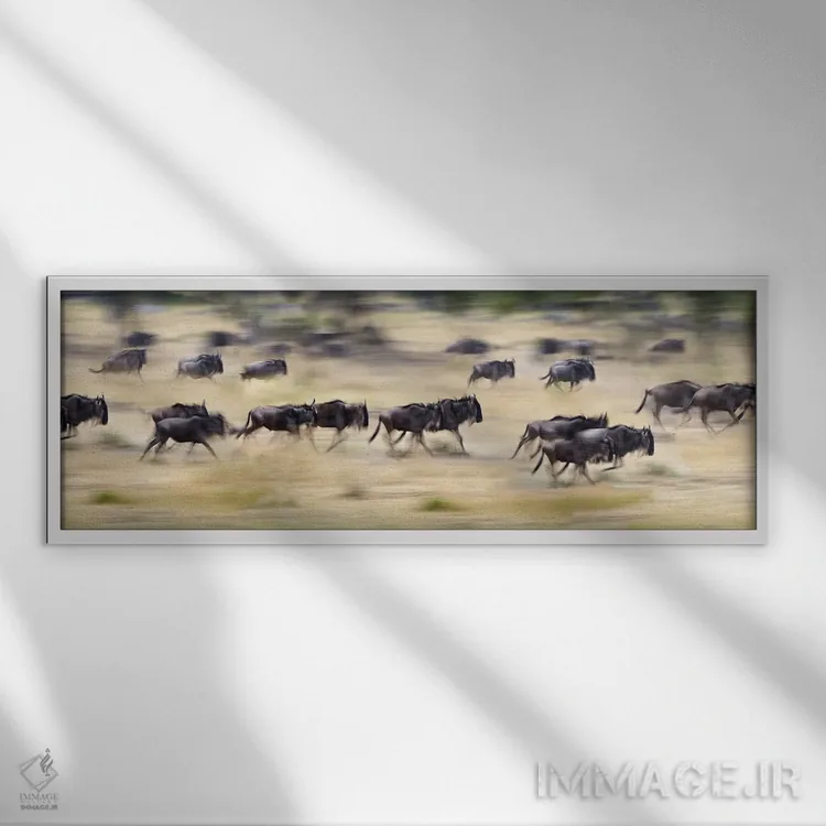 در این اثر، «Tanzania"—"گلهای از گاوهای وحشی در حال دویدن در یک مزرعه، تانزانیا"» اثرِ «پانورامیک ایمجز (استودیو عکاسی عریض)» به چیدمان، عمق و وقار میدهد؛ برای دکورهایی که بافت و جزئیات در آن مهم است پیشنهاد میشود. برای پروژههای طراحی داخلی هم گزینهای قابل اتکاست.
