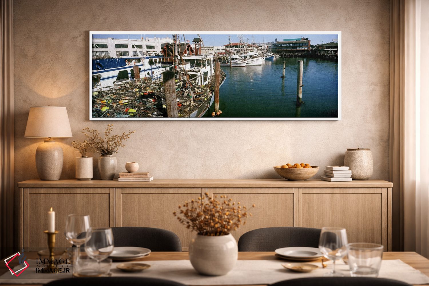 در نگاه اول، «قایقهای ماهیگیری در اسکله، اسکله ماهیگیران، سانفرانسیسکو، کالیفرنیا، ایالات متحده» اثرِ «پانورامیک ایمجز (استودیو عکاسی عریض)» حس گالریوار را بیسروصدا وارد خانه میکند؛ برای دکورهایی که بافت و جزئیات در آن مهم است پیشنهاد میشود. اگر دنبال زیباییِ بیادعا هستید، این اثر درست مینشیند.