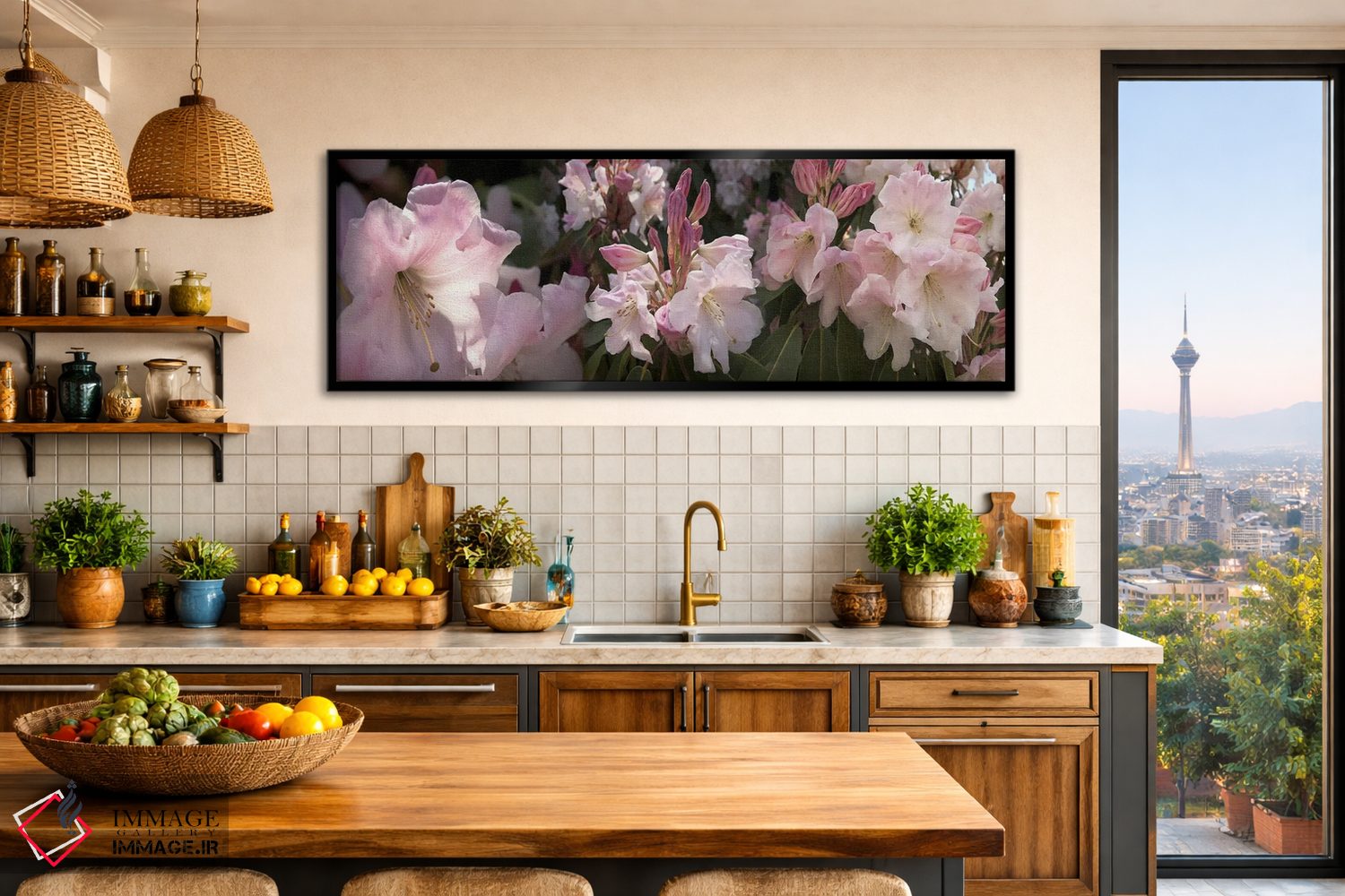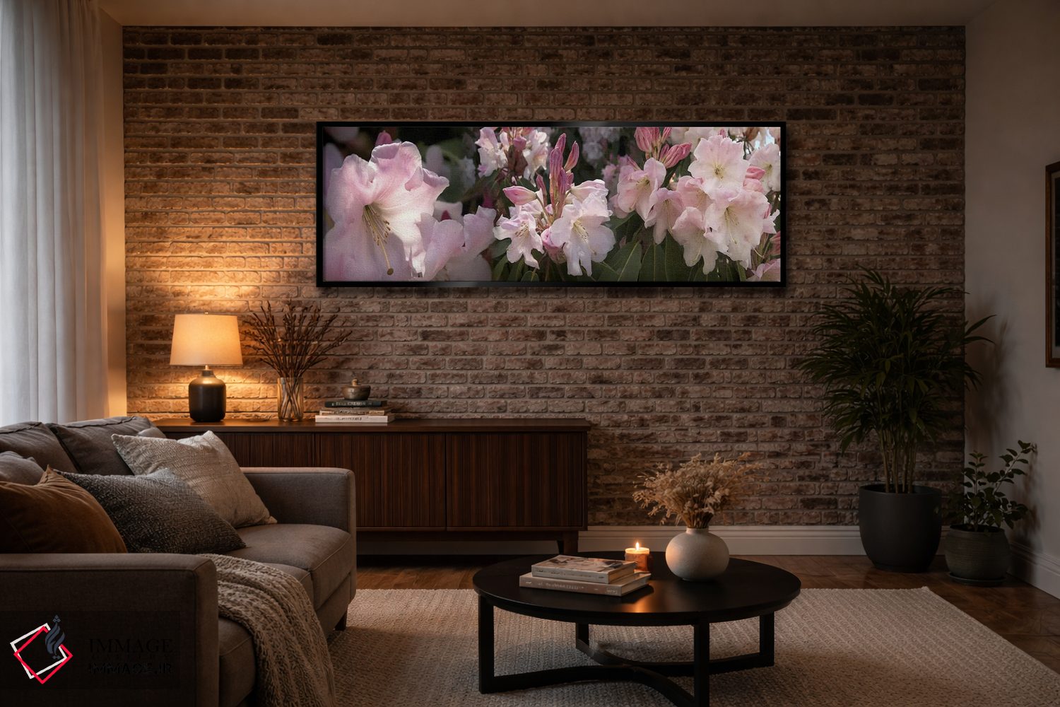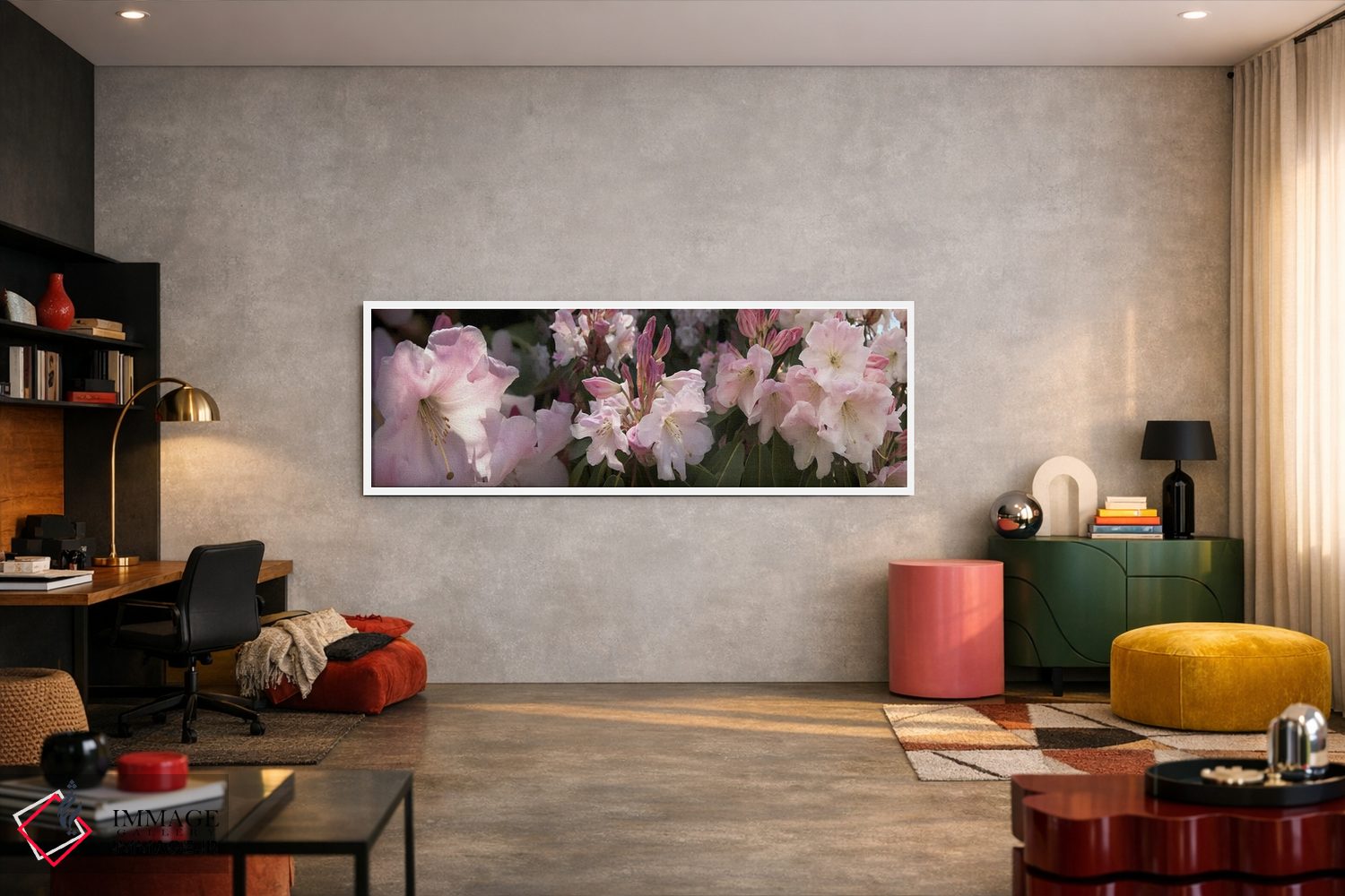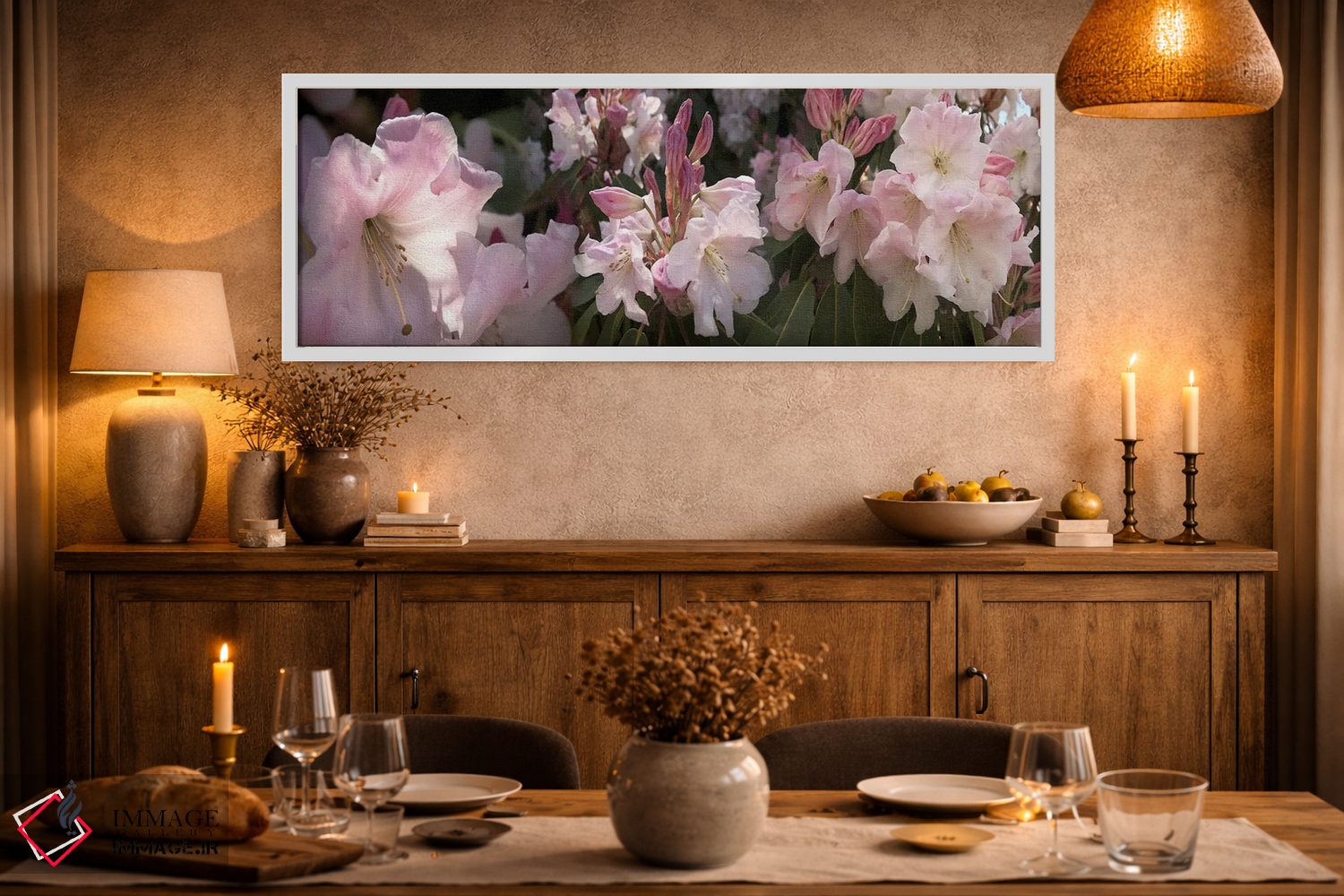 برای خانههایی که به زیباییِ آرام علاقه دارند، «تصاویر متعدد از گلهای رودودندرون صورتی» اثرِ «پانورامیک ایمجز (استودیو عکاسی عریض)» اتاق را جمعوجورتر و مرتبتر نشان میدهد؛ برای خانههایی که به هماهنگی رنگها اهمیت میدهند پیشنهاد میشود. به فضا حس «گالری خانگی» میدهد، بدون اینکه اغراق کند.