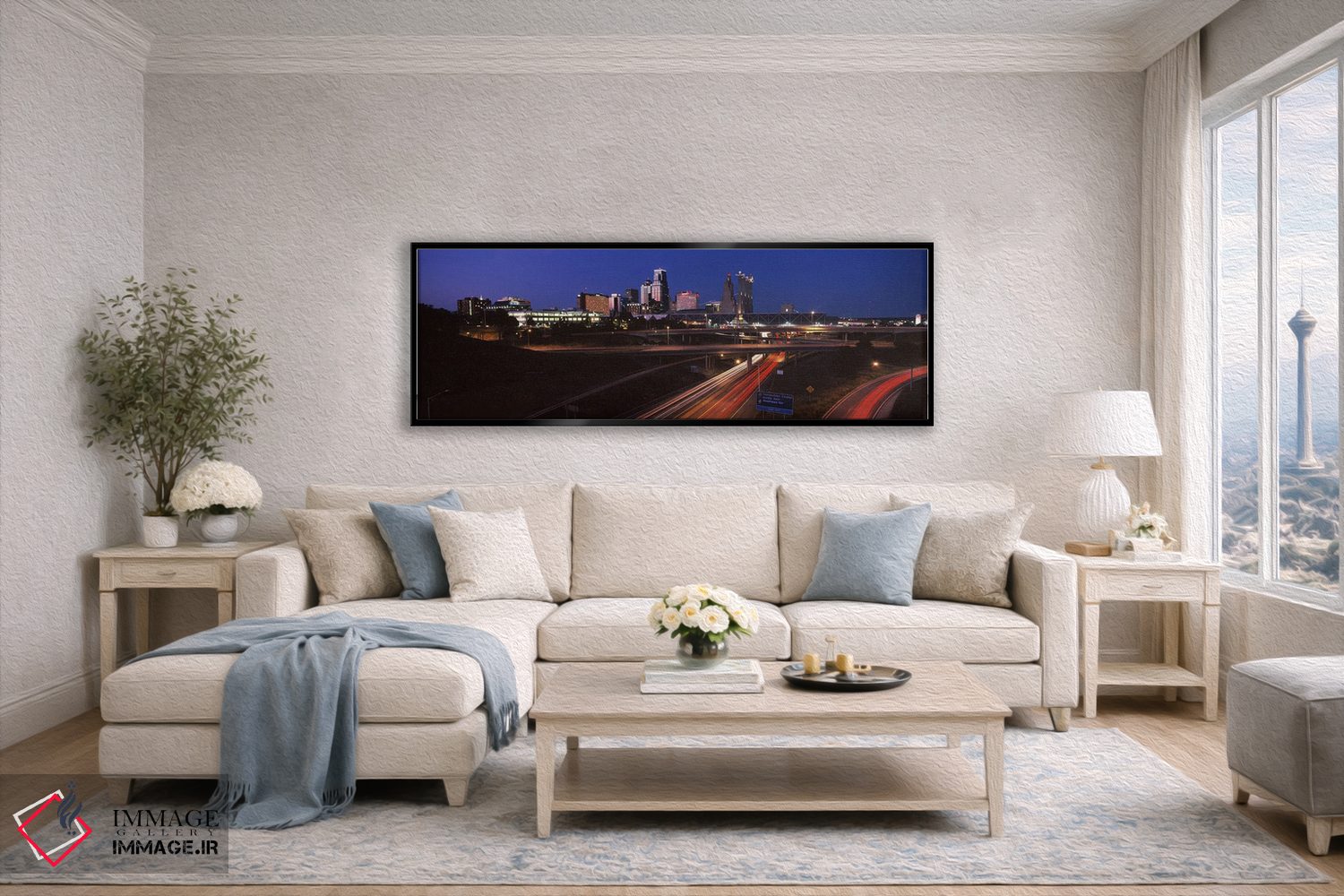 وقتی چیدمان را با دقت میچینید، «تقاطع بزرگراه و افق شهری در غروب، کانزاسسیتی، میزوری، ایالات متحده آمریکا» اثرِ «پانورامیک ایمجز (استودیو عکاسی عریض)» فضا را روشنتر و زندهتر نشان میدهد؛ برای فضاهایی با نور طبیعی پیشنهاد میشود. در کنار گیاهان آپارتمانی هم جلوهٔ لطیفی پیدا میکند.