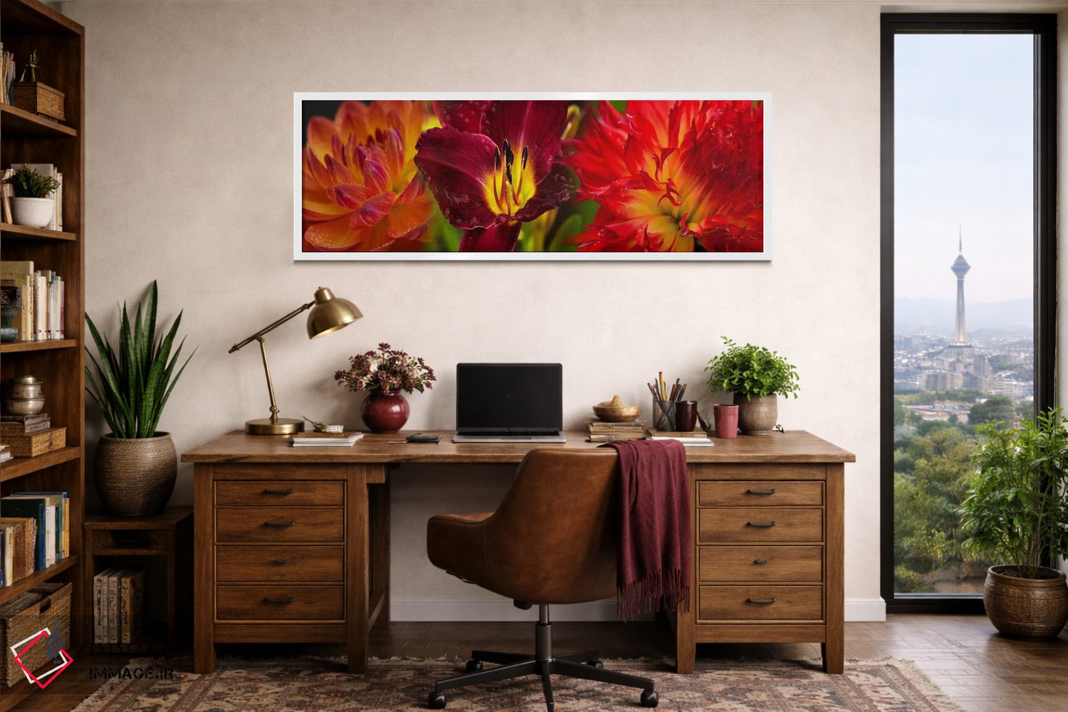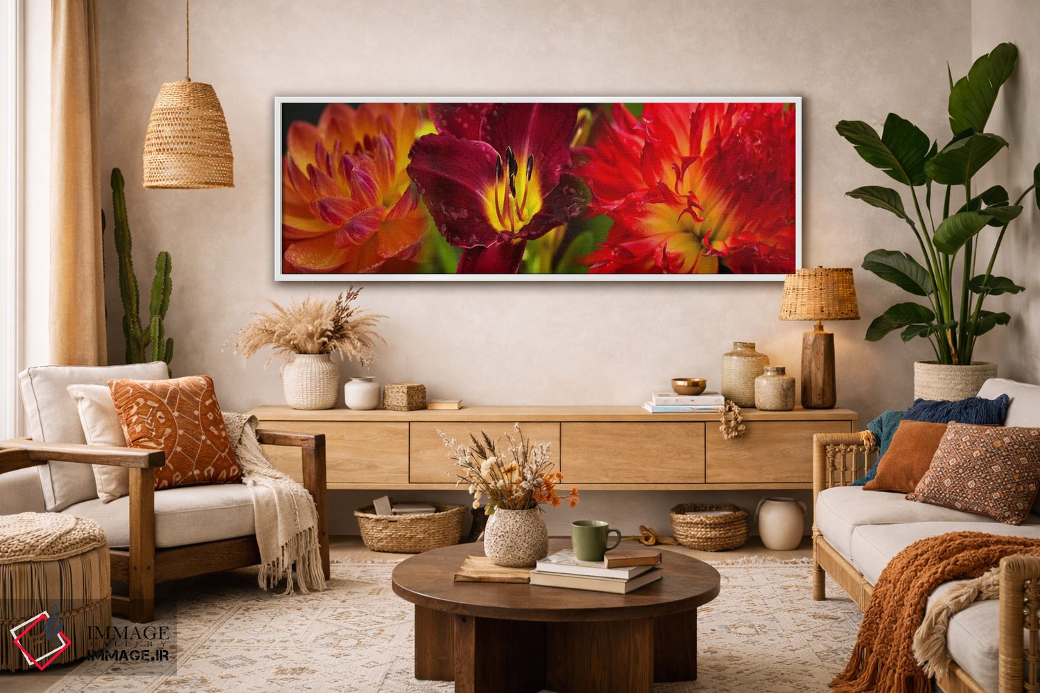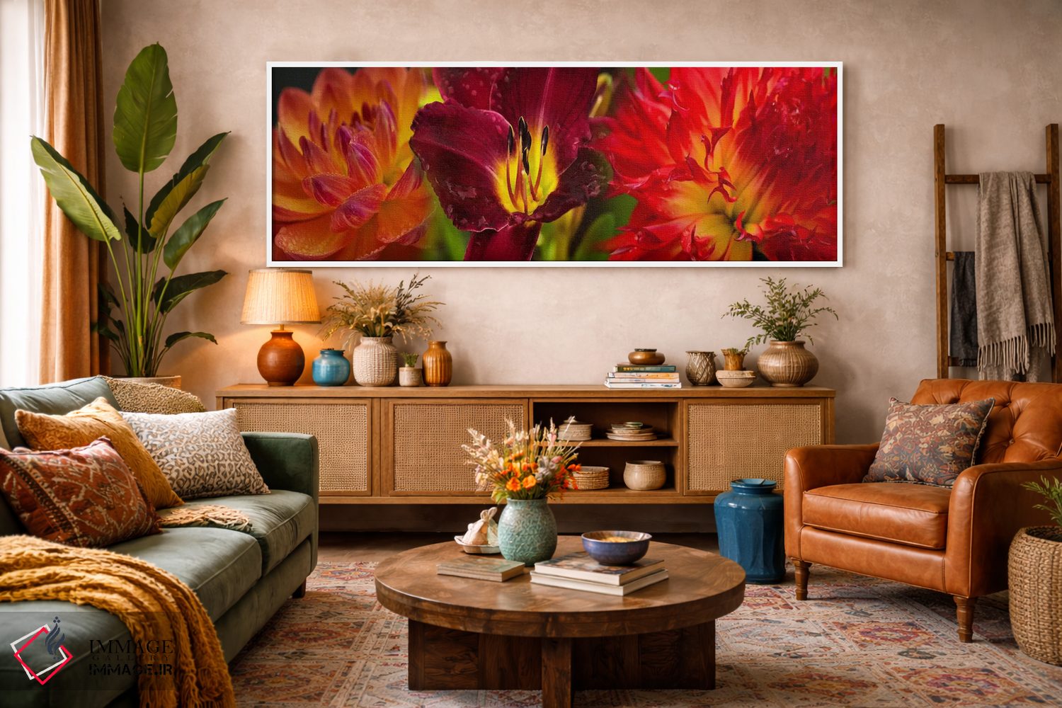 براساس پالت ترکیبی اثر، قاب تیک گرم (چوبی) پیشنهاد اول است و مشکی مات (فریم متوسط) مکمل. برای سفارشهای پروژهای با ابعاد و قابهای اختصاصی با ایماژ در تماس باشید.