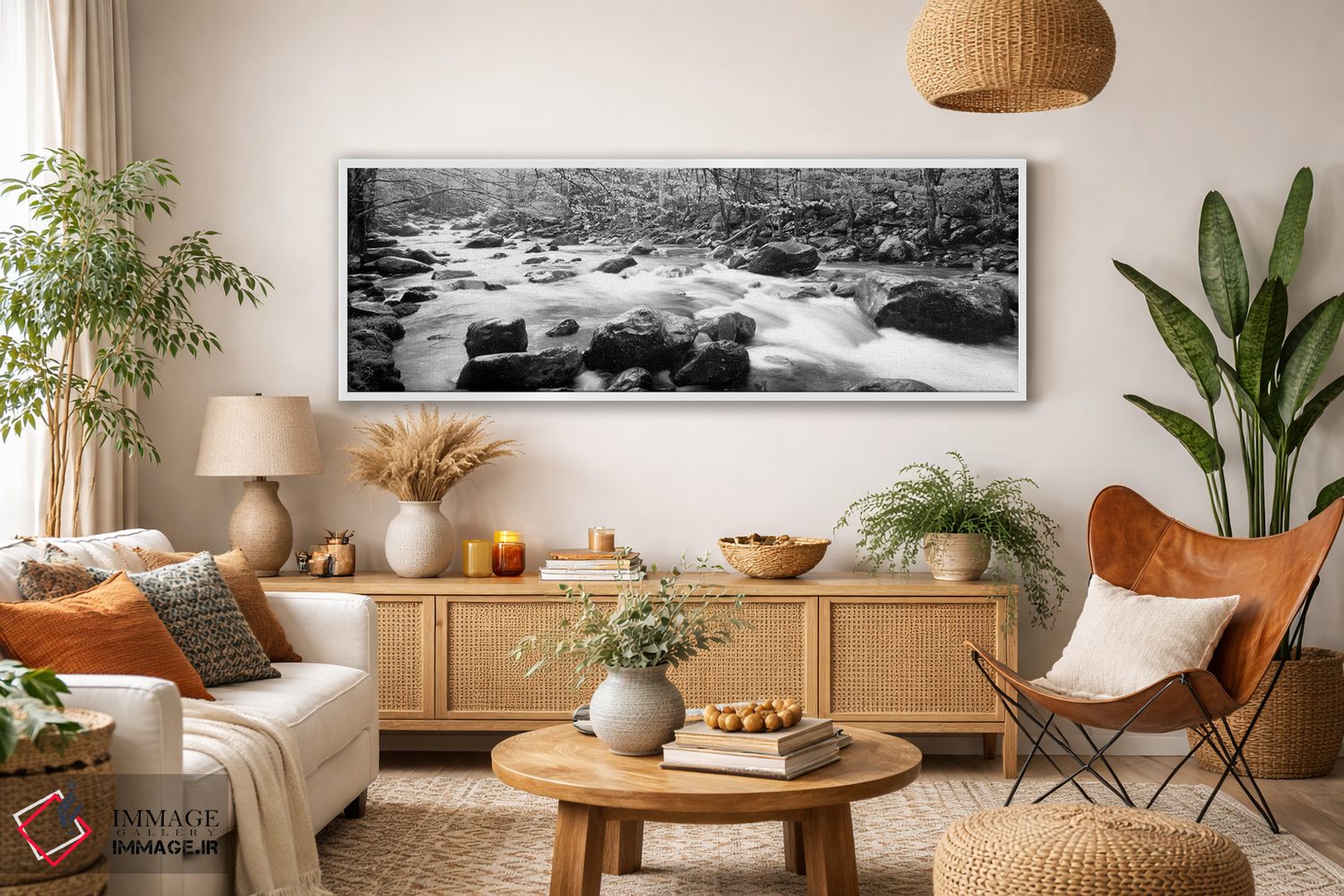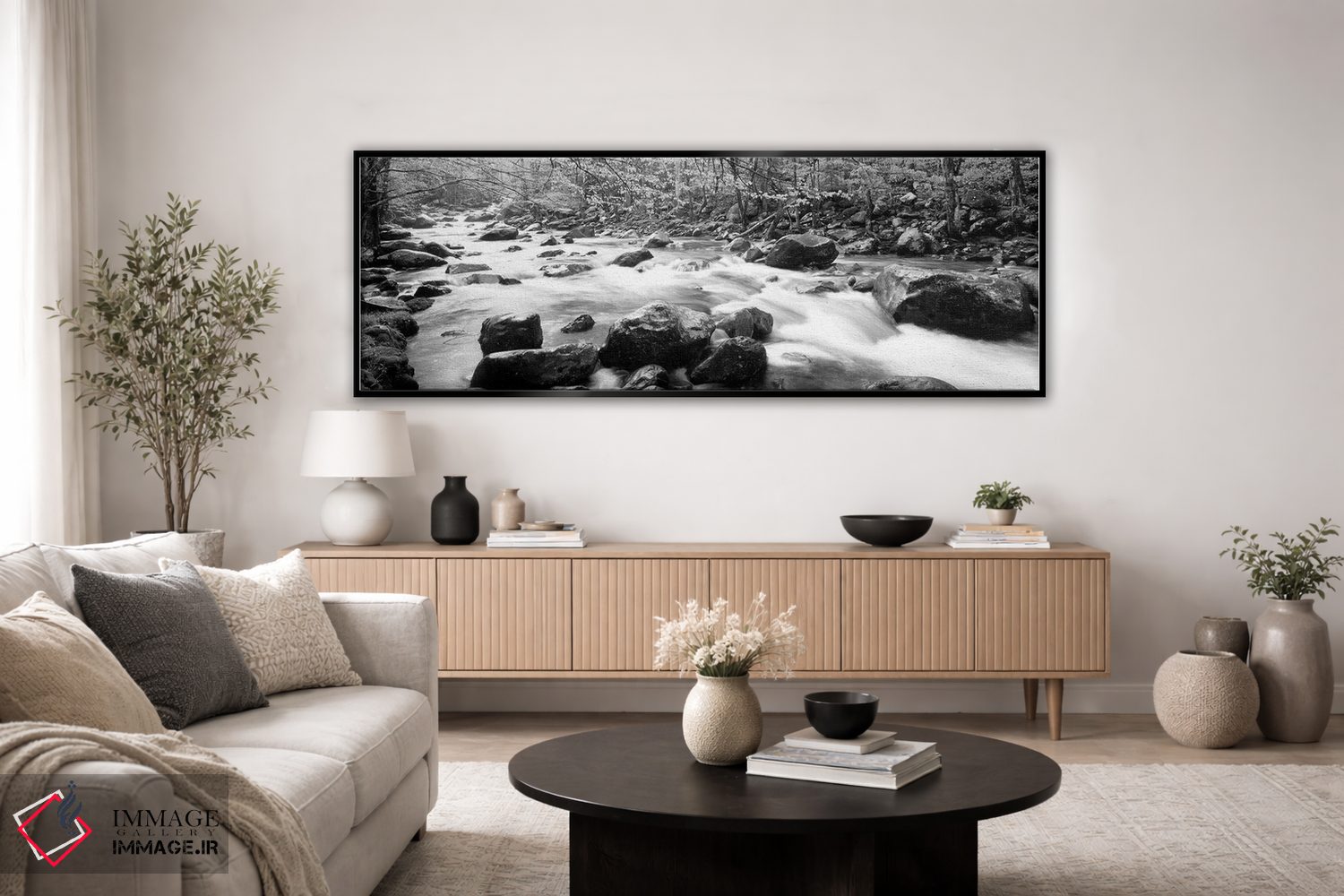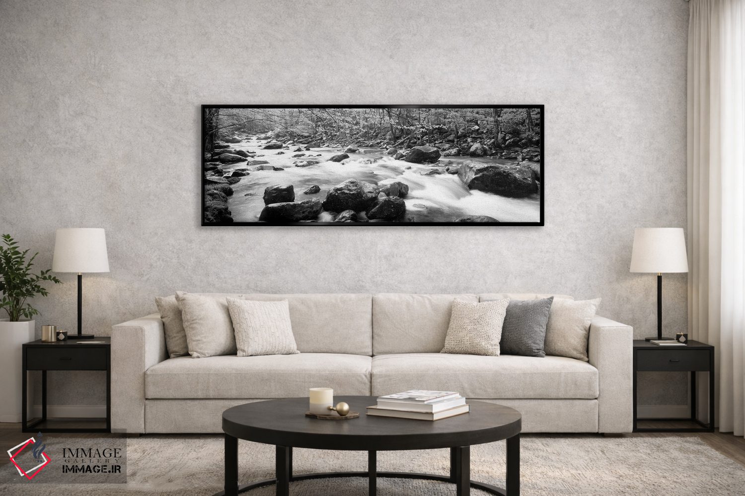 در «Great Smoky Mountains National Park، Tennessee، USA"—"رودخانه کوچک پیجئون، پارک ملی کوههای گریٹ اسموکی، تنسی، ایالات متحده"»، اثرِ «پانورامیک ایمجز (استودیو عکاسی عریض)» این اثر را با زبان سیاهوسفید ارائه میکند؛ برای دکورهای کلاسیک—مدرن یک انتخاب مطمئن و هماهنگپذیر است.