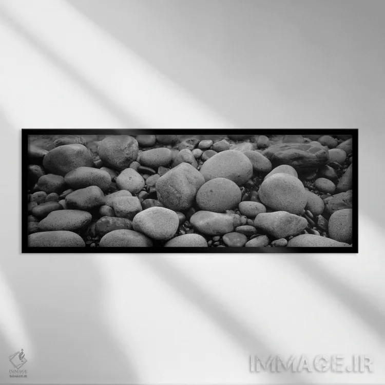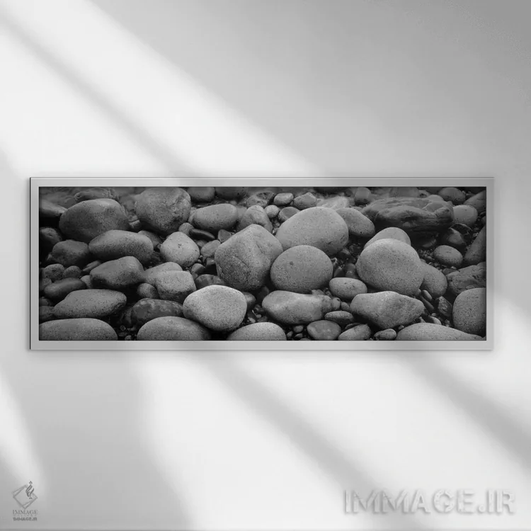 «Acadia National Park، Maine، USA"—"نمای نزدیک از سنگها، پارک ملی آکادیا، مین، ایالات متحده"» اثرِ «پانورامیک ایمجز (استودیو عکاسی عریض)» با بیان سیاهوسفید، کنار دیوارهای روشن و قابهای ساده بسیار خوشفرم دیده میشود؛ موضوعِ این اثر هم خوانا میماند.