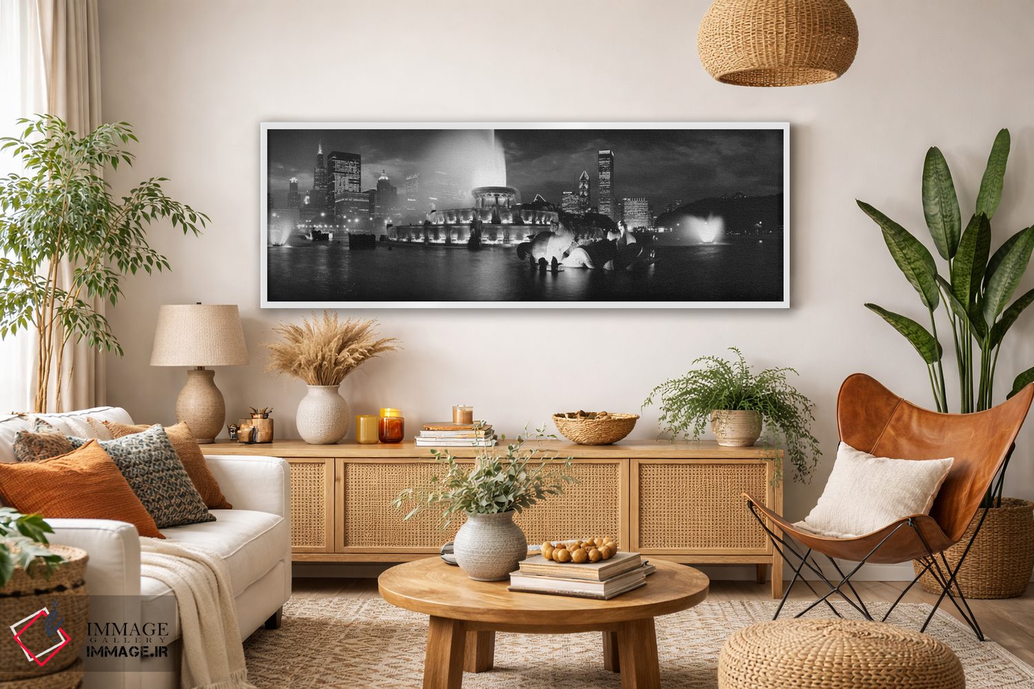 برای فضاهای مینیمال، «Grant Park، Chicago، Illinois، USA"—"آبنما باکینگهام روشن شده به صورت سیاه و سفید، پارک گرانت، شیکاگو، ایلینوی، ایالات متحده"» اثرِ «پانورامیک ایمجز (استودیو عکاسی عریض)» در کنار بتن، فلز یا چوب عالی بنشیند؛ برای استودیوهای طراحی انتخابی خوشسلیقه است. برای دیوار گالری هم گزینهٔ خوبیست.