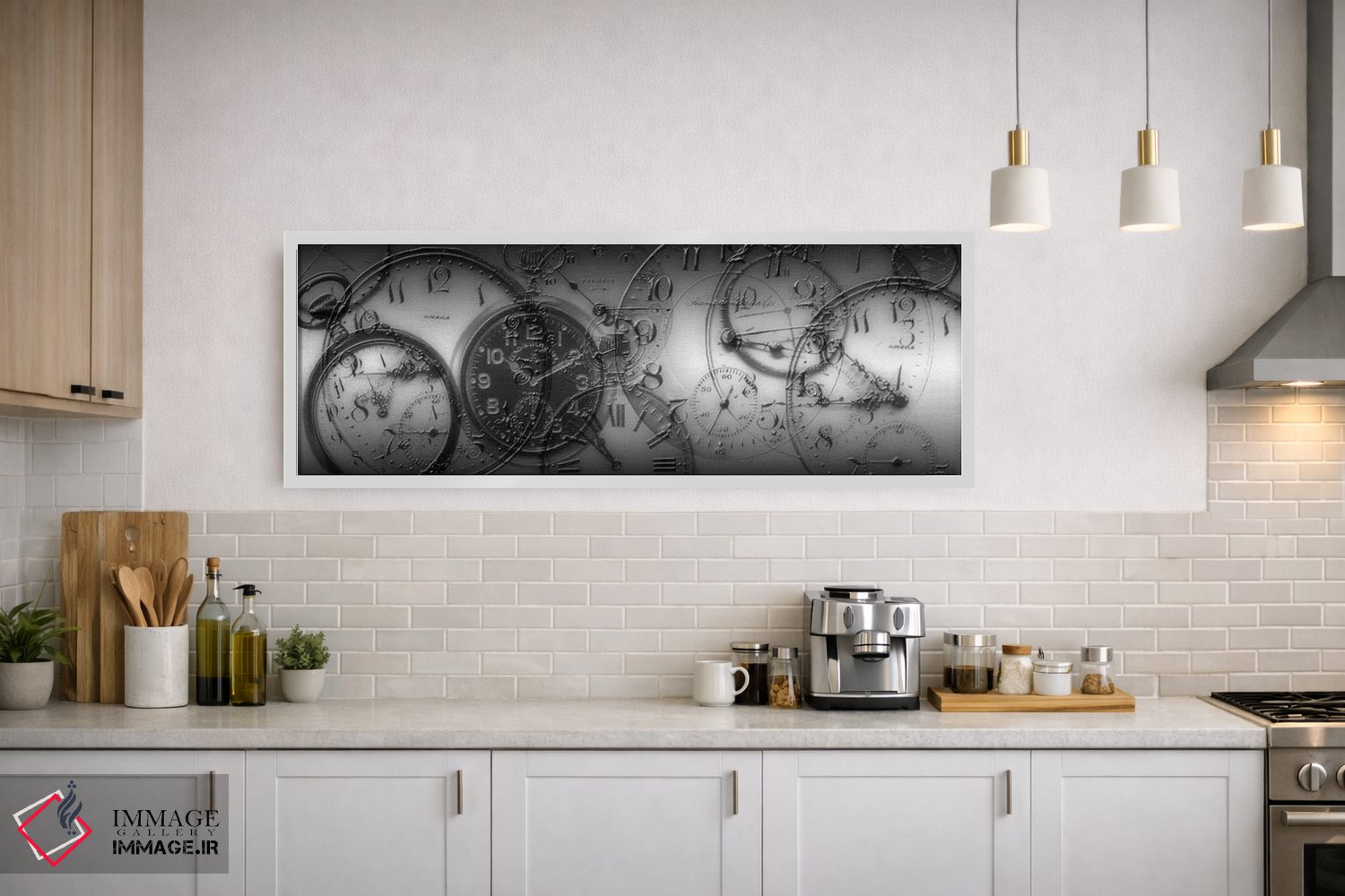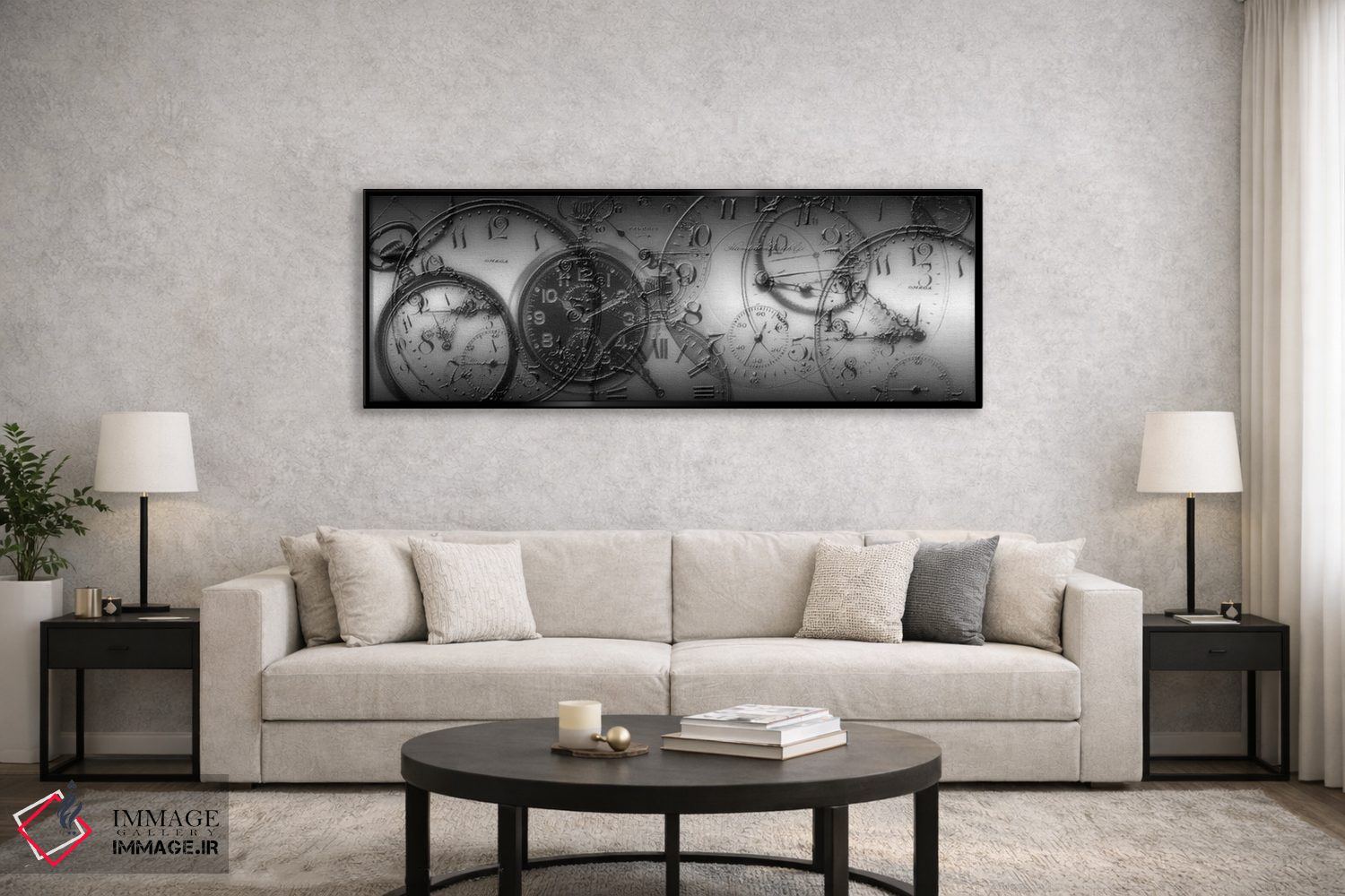 «مونتاژ ساعت جیبی قدیمی در سیاه و سفید» اثرِ «پانورامیک ایمجز (استودیو عکاسی عریض)» با بیان سیاهوسفید، کنار دیوارهای روشن و قابهای ساده بسیار خوشفرم دیده میشود؛ موضوعِ این اثر هم خوانا میماند.